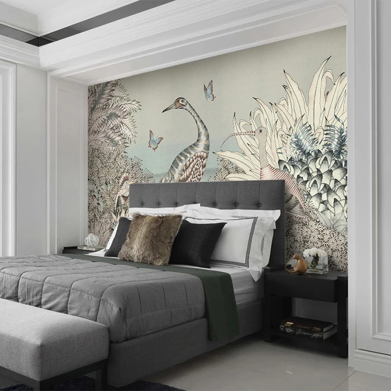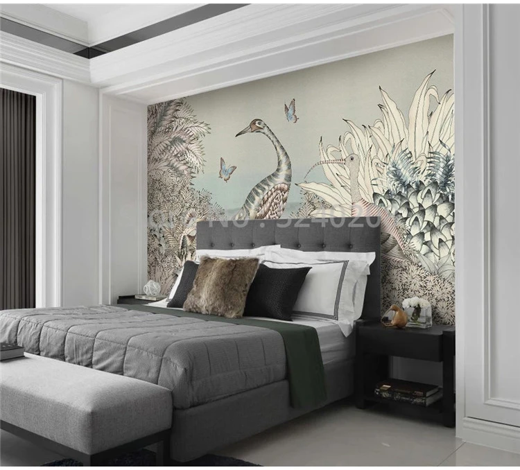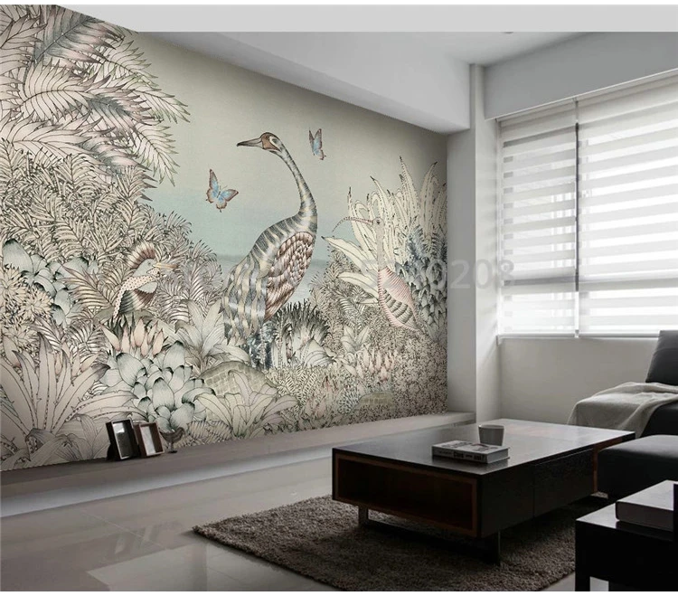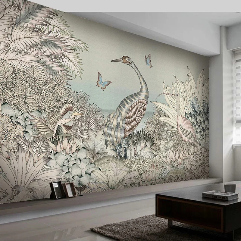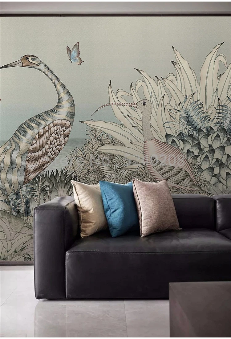 Настенные обои на заказ, ретро, тропический лес, серый журавль, птица, Бабочка, фреска, гостиная, телевизор, диван, 3D самоклеющиеся наклейки