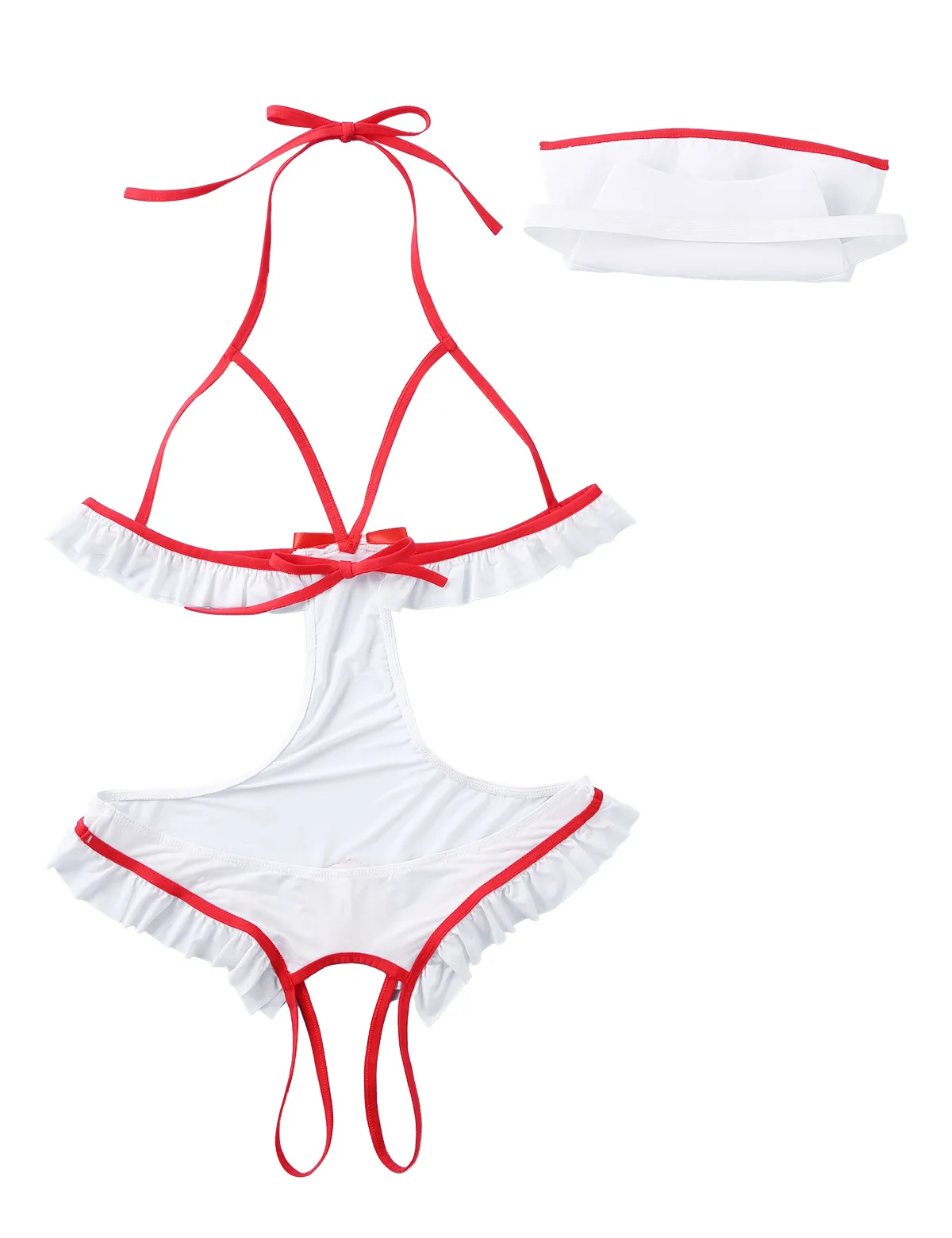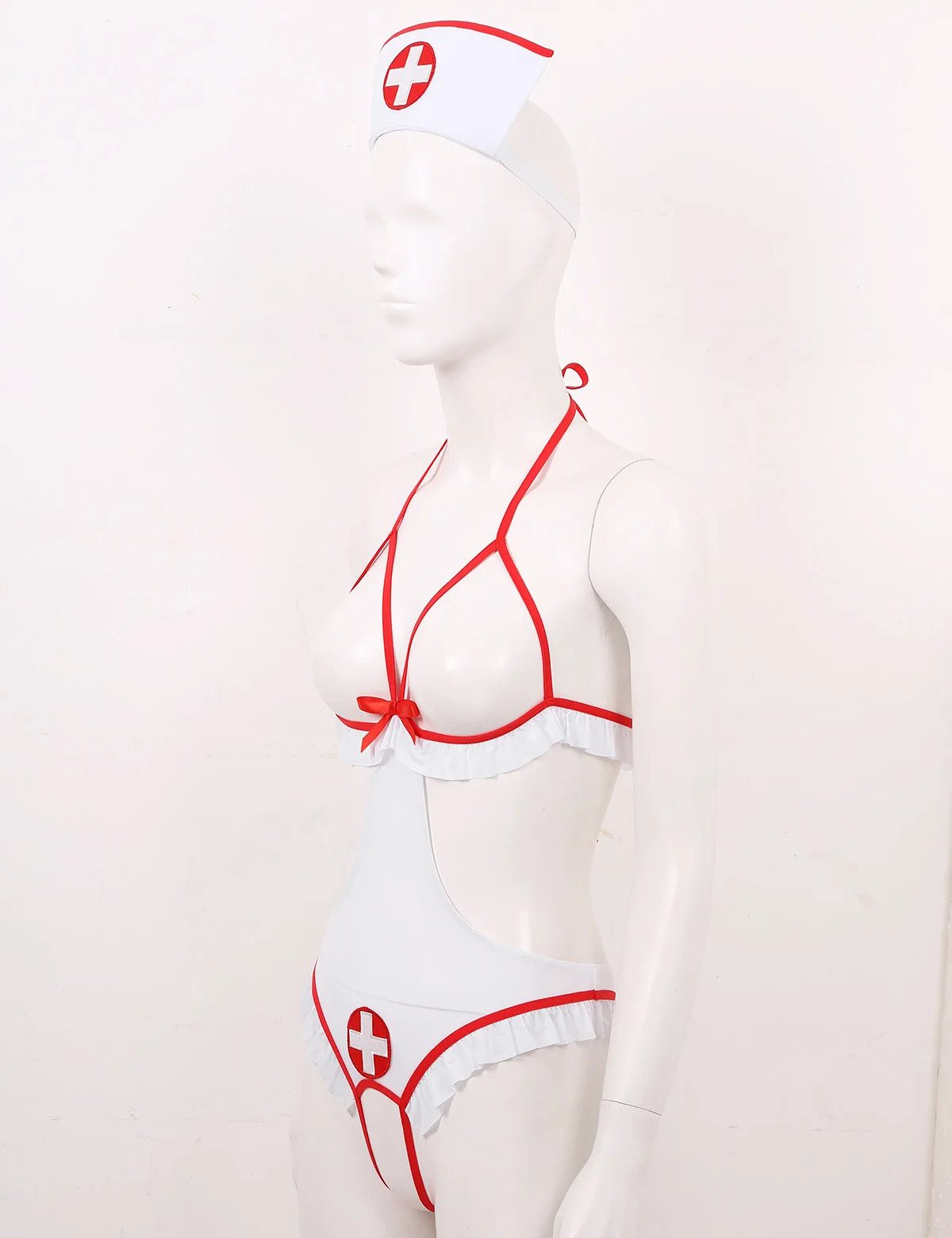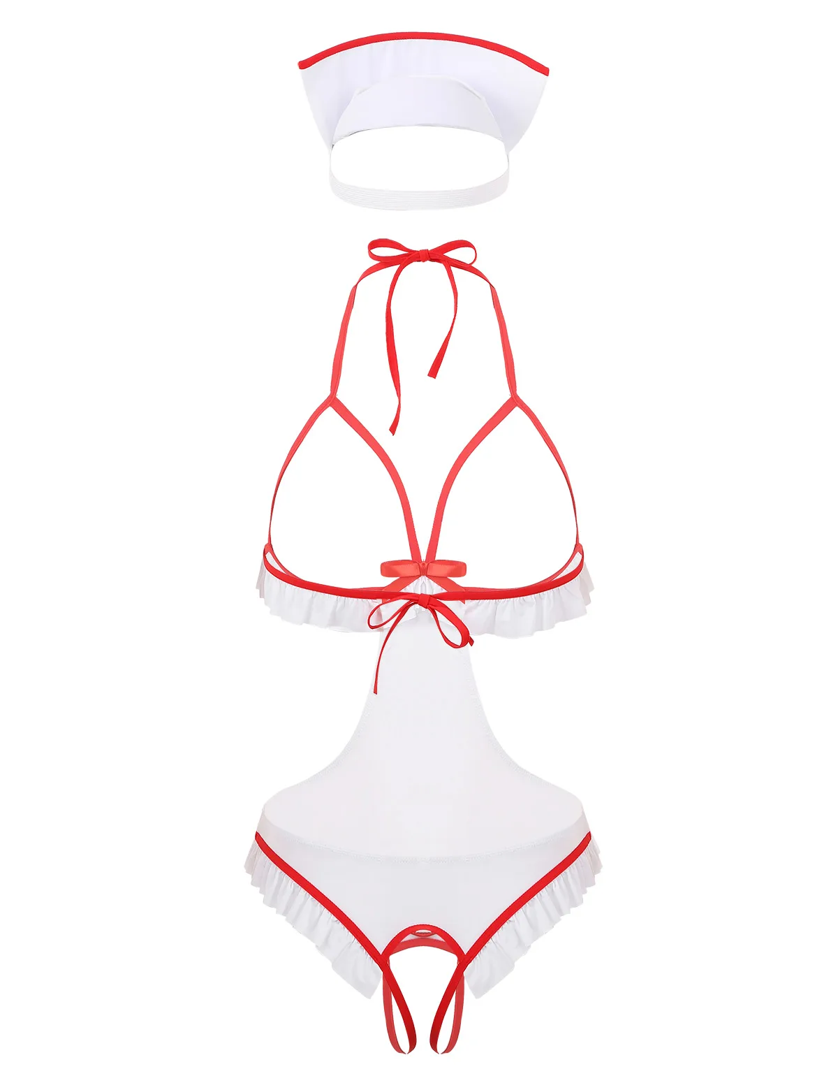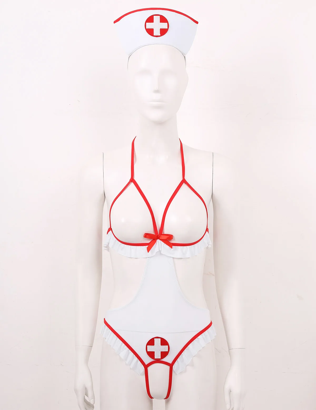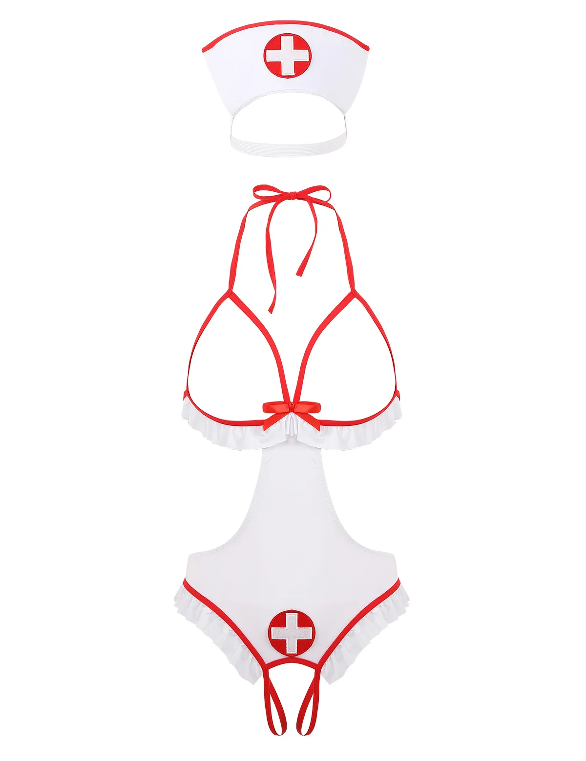 Особенности: Комплект женского нижнего белья костюм медсестры для косплей для ролевых игр, лестный и привлекательный. Воротник-халтер, модель открытые чашечки и вырез спереди с оборками ниже бюста, без спинки с завязками на бретелях сзади, с вырезом и оборками по ногам. В паре с повязкой на голову с нашивкой Красного Креста. Легкая и дышащая ткань, хорошо тянется, супер мягкая и удобная в носке. Костюм вечерние, ночного клуба, косплей-вечеринки, ролевых игр, ночного белья и т. д. Перед покупкой внимательно ознакомьтесь с таблицей размеров, рекомендуется ручная стирка.