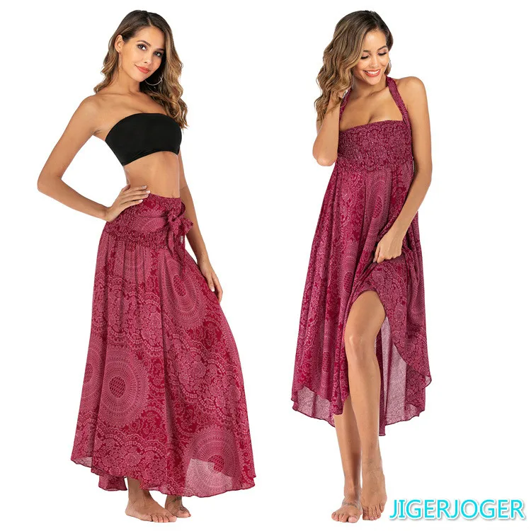 Женский комбинезон с цветочным принтом, оливковая и зеленая мандала, тайская юбка с лямкой через шею и цветочным принтом, пляжная юбка средней длины, размера плюс