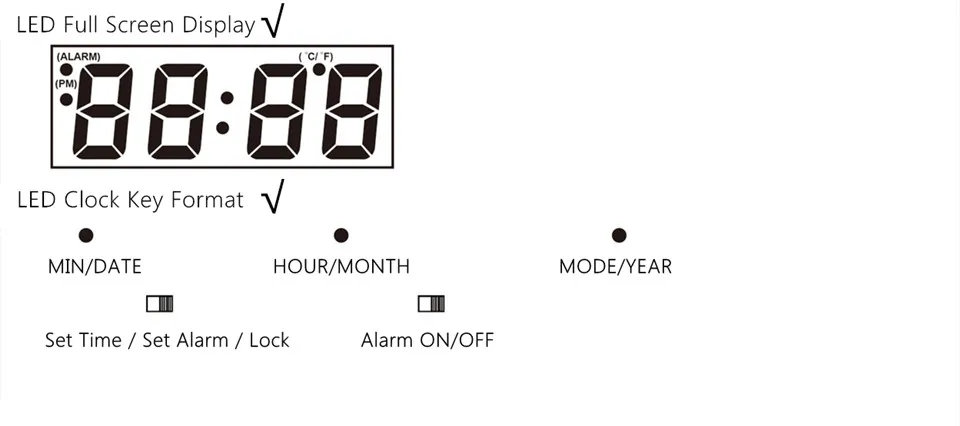 ● 4-битный светодиодный дисплей ● Функция времени: воспроизводит часы, минуты и может изменяться в течение 12/24 часов ● Функция даты: отображает день, месяц и год (с 2000 до 2099) ● Функция будильника: Переключите переключатель для установки будильника, вы можете установить ежедневный будильник и время повтора. ● Температурная Функция: может отображать и менять ℉/ ℃; Нормальный диапазон измерения-10 ℃ ~ 50 ℃, (14 ℉ ~ 122 ℉) ● Выбор режима: Нажмите часы/месяц, чтобы изменить три режима: dP-1, dP-2, dP-3 ● Энергосбережение: Нажмите кнопку MINI/DATE, чтобы выбрать функцию энергосбережения. (Включите отображение onSd, выключите отображение SD) ● Сласветильник: при 18:00 - 7:00 экран автоматически находится в слабосветильник щении. Яркость изменится по мере установки. ● Часы включают функцию защиты при отключении питания. ● Рабочая среда: 5 В, оба DC/AV могут подавать питание. (Резервная батарея 3 В) ● Все клавиши имеют звук. ● Рабочая температура ИС-10 ℃ - 50 ℃