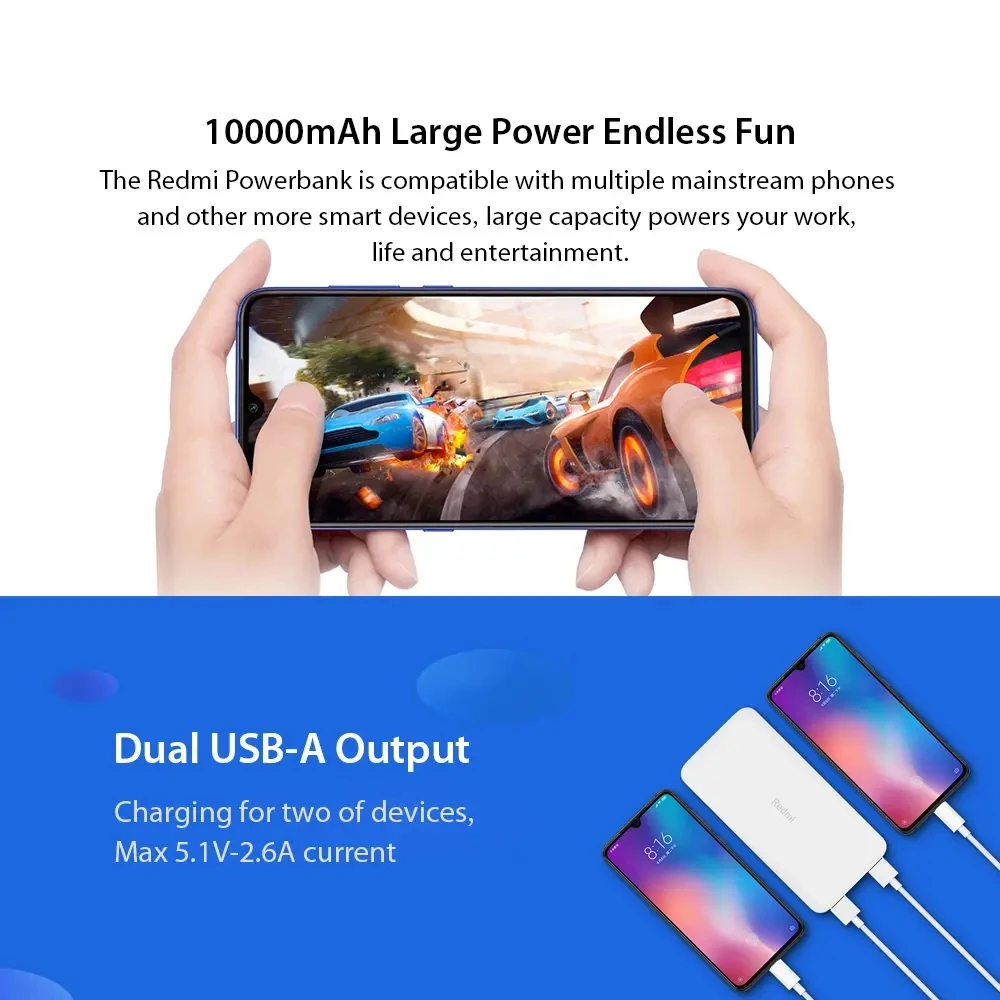 Внешний аккумулятор Xiaomi Redmi, 10000 мАч, 2 USB-входа, 10000 мАч, для iPhone, Huawei