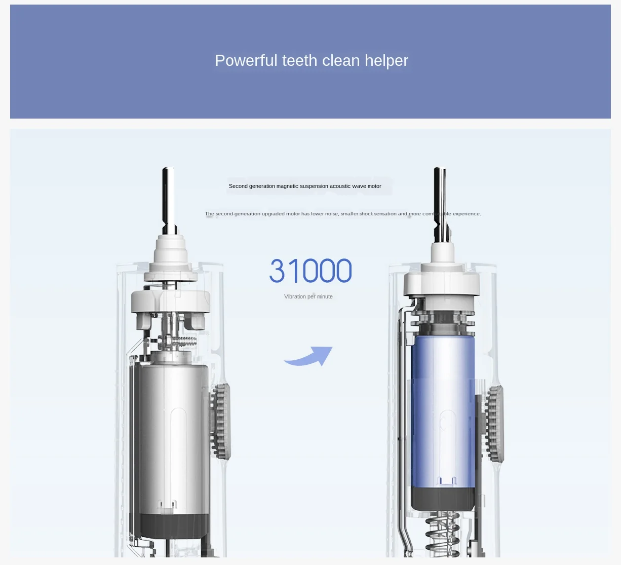 ● Высокая частота чистки: макс. 31000 раз/мин ● помогает улучшить научную привычку чистки: умно напоминайте о прочности чистки и автоматически уменьшает интенсивность вибрации. Минуты (рекомендуемый лучший период чистки) ● круглая головка для чистки + поверхность для дуговой чистки: Избегайте травм, глубокая очистка включает в себя мертвый уголок ● насадка для стерилизации от УФ-лучей 4 * ● водонепроницаемый уровень IPX7 всего тела для прямой стирки ● время автономной работы около 25 дней ● Время зарядки: 16 ч