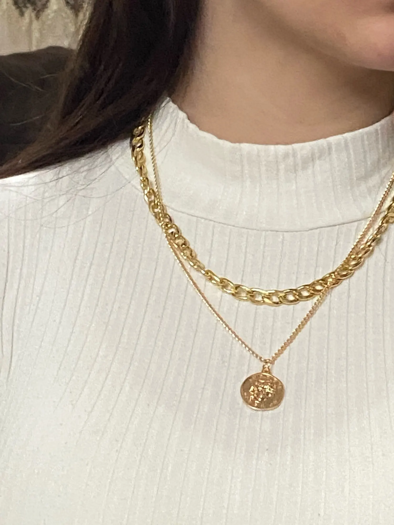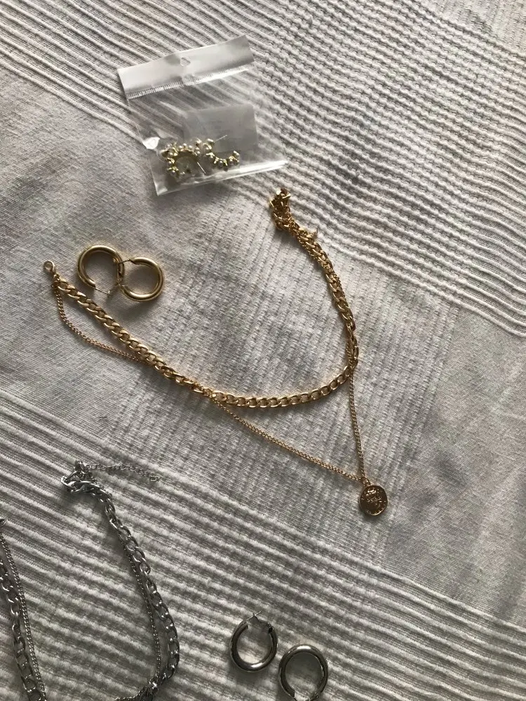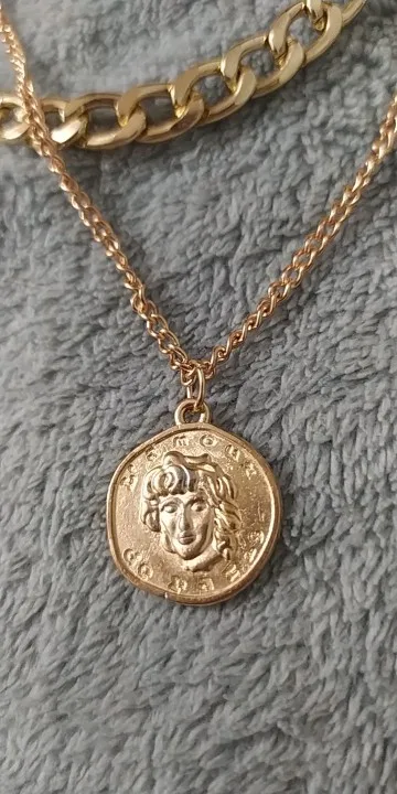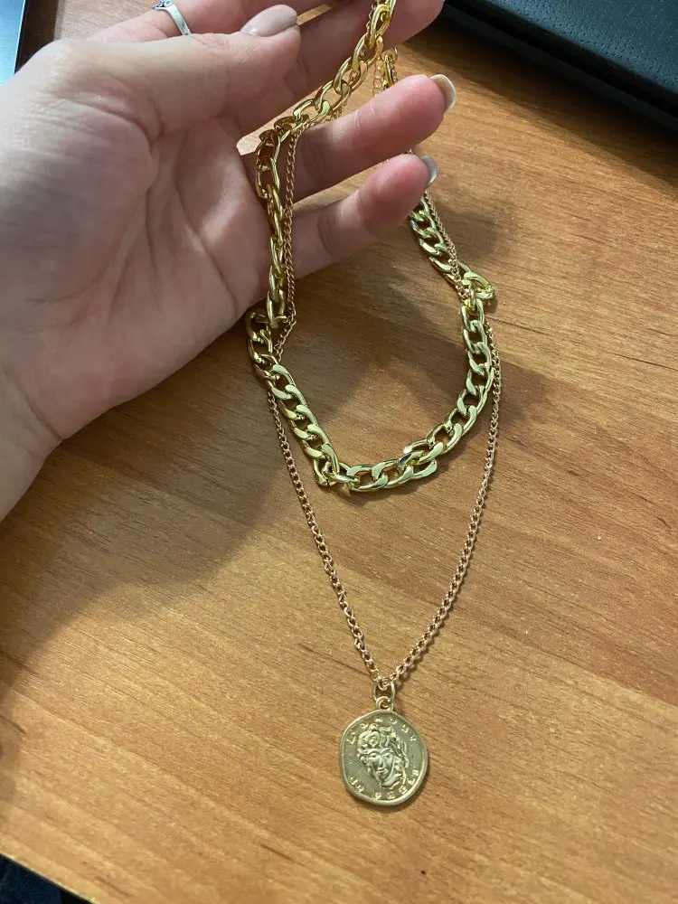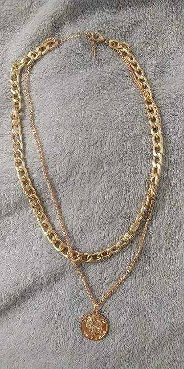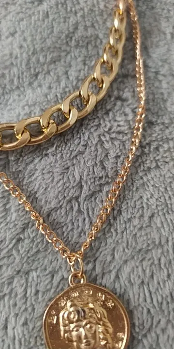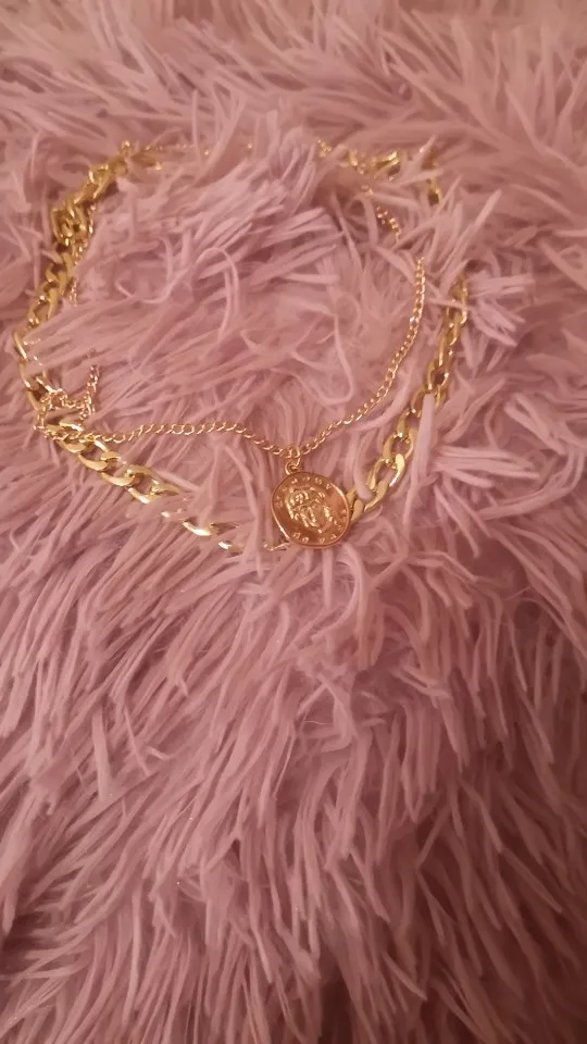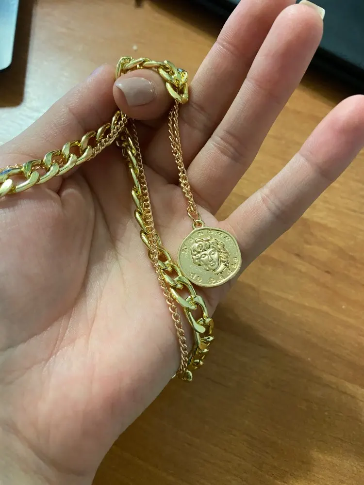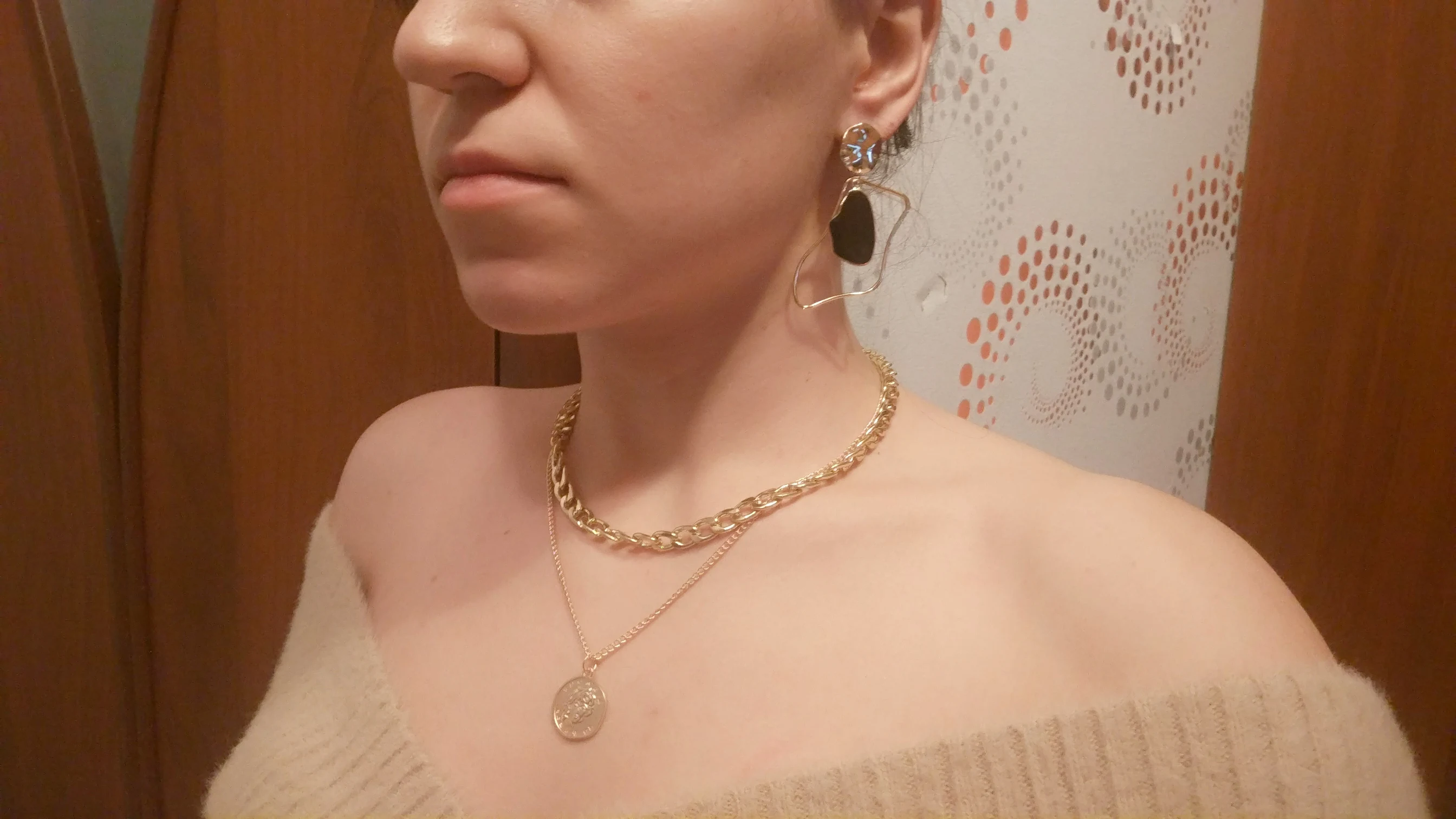 Очень приятное ожерелье, пришло за 2,5 недели в объединённом с другими посылками пакете. Две цепочки соединены в одну, раздельно носить не получится. Чуть чуть отличаются по цвету, тонкая кажется быстро облезет, толстая сделана более качественно. Выглядит эффектно, посмотрим, сколько прослужит!