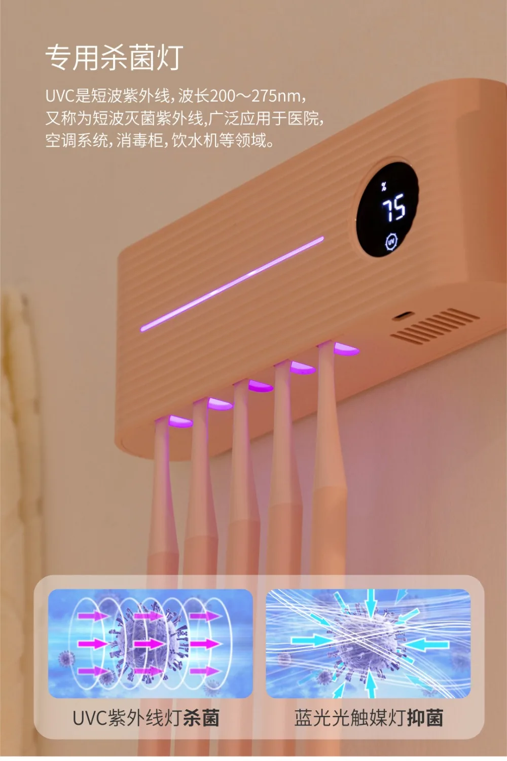1). Убивает 99.9% бактерий и микробов: этот держатель зубной щетки может убить 99.998% бактерий и микробов на вашей зубной щетке. Он был протестирован и сертифицирован по претензиям. Вы можете использовать свежую зубная щетка для чистки каждый раз, вместо мокрого, вызывающего чувство.