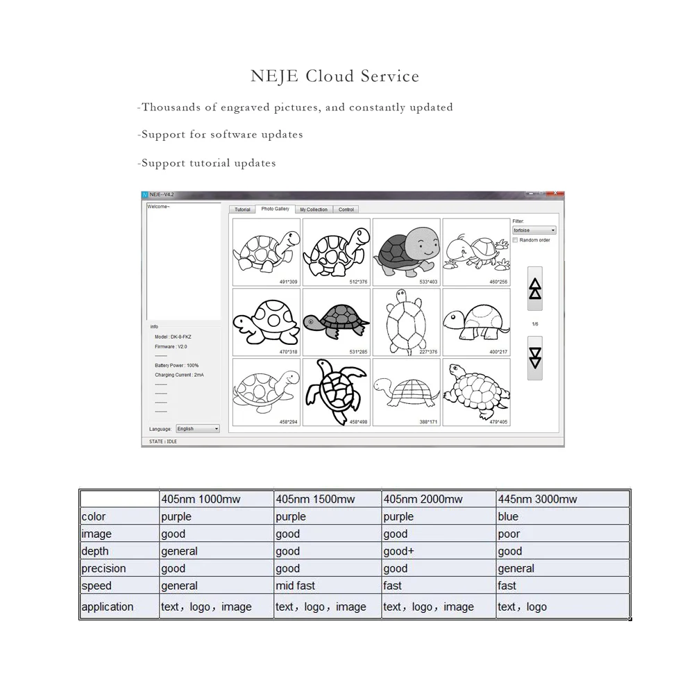 Особенности:Подходит для икон, глубокой гравировки и других материалов, Поддержка bmp, jpg, png и других форматов изображений.Тысячи облачных материалов постоянно обновляются для создания более интересного образа.Сканируйте qr-код с помощью приложения NEJE Scanner (только поддержка версии Android), он автоматически подключается к компьютерному программному обеспечению, прост и прост в использовании.Профессиональные алгоритмы обработки слов, алгоритм выполняет 1:1 рендеринга каждого пикселя без потери.Различные алгоритмы изображения более точно представляют характеристики изображения вашей семьи или кумира.Поддерживает параллельную гравировку и автономную работу, до 10 машин можно управлять только одним компьютером.Материнская плата совместима с различными лазерами питания и поддерживает 2pin mos и 4pin TTL контроль. Он может заменить больше оборудования питания для достижения эффекта расширения мощности.Полностью Металлическая прецизионная конструкция винта с механическим приводом и стабильная механическая структура с полной рамой обеспечивают точность X-Y оси в движении.Магнитная Защитная панель и Кнопка аварийной остановки обеспечивают безопасность. CE, FCC, FDA сертификация без излучения.Источник питания низкого напряжения USB 5 В, может заменить мощность 5 В/4 а, максимальная поддержка питания 20 Вт, безопасный, портативный и расширяемый.Оснащен 445нм лазерной трубкой, высокомощным лазером, TTL контролем, с датчиком температуры, безопасным и гравированным глубже.Может гравировать такие предметы, как внешний аккумулятор, мобильный телефон, кошелек, ручная работа и так далее.Примечание:1. Он не может гравировать металл, акрил и любой другой огнестойкий материал. Белый материал не работает хорошо.2. Продукт подходит только для личных DIY, из-за скорости резьбы, не рекомендуется для промышленного использования.3. Когда машина работает, рекомендуется не смотреть непосредственно на лазерную головку и не управлять лазерной головкой непосредственно вручную.4. Лазерный диод является чувствительным компонентом, обратите внимание на предотвращение электростатического повреждения (продукт включает в себя дизайн электростатической защиты, но есть определенная вероятность повреждения)5. Приложение поддерживает только версию Android.Характеристики:Тип штепсельной вилки: штепсельная вилка европейского стандарта/штепсельная вилка американского стандарта (опционально)Материал: алюминий + акрил + нержавеющая стальОсновной цвет: черныйМощность: 3000 МВтВходное напряжение: 100-240 ВВыходное напряжение: 5 В, 2 АДлина лазерной волны: 445нмФормат изображения: bmp, jpg, png и т. Д.Размер изображения: 490*490 пикселей/0,075 мм точечное расстояниеИзображение гравировка узор: растровый рисунок гравировкаСистема поддержки: Win7 / Win8 / XP / Win10Площадь Гравировки: 38*38 мм/1,50*1,50 дюймаРазмер изделия: 16*14,5*19 см/6,30*5,71*7,48 дюймовВес изделия: 976 г/34,43 унцийВес посылка: 1800 г/63,49 унцийРазмер посылка: 30*21*23 см/11,81*8,27 * 9.06inПосылка:1 * гравировальный станок1 * USB кабель1 * кабель питания1 * Адаптер питания1 * гаечный ключ1 * маркер для белой доски3 * деревянный блок3 * Бумага1 * Руководство (на английском языке)