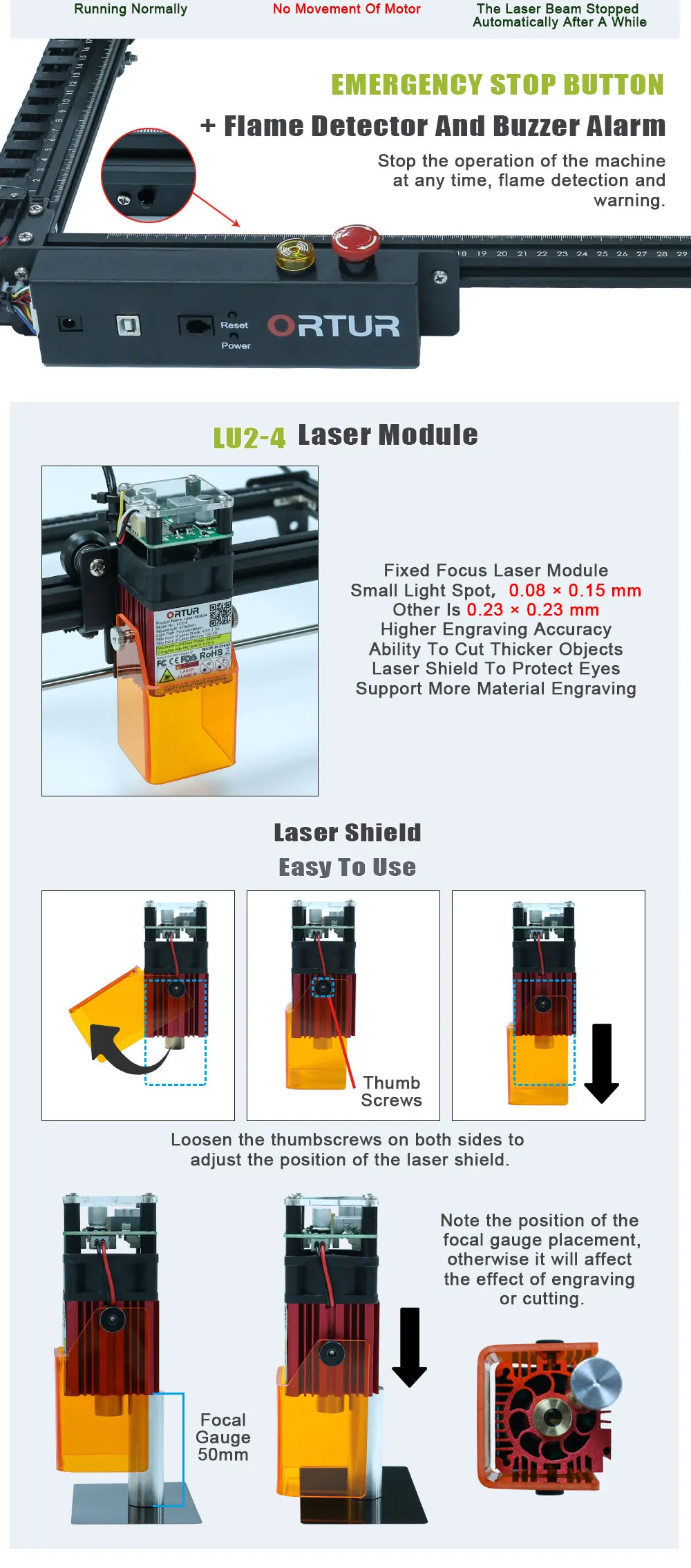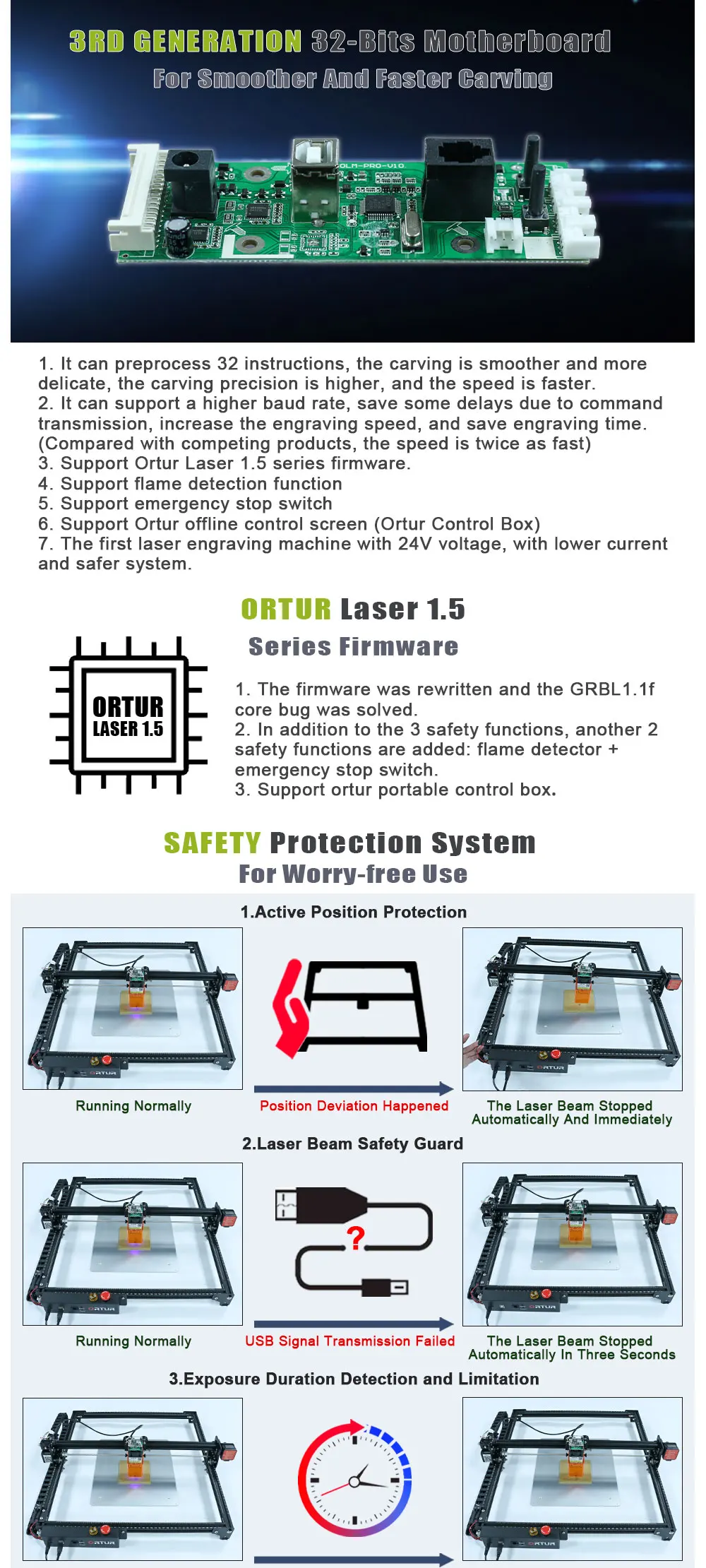 Краткое описание:● Лазерный мастер 2 - 7 Вт хорошо гравирует изображение.● Лазерный мастер 2 - 15 Вт является наиболее экономичным, доступным как для гравировки, так и для резки.● Лазерный мастер 2 - 20 Вт обладает более высокой мощностью и поддерживает более быструю гравировку и резку.Основные характеристики:●Специализированная материнская плата с 32bbits MCUОн может предварительно обработать 32 инструкции, поддерживает скорость передачи до 921600, более мощная!● Самая продвинутая прошивка для лазерного гравера 32 битаЛазерная прошивка Ortur master, умнее, быстрее, точнее и проще в использовании.● Диапазон мощности лазера может быть S0 - S1000, по сравнению с 8-битными настольными лазерными граверами, которые имеют только S0 - S255, лазерный мастер Ortur может управлять лазерным лучом более точно, можно даже использовать мощный лазерный блок для «рисования» изображения на бумаге, Что 8-битные лазерные граверы высокой мощности не могут сделать.● Скорость гравировки может достигать 3000 мм/мин. (Если не считать результата лазерной резьбы, скорость движения может достигать 1000 мм/секция.)● Защита активного положенияНа материнской плате есть g-сенсор, если машина обнаружит несанкционированное движение, лазерный луч остановится.● Защита лазерного лучаЕсли ваша компьютерная система остановлена или USB-кабель отключен, лазерный гравер перестает двигаться, лазерный луч остановится, чтобы предотвратить возгорание.● Обнаружение и ограничение продолжительности экспозицииЕсли лазерный гравер находится под контролем, но пользователи забывают работать и держать лазерный луч рабочим, дополнительная безопасность будет отрезана в случае, если двигатель перестал двигаться, чтобы предотвратить пожар.● LaserGRBL (бесплатное программное обеспечение) поддерживает Windows XP, 7, 8, 10. LaserGRBL-самое популярное программное обеспечение в мире для резьбы, может импортировать изображения разных форматов, вы можете редактировать в PhotoShop, Inkscape, CAD и т. д., а затем подключиться к граверу через laser LaserGRBL для гравировки и резки.● LightBurn (Платное программное обеспечение, lightburnsoftware are.com) поддерживает Windows, Mac OS и Linux. Это самое популярное Платное программное обеспечение для резьбы в мире, очень простое в использовании.● Этот лазерный гравер поддерживает режим PWM.● Предварительно собранные детали, просто нужно 10 - 20 минут для установки машины.● Большая площадь гравировки 400x430 мм.● Рама из алюминиевого профиля + структурная кабельная, прочная структура, плавная работа, привлекательный внешний вид● Синхронизация механической конструкции вала, избегайте синхронизации на двух рельсах Y, во время гравировки на полной скорости.Спецификация:● Материнская плата: 32-битная материнская плата● Прошивка: лазерная прошивка Ortur● ОС верхнего компьютера: Windows (работа с LaserGRBL ), MAC OS и Linux (работа с LightBurn)● Мощность лазерного гравера: 36 Вт, 12 В, 3 А● Электрическая мощность лазерного модуля: 7 Вт, 15 Вт, 20 Вт● Длина волны: 445 ± 5 нм● Формат ввода: NC, BMP, JPG, PNG, DXF и т. Д.● Площадь резьбы: X: 400 мм x Y: 430 мм● Скорость резьбы: 3000 мм/мин и меньше● Размер изображения: нет предела (точность пикселя можно регулировать свободно, а по умолчанию-300 пикселей на дюйм, точность пикселя составляет около мкм)Примечание:● Пожалуйста, носите очки при работе с лазерным гравером. Носите защитные очки, чтобы избежать слепоты.● Пожалуйста, не прик