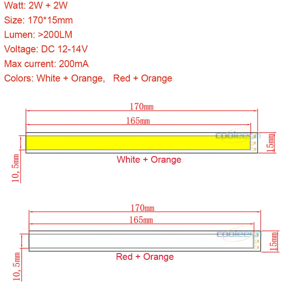 Дропшиппинг, 10 шт., 170x15 мм, 2-цветная Светодиодная лента COB, 12 В, лампа для поворотного сигнала, 170 мм, двухцветная, с двумя настройками, оранжевый, красный, белый