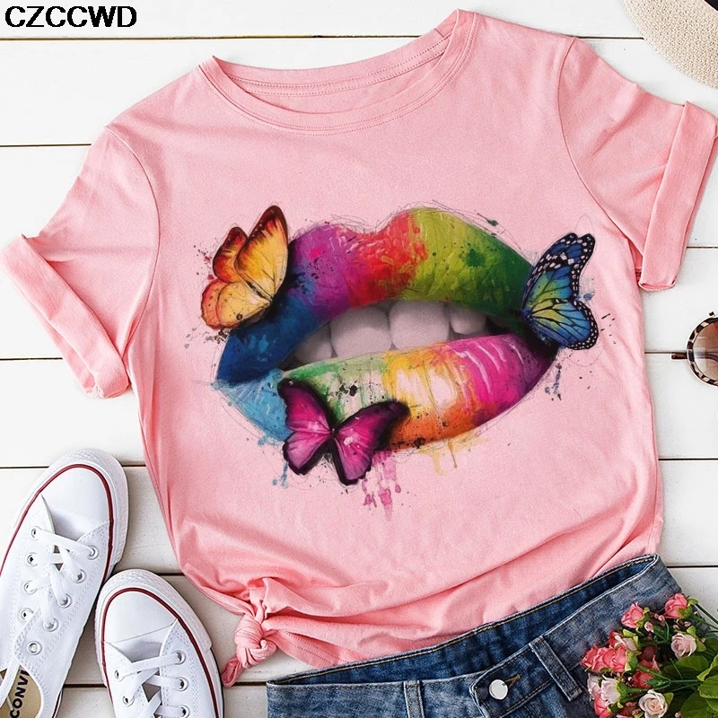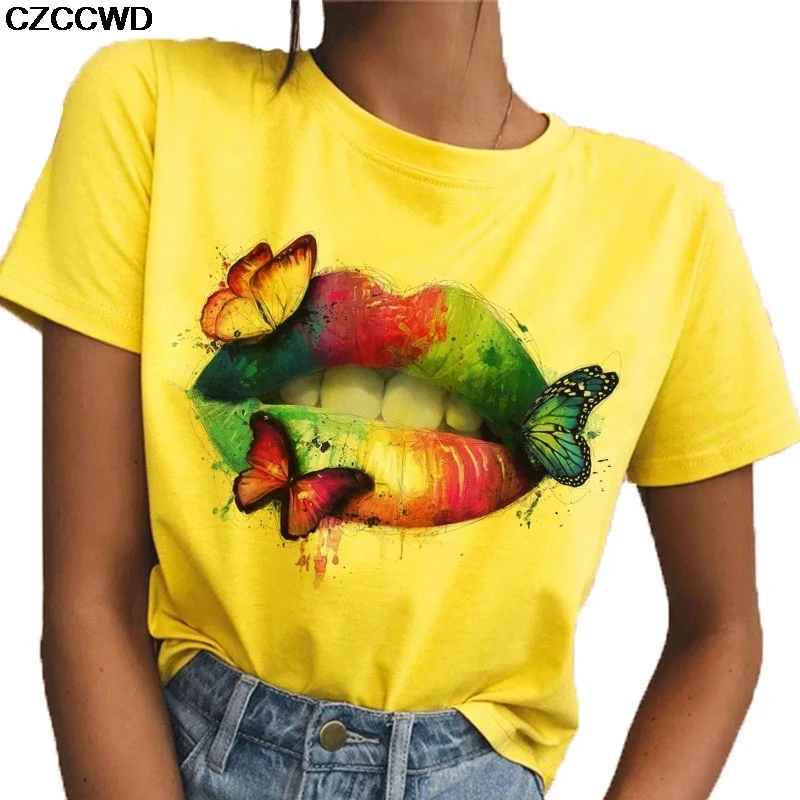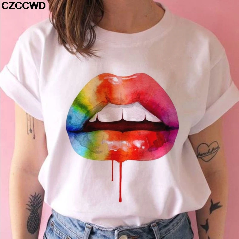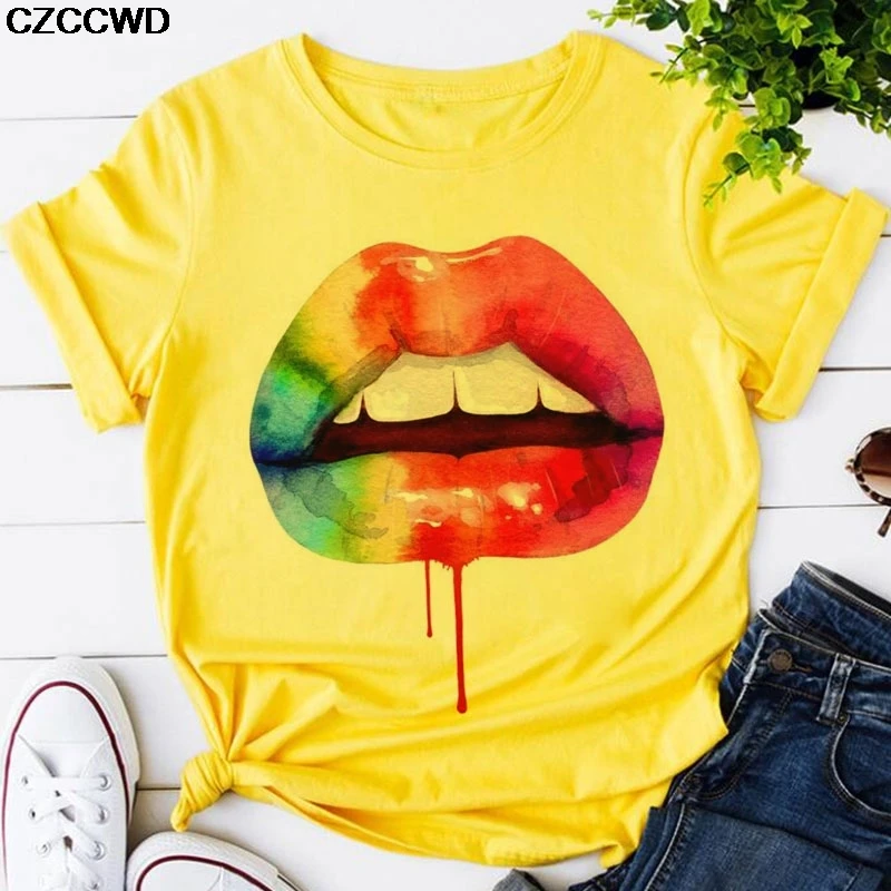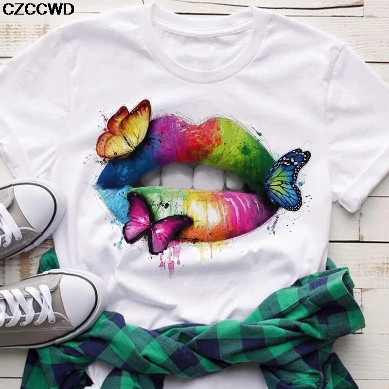 Женские летние футболки 2020, топы, цветная футболка с круглым вырезом и принтом губ, подходящая ко всему белая футболка в стиле Харадзюку, забавная футболка для девочек