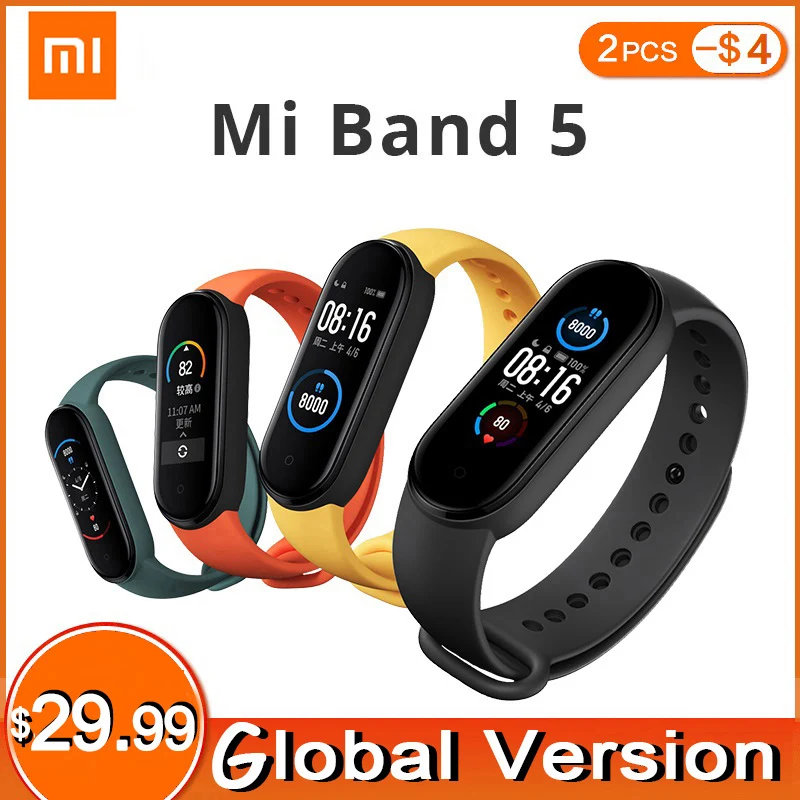 Умный Браслет Xiaomi Mi Band 5, 4 цвета, AMOLED-экран, пульсометр, Шагомер сна, плавание, спортивный монитор, приложение Miband 5, управление через приложение, глобальная версия