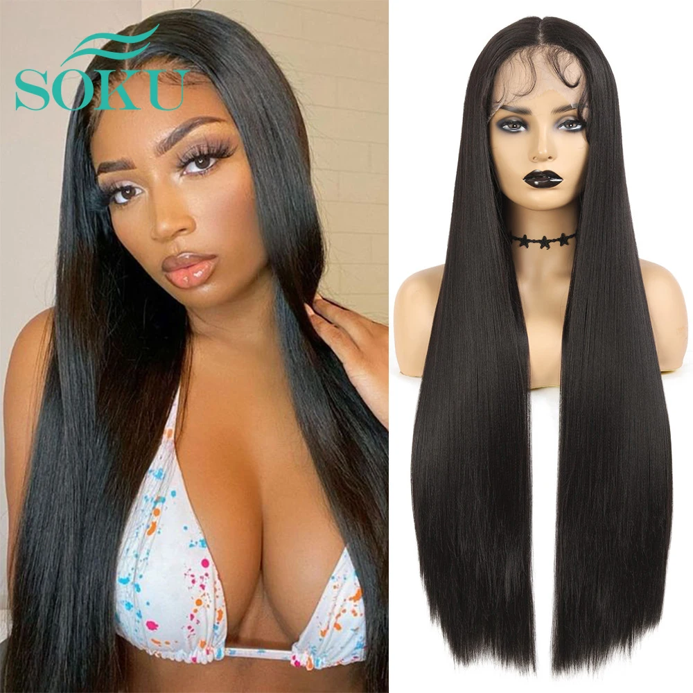 Синтетический парик фронта шнурка длинный прямой темно-коричневый цвет с детскими волосами Термостойкое волокно средняя часть парик шнурка для чернокожих женщин