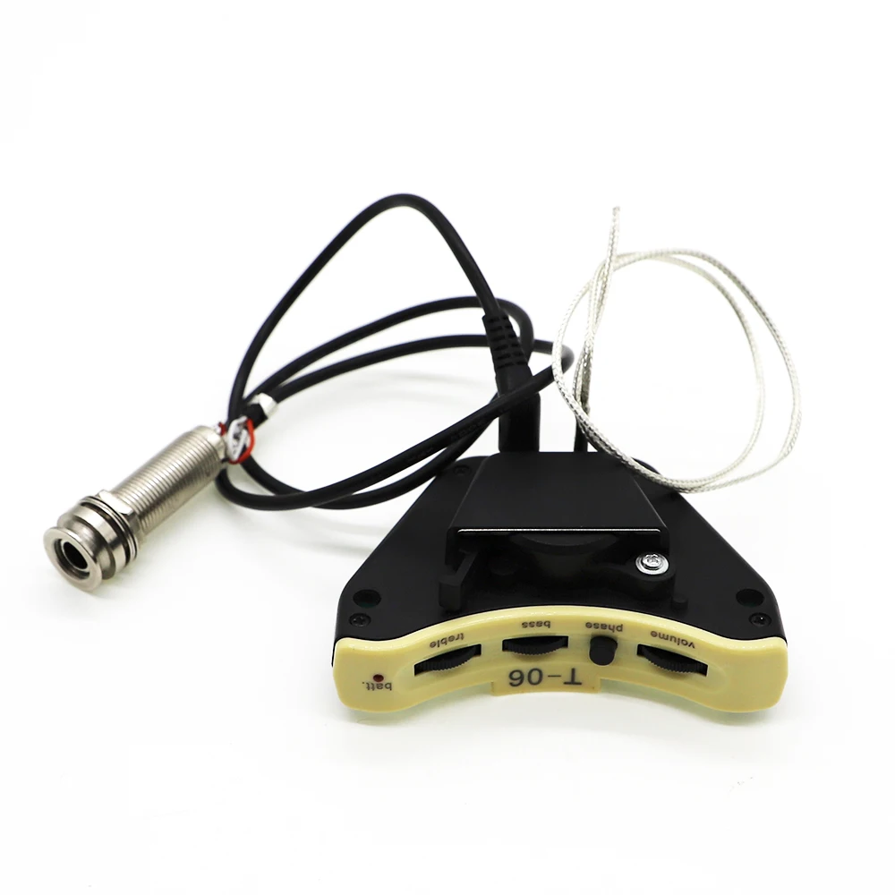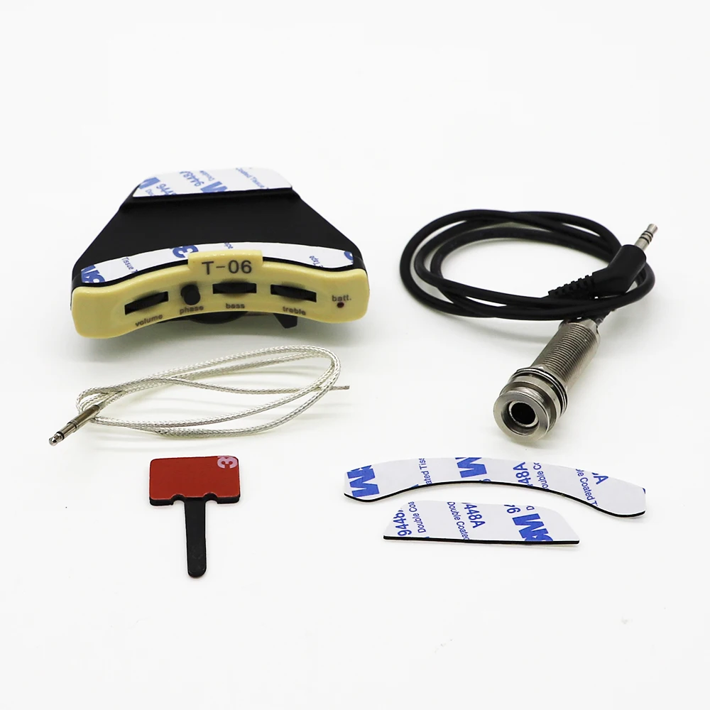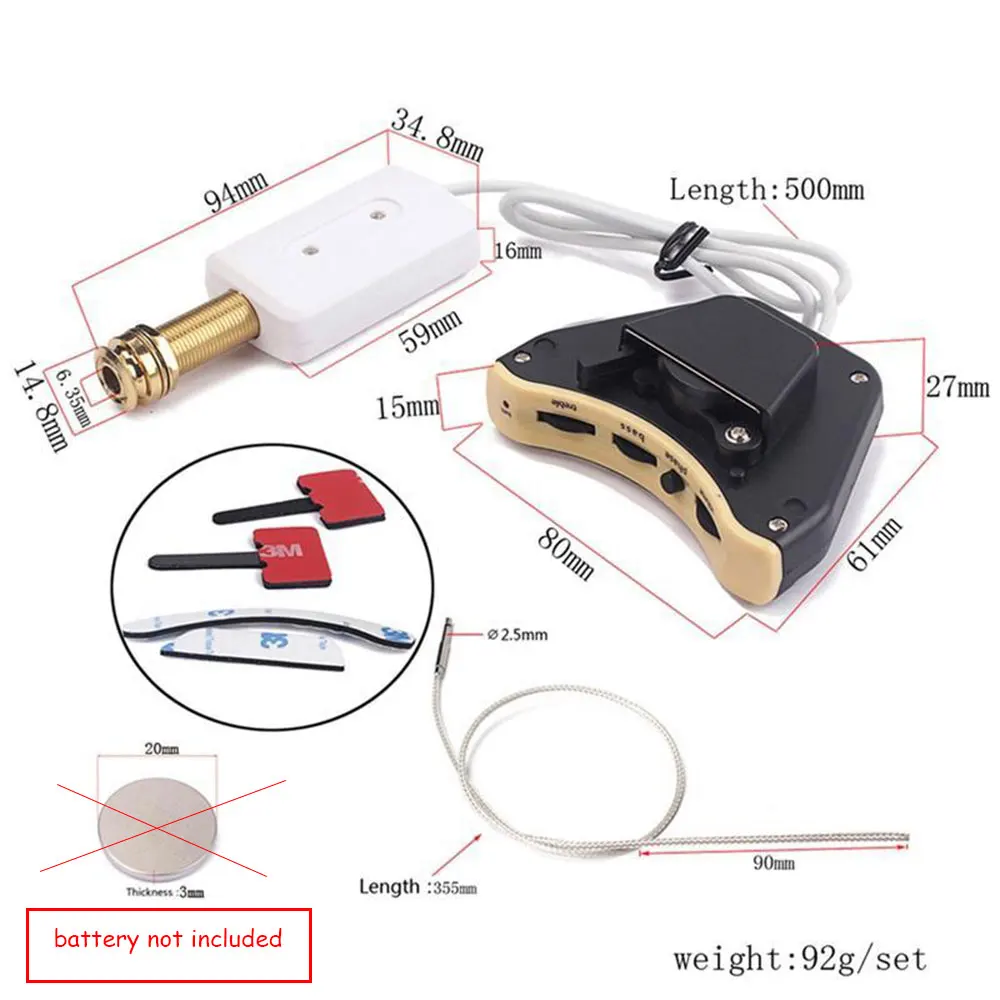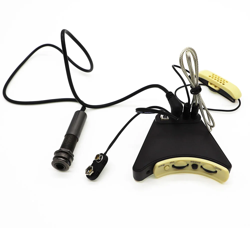 Описание:1. Идеально подходит для большинства акустических гитар, удобен в использовании, прост в обращении.2. Тип управления звуковым отверстием для гитарной системы преампа.3. Гибкий датчик нижнего седла, индикатор низкого заряда батареи.4. Громкость, бас, высокие частоты управления и фазовый переключатель.5. Уникальный поворотный дизайн для мгновенного доступа к двойной монете.Источник питания: аккумулятор CR2032Характеристики:Материал: металл + пластикЦвет: черный + кремовыйРазмеры (Д x Ш x В) : 8x6,1x2,6 см/3,15x2,4x1,02 дюймов Посылка включает:1 x контактный разъем для пикапа1 x лента для пикапа1 x пряжка1 x пикап3 x поролоновая подкладка