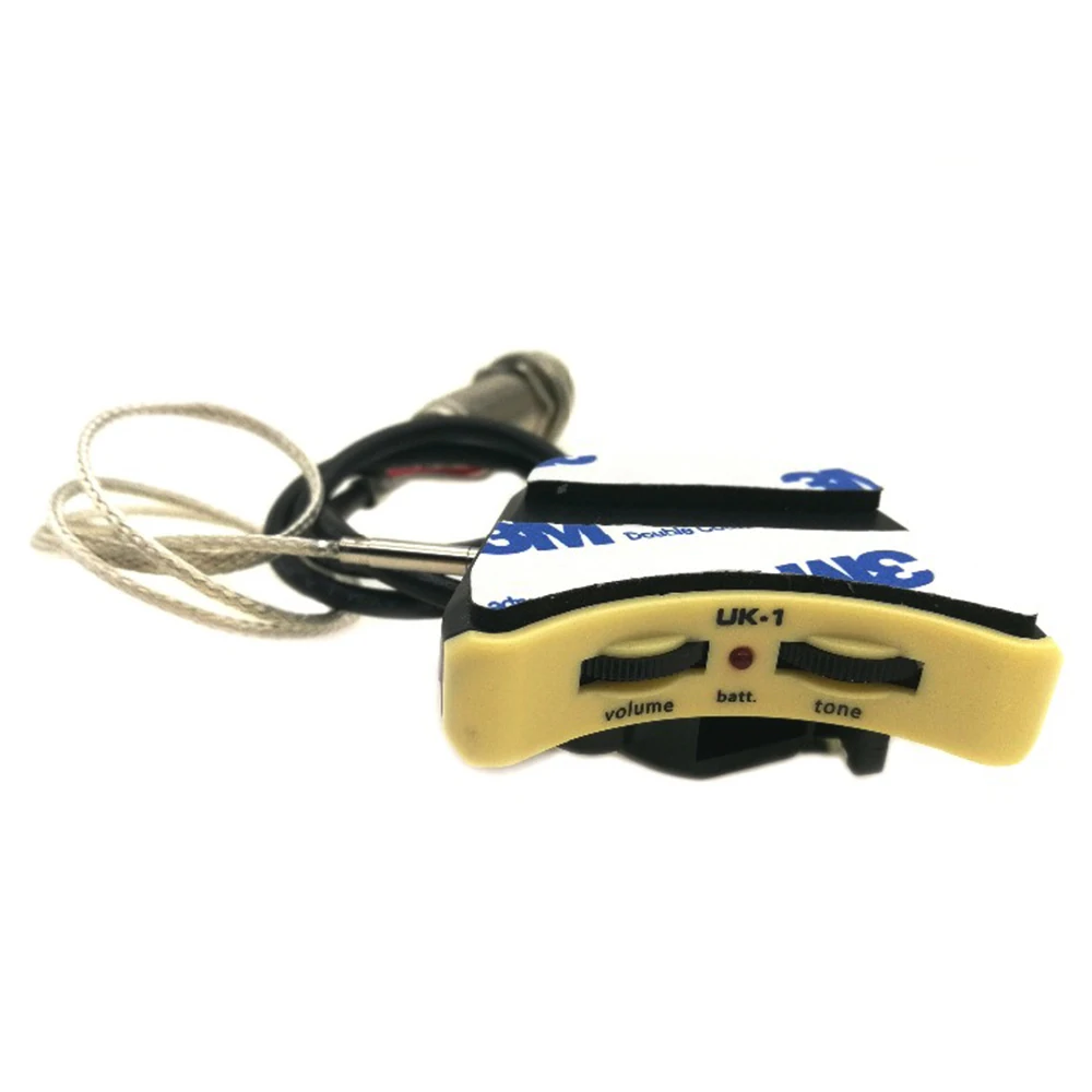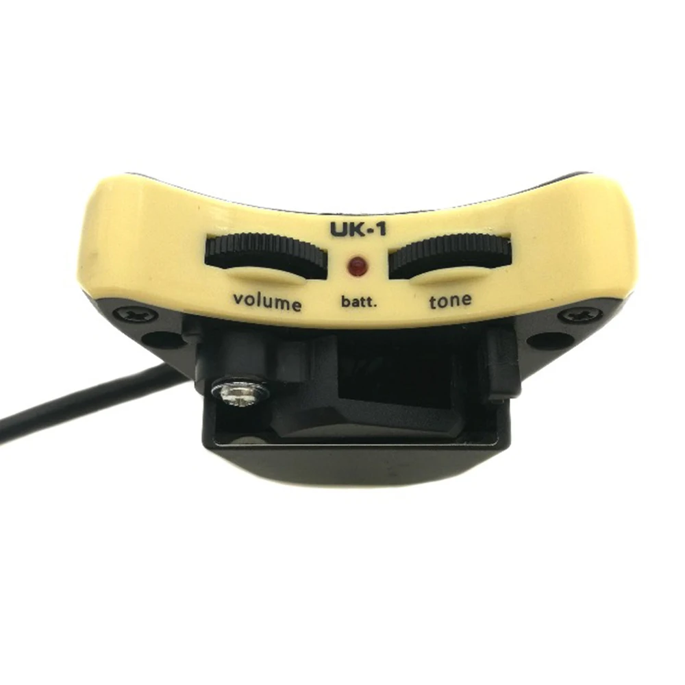 Описание:Это звуковое отверстие для гавайской гитары Гавайских гитары.Он имеет громкость и тон.Серебряный пьезо пикап высокого качества.Источник питания: аккумулятор CR2032Вес пикапа: 41 г Посылка:1 * звукосниматель для Укулеле Примечание: батарейки в комплект не входят