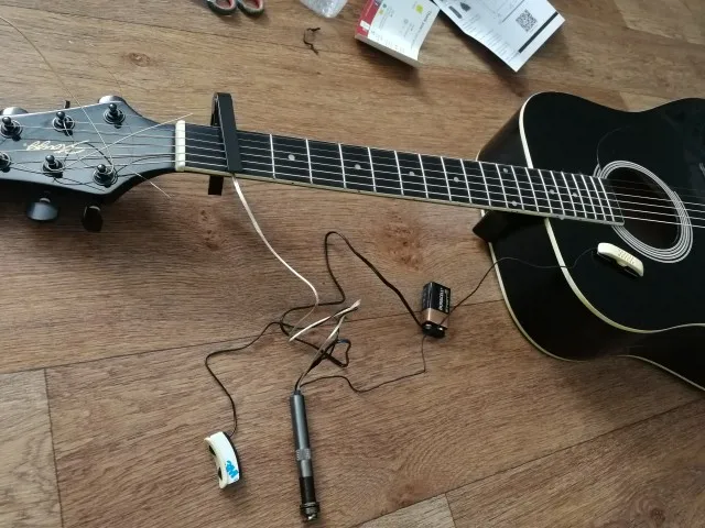 Характеристика:Народная гитара, акустическая гитара Пикап с микрофоном и давлением1. Пьезо Длина: около 32 см2. Источника питания: 9 В (6F22) батареяПосылка Вес: 150 г