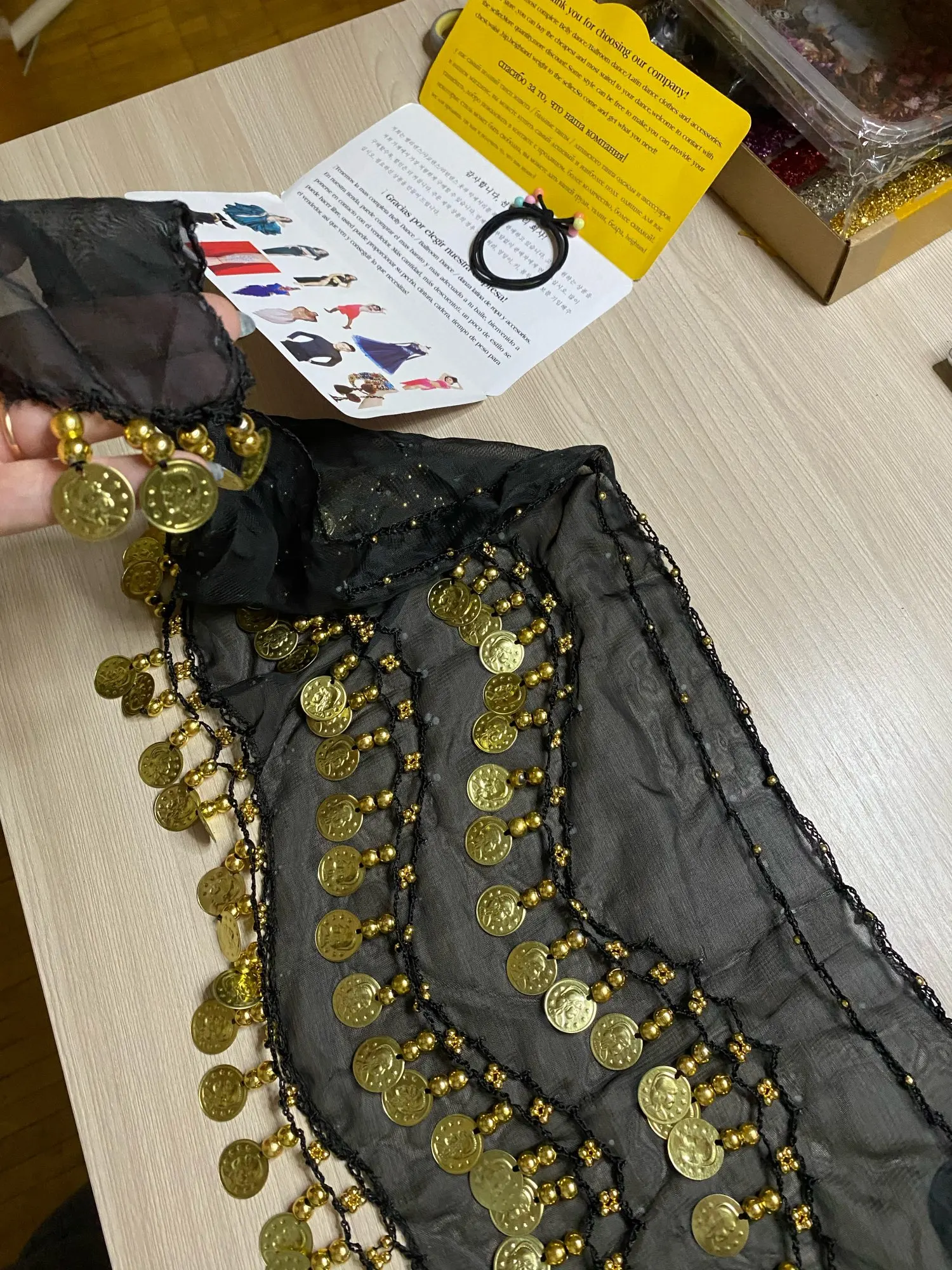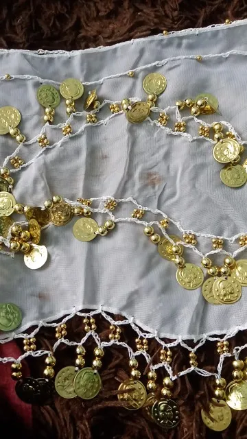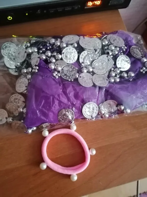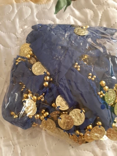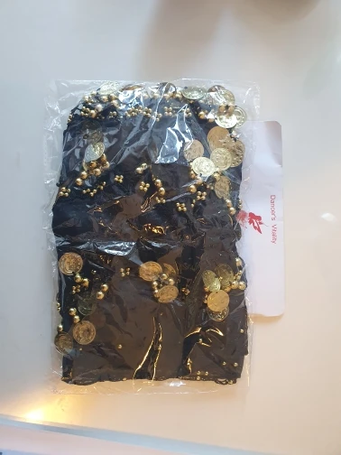 В Минск доставка заняла 7 недель. Тяжелый, ткань тонкая, звенит прикольно. Но мне на ОБ=106 см он мал по окружности, я не могу частью, которая с монетками, полностью обернуться вокруг бедер. Получается, что либо сзади часть с монетками, а спереди только завязки, либо спедери монетки, а сзади завязки. На бок завязать тоже некрасиво получается, слишком невелика часть с монетками, закрывает только одну ногу. На фото все видно.