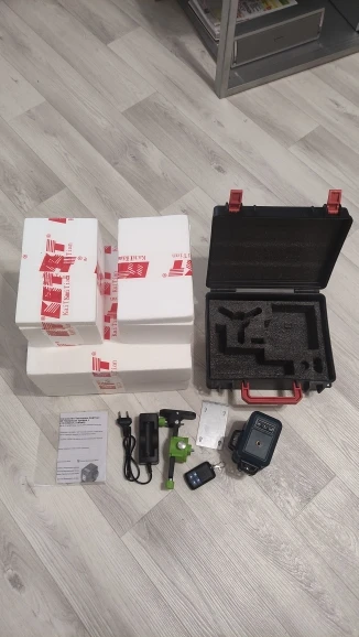 Купил прибор-комплектация максимальная. Всё соответствует описанию. Прибор получил за 5 дней после заказа. Супер. Сразу же опробовал. Всё работает. Батарейки заряжены почти полностью. Упаковка отличная, каждая деталь в отдельной коробке из пенопласта. Даже батарейки каждая в своей коробке(большой). Точность пока не проверял. Днём без солнца в пасмурную погоду луч виден но очень слабо. Красный не видим вообще. Приёмник луча срабатывает отлично. Правда инструкция на приёмник почти бесполезна.Хорошо бы её расширить-это к продавцам))). Продавца и товар рекомендую.