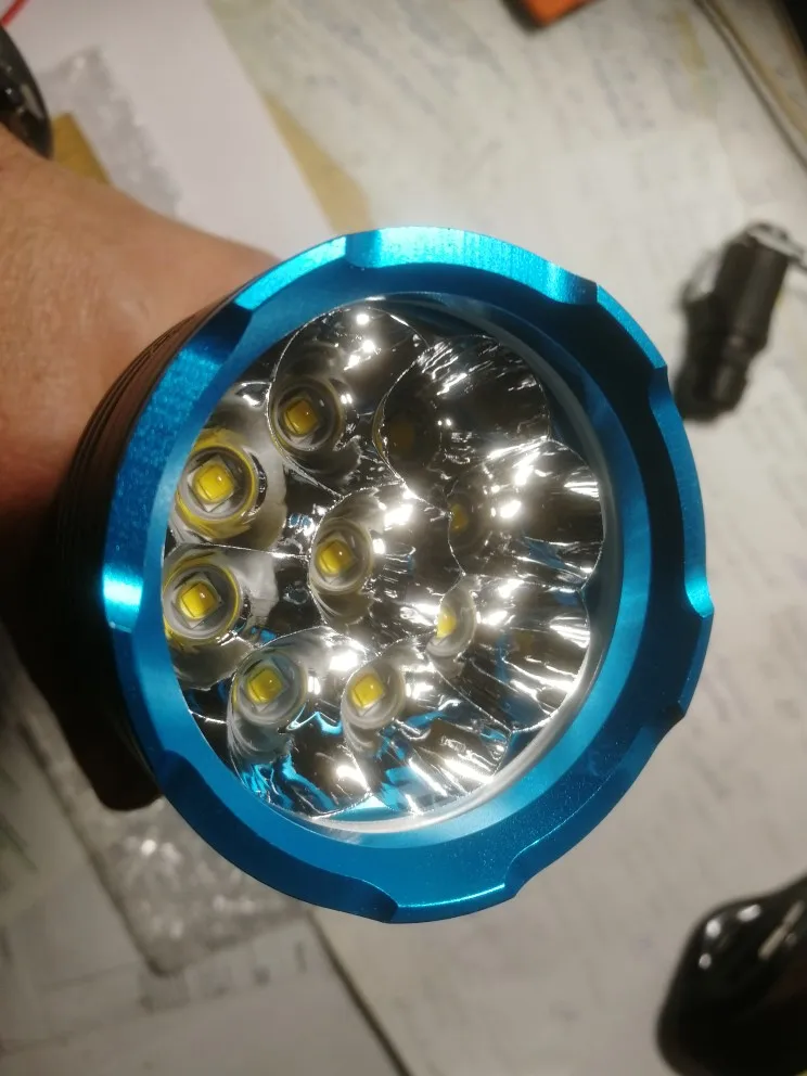 Отражатель отполирован хуже, чем в предыдущей модели с 7 светодиодами - присутствуют наплывы. Световое пятно меньше, светит чуть хуже, может потому что выбрал жёлтые светодиоды. Фонарь быстро греется. Охочусь в озере, но прозрак метра 3. Посмотрим, как себя зарекомендует в мутняке - белый светит ярче, но в мутной воде немного засвечивает