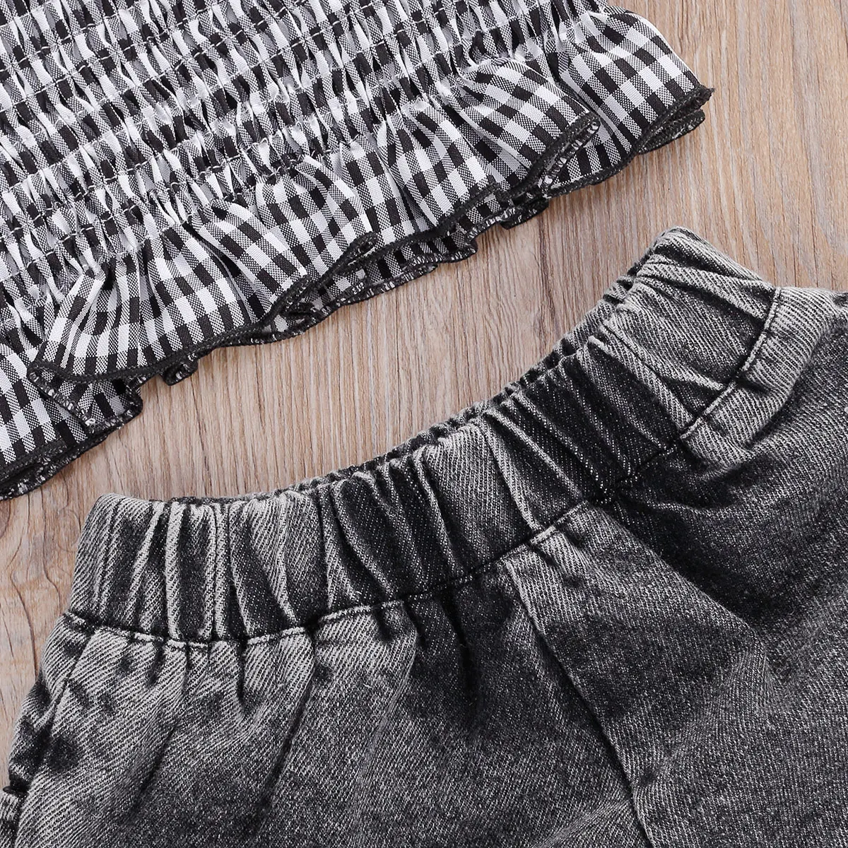От 2 до 9 лет, летние модные детские комплекты одежды для маленьких девочек клетчатые футболки с коротким рукавом, топы, джинсовые шорты комплект из 2 предметов