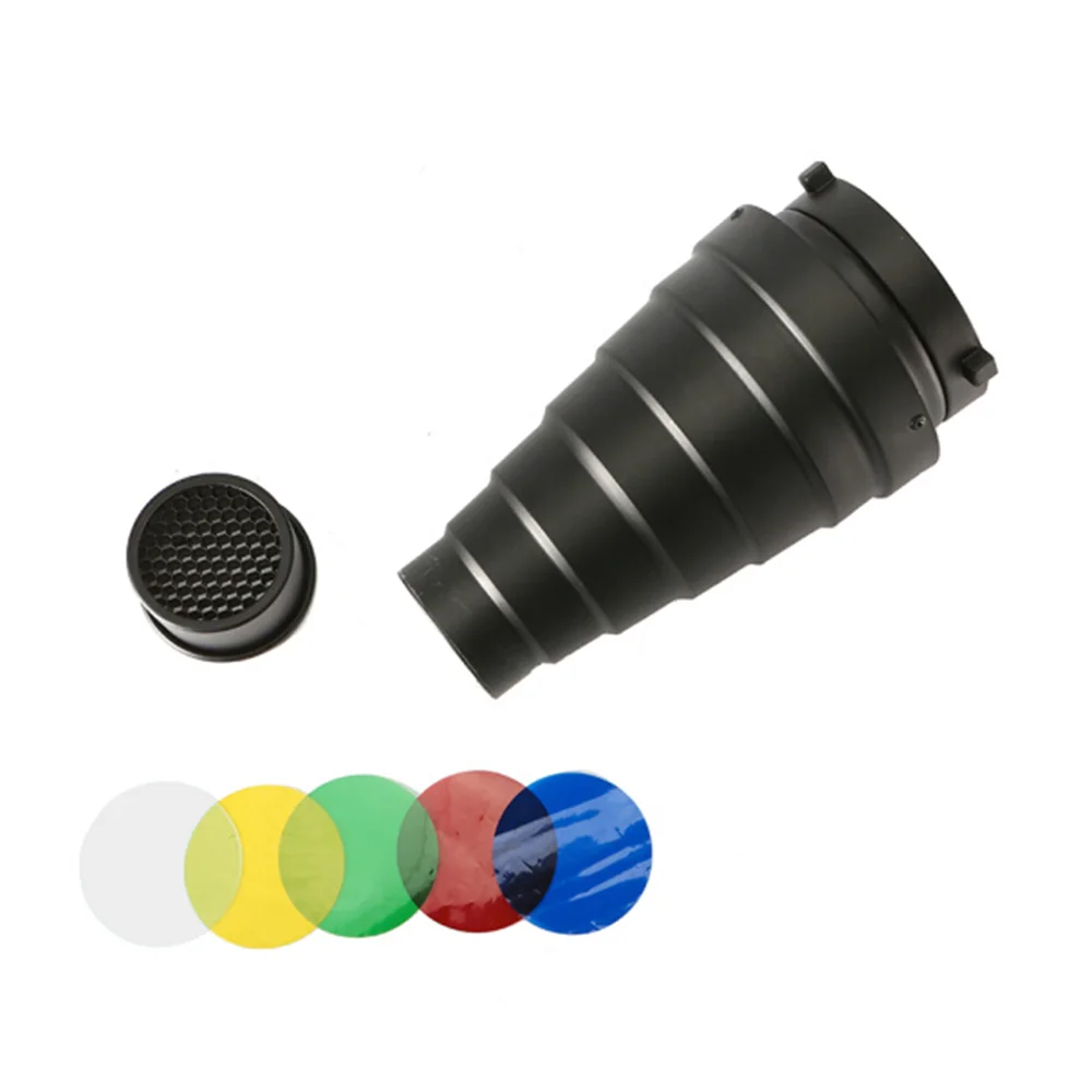 Конический наконечник среднего размера из алюминиевого сплава, с сотовой сеткой и 5 цветными гелевыми фильтрами для студийной установки Bowens