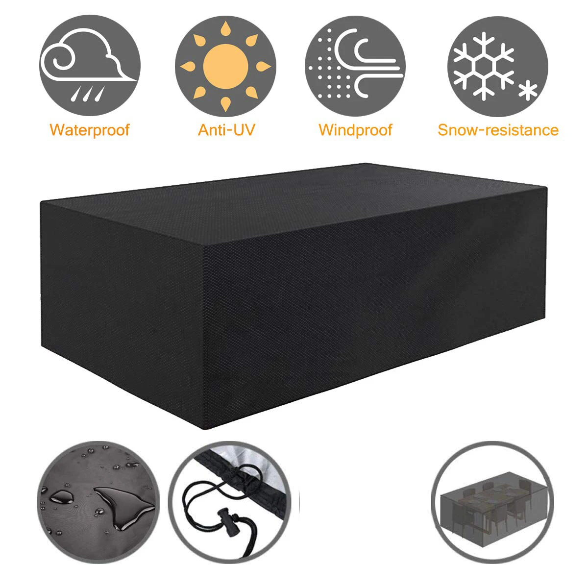 1. Чехлы для мебели в патио достаточно большие, чтобы покрыть все виды наружной мебели для патио, стола, скамейки, журнального столика, стульев или другой прямоугольной мебели. Проверьте размеры мебели для правильной посадки.2. Изготовлен из нейлоновой ткани Оксфорд высокой плотности 210D, которая устойчива к атмосферным воздействиям и пыли, эффективно предотвращает промокание мебели из-за дождя и снега.3. На кромке мебельной крышки есть веревка на шнурке. Даже в суровых условиях Ваша мебель может быть безопасной, чистой и сухой.4. Изготовлен из удивительного гидрофобного материала и двойных связанных краев обеспечивает полную защиту крышки от растрескивания. Внутренний слой имеет УФ-покрытие, обеспечивает исключительную защиту под солнечным светом.5. С удобными мешки для хранения, патио мебель крышка легко складывать, хранить и носить, не занимают места.Примечание: Если ветер очень сильный (например, ураган), мы предлагаем вам разместить некоторые тяжелые предметы на крышке наружного стола, чтобы лучше предотвратить удар покрытия.