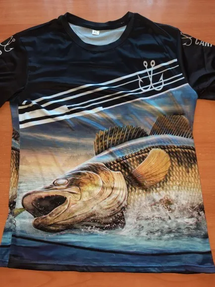 The shirt is faded. The color of the fish is not as in the picture. Much lighter, but wearable.