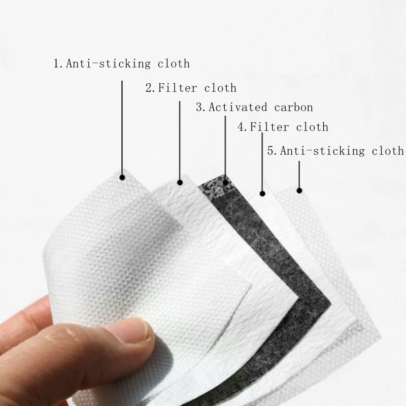 1. Материал: ПП антиприклеиваемая ткань + мелтдувная ткань + ткань из активированного углерода 2. Фильтр маски обеспечивает комфортную защиту для людей. Рекомендуется заменять флитеры каждую неделю использования для лучшего эффекта. 5. Подходит для типа масок PM2.5 для лица для типа масок PM2.5. Функция фильтра: 1. Первый слой: ткань спанбонд, фильтр пыли микрон 2. Второй слой: для фильтрации промышленных загрязняющих веществ, автомобильных выхлопных газов, вторичного дыма пыльцы аллергии 3. Третий слой: ткань из активированного углерода, бензол и меньшая функция фильтрации микрон пыли 4. Четвертый слой: плотность фильтра, меньший материал 5. Пятый слой: ткань спанбонда, фильтрует все виды вредных веществ; Советы: 1. Вставной фильтр не может быть очищен, рекомендуется 1-2 недели для замены a; 2, фильтрующее масло на пленке или с липкими пятнами осадка больше, пожалуйста, замените фильтр 3, воздух не гладкий, дыхание трудно или сон, носить не рекомендуется 4, 2 недели следующая емкость легкого ребенка низкая, не рекомендуется