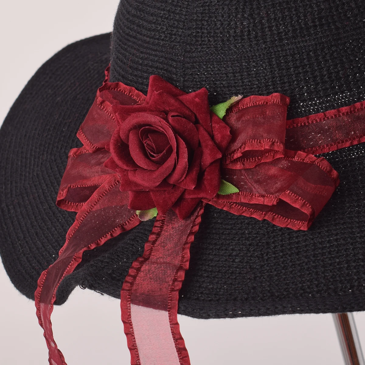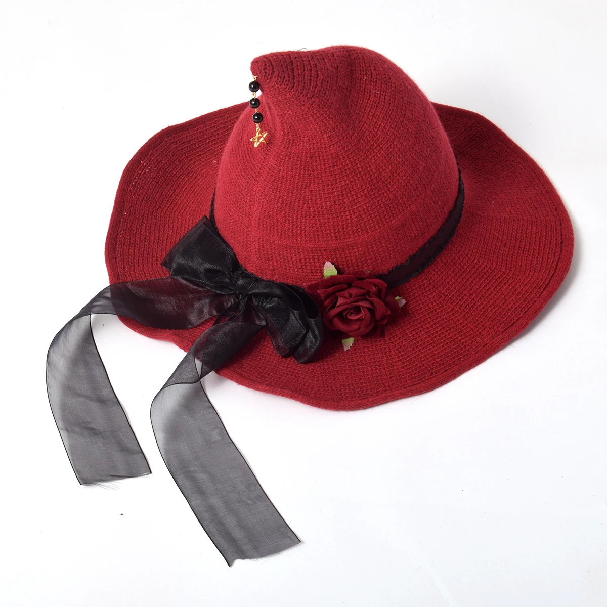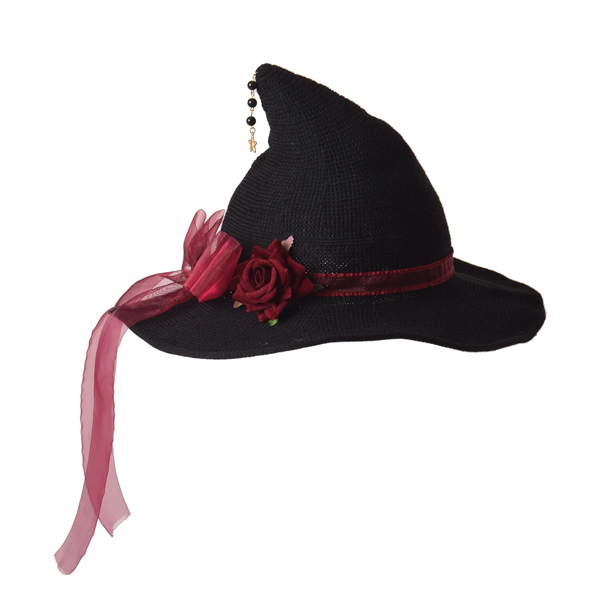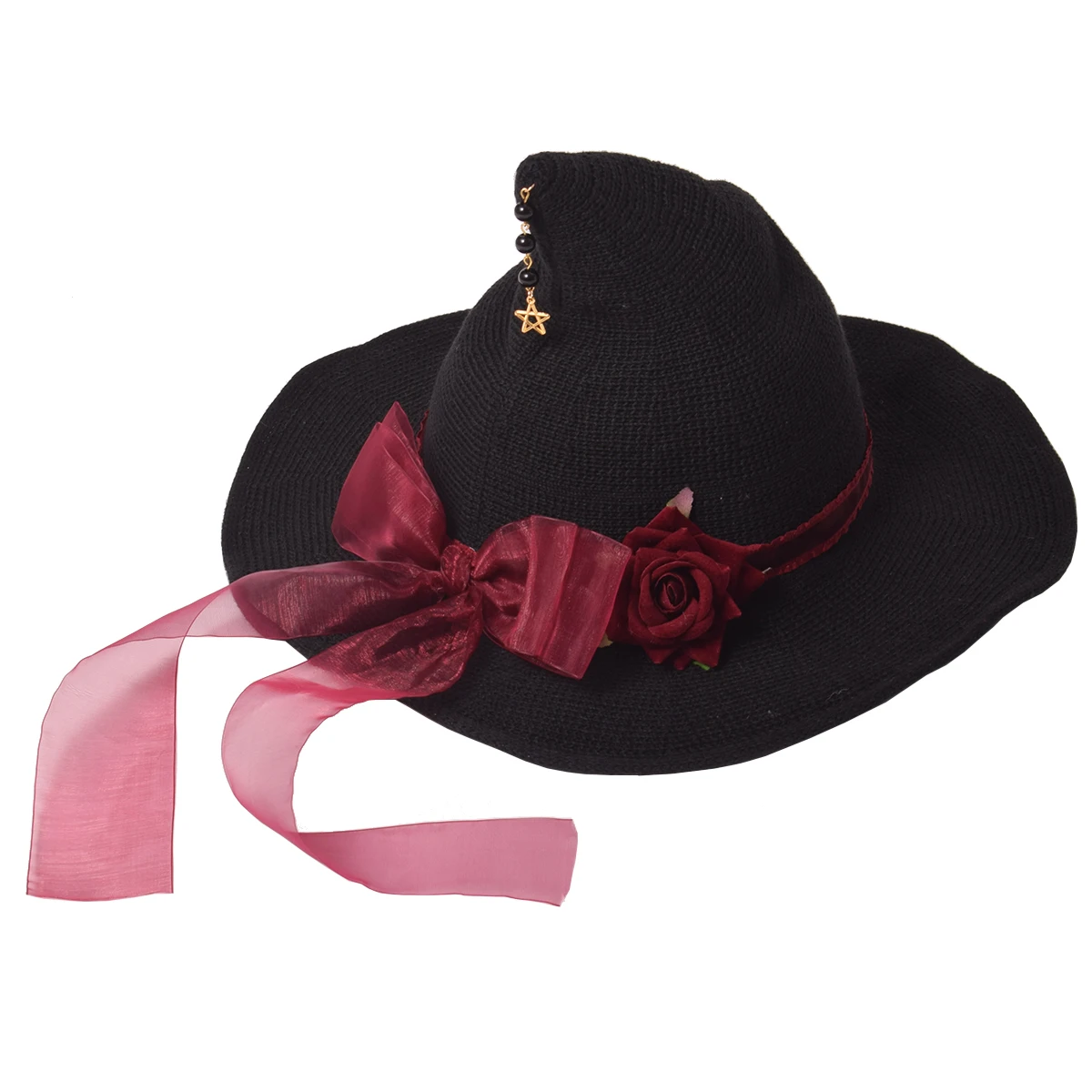 Женская шляпа ведьмы, черная, Готическая, Лолита, девушки, красная роза, Цветочная лента, подвеска, головной убор с бантом