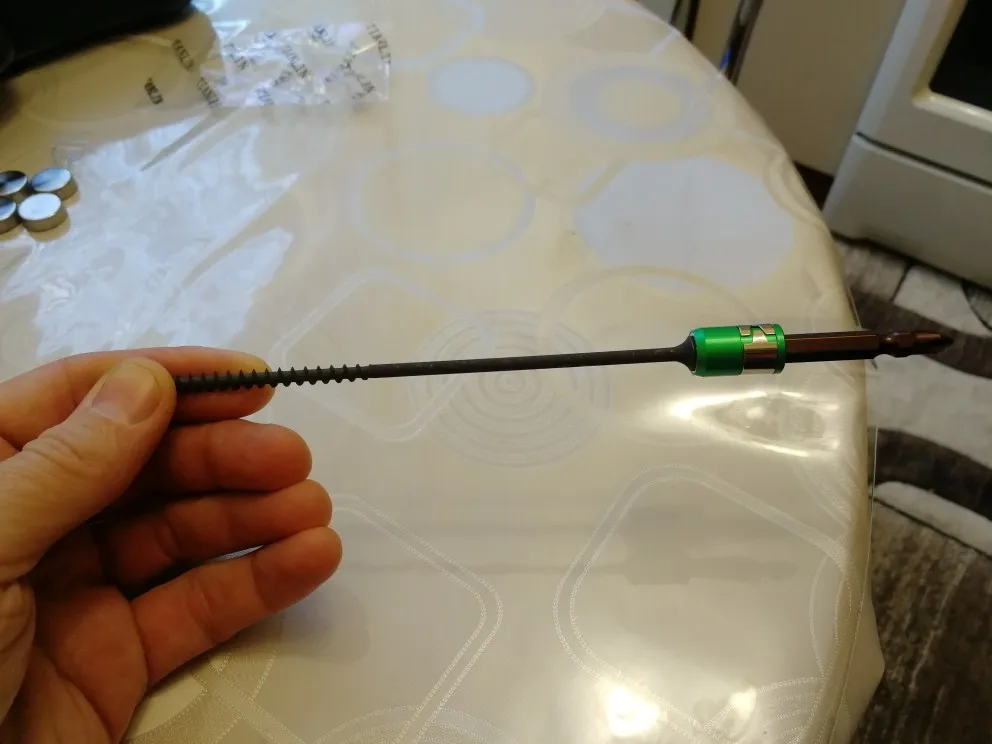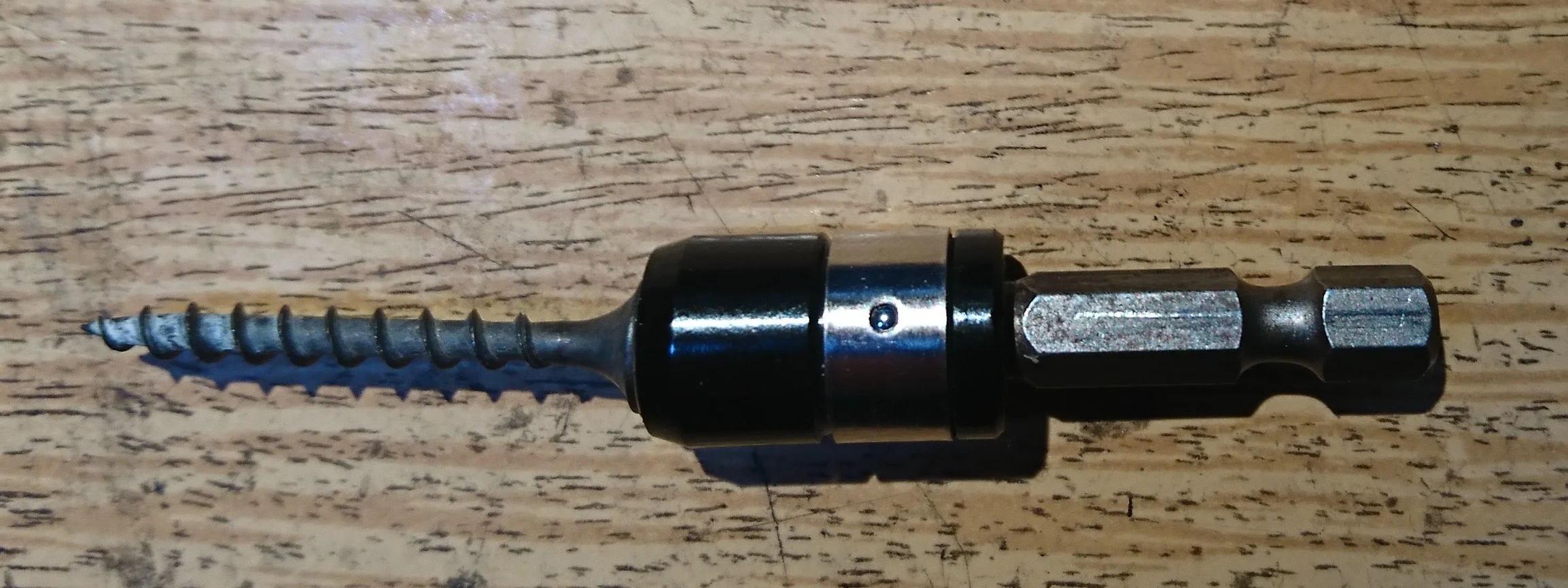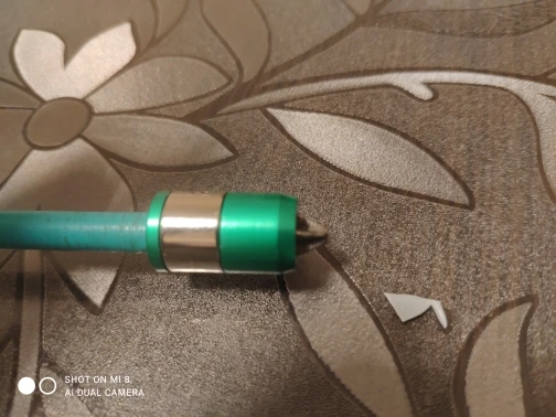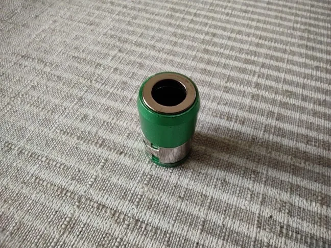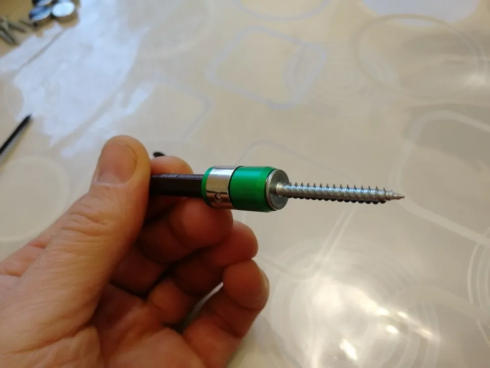 Мне было непонятно, как магнитное кольцо может плотно прилегать к саморезу (к шурупу). Оказалось, что кольцо может немного двигаться вдоль биты. Поэтому кольцо плотно прилегает к саморезу и притягивает саморез к кресту на бите. Конструкция очень понравилась.