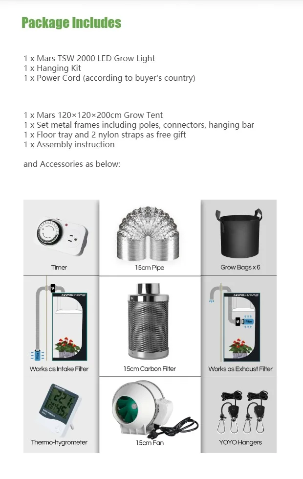 Товар прибыл в идеальном состоянии. Все 3 коробки хорошо упакованы и отлично работают. Я уверен, что подумаю об этом продавце для моей следующей покупки набора для выращивания палаток.