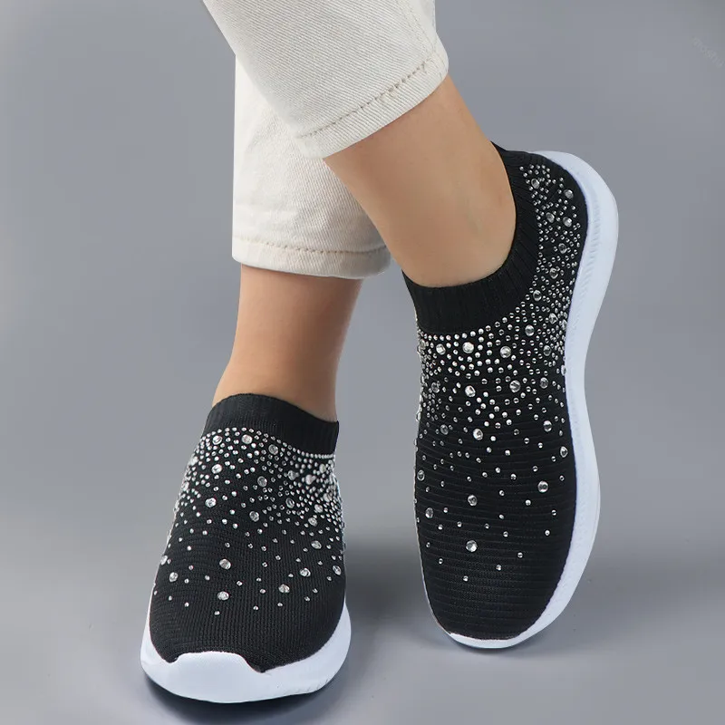 Кроссовки-носки женские с кристаллами, Вулканизированная подошва, б...