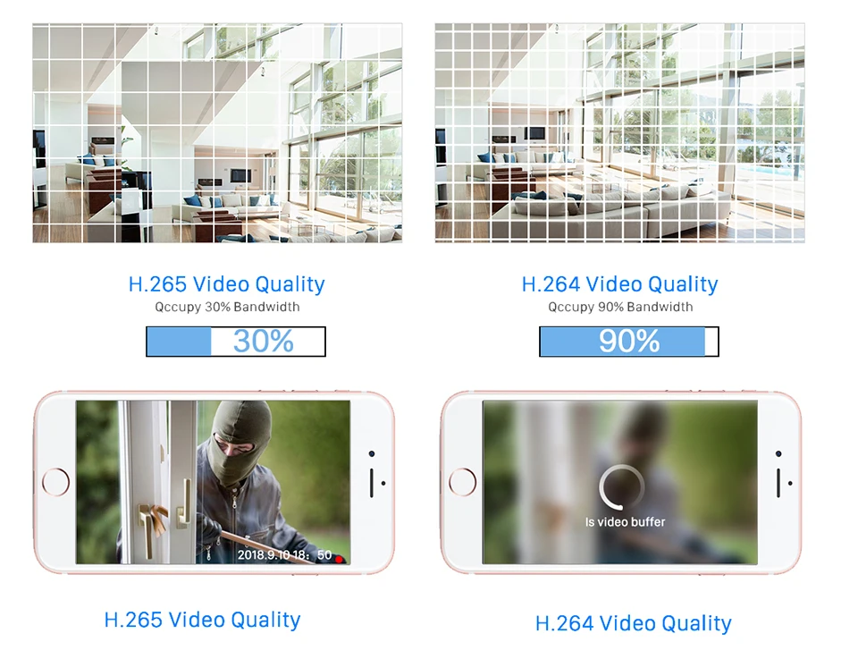 H.265 может значительно уменьшить потребление полосы пропускания при том же качестве видео.H.265 занимает всего 30% от H.265 относительно битрейта и пространства для хранения.