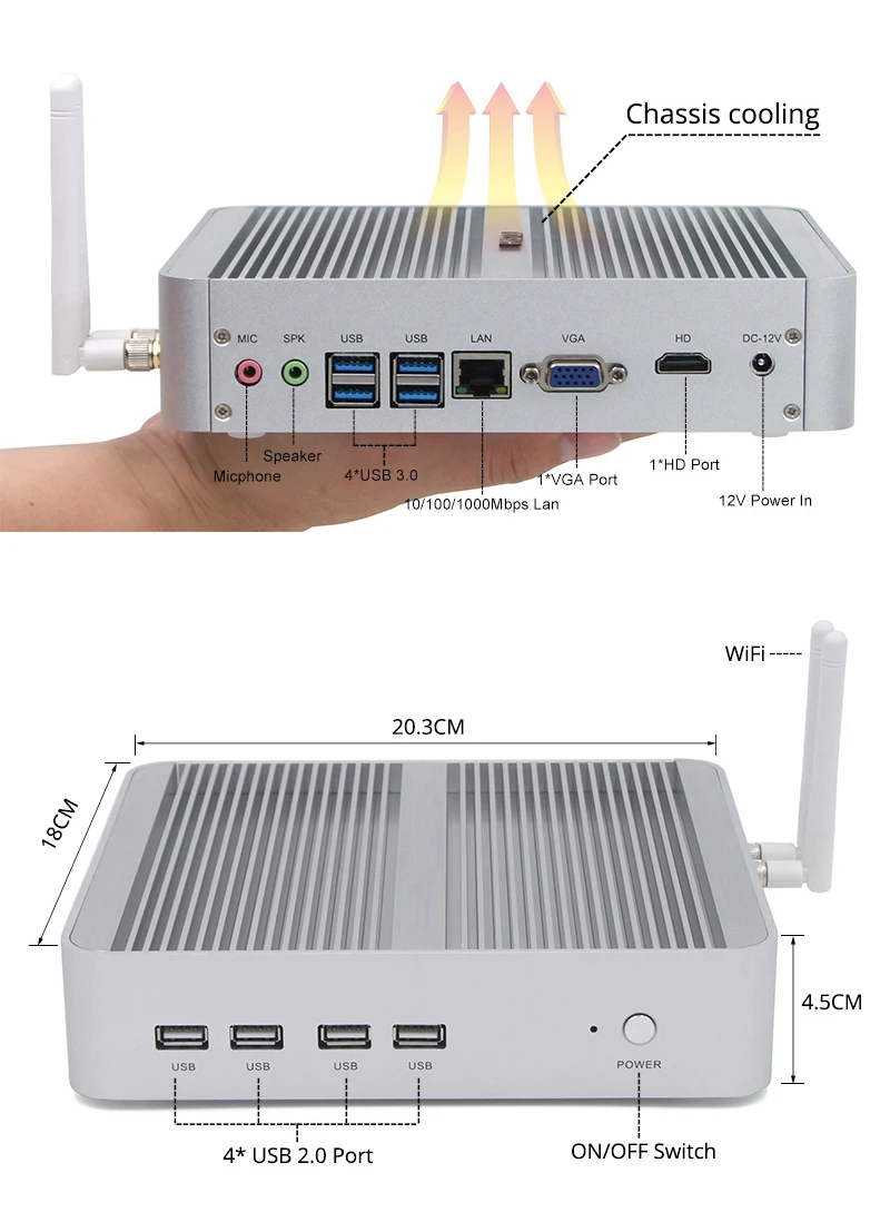 Особенности:Процессор intel i5 8-го поколения, безвентиляторный, умный дизайн, нулевой шум, полностью металлический чехол. Разъемы передней панели: 1 кнопка включения питания; 1xPower светодиоды; 4 порта xUSB 2,0 Разъемы задней панели: 1x12V DC вход 1xHD порт 1xVGA порт 1xGigabit LAN порт 4X USB 3,0 2xaudio in/out разъемы Материнская плата: RAM:2x so-dimm DDR4 слоты PCIE:2 интерфейса xMini PCIE: Полная высота для твердотельного жесткого диска mSATA. Половина высоты одна для мини PCIE беспроводной карты. 1x Mini PCIE для NGFF 2280 M.2 SSD 1xsata для 2,5-дюймового диска Сетевая карта:Бортовой RTL 8111DL 10/100/1000 BaseT LAN; Беспроводная:300 м 2,4/5 ГГц 802,11. b/g/n с двойной антенной Звуковая карта:Чип ALC892, обеспечивающий 6-канальный звук Что в коробке: 1 мини-ПК 1x адаптер питания 1 кабель питания с вилкой США 1X Настольный кронштейн 2xwi-Fi антенны 1 Набор кабелей питания и передачи данных SATA (для привода 2,5 дюйма) 1xHD кабель Некоторые винты.