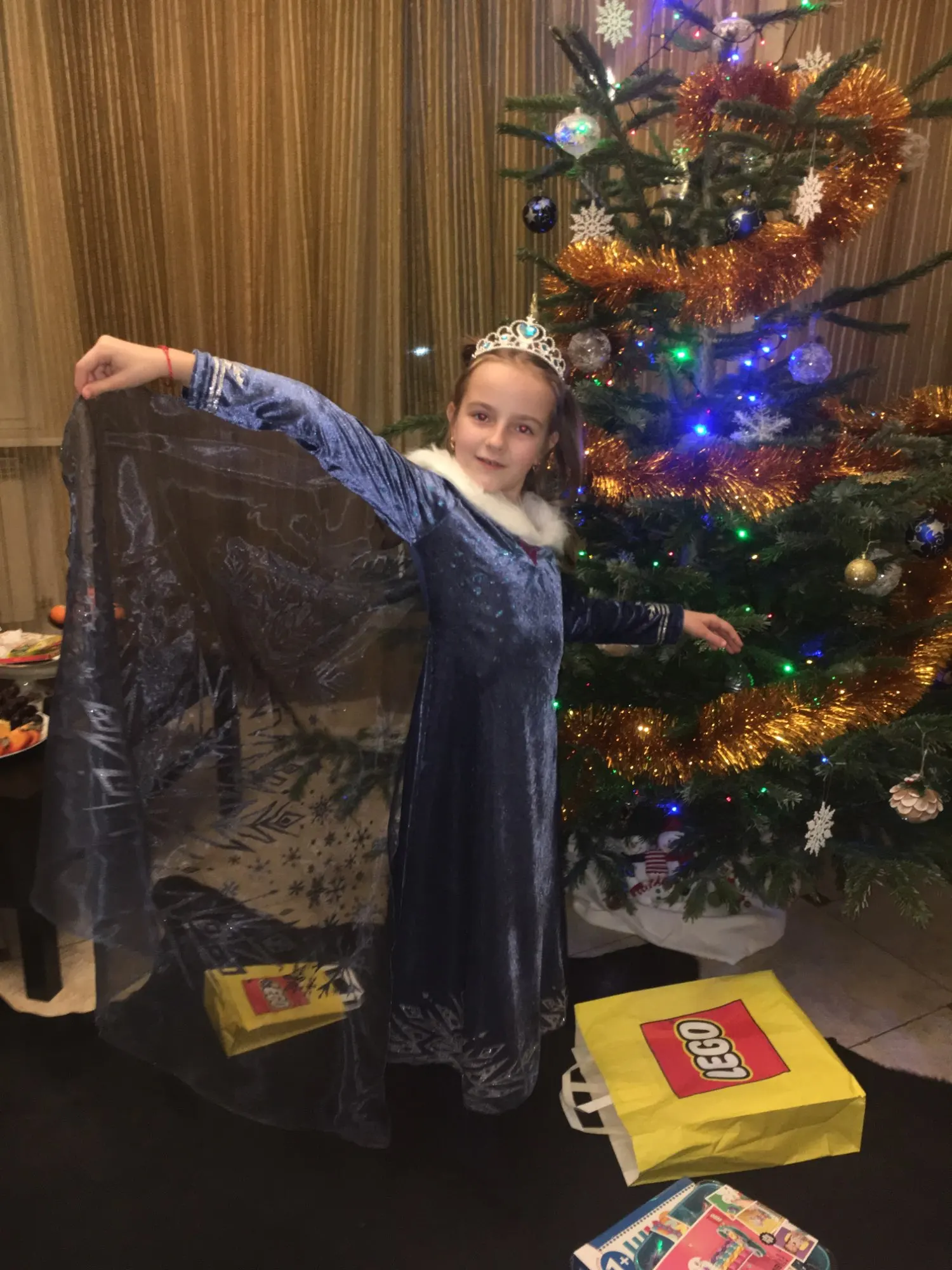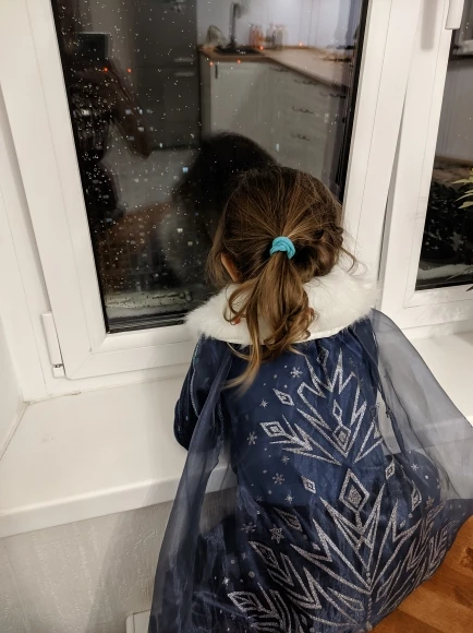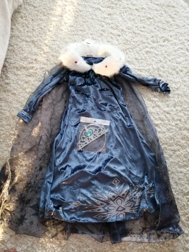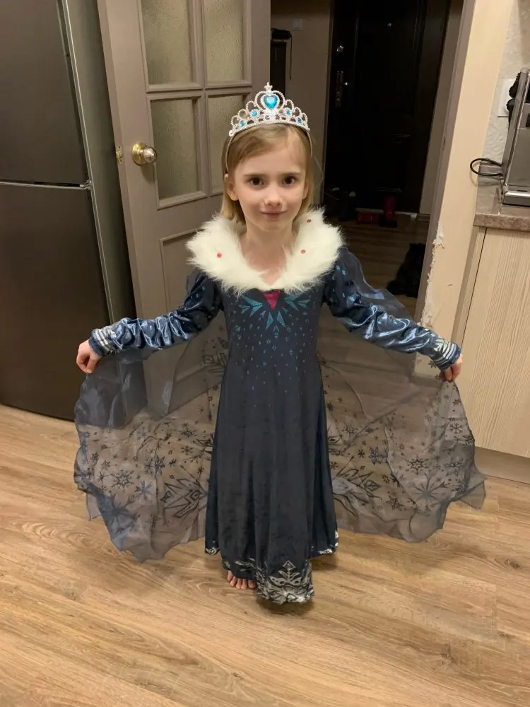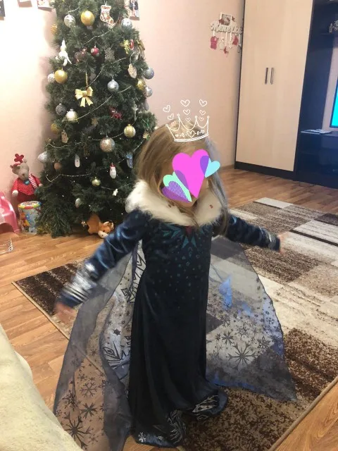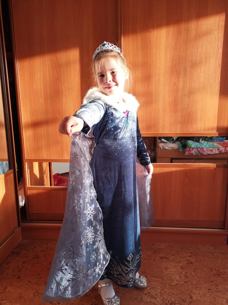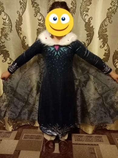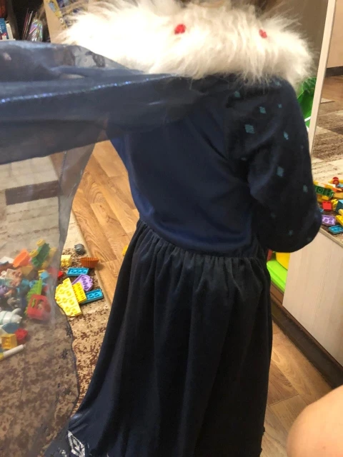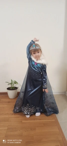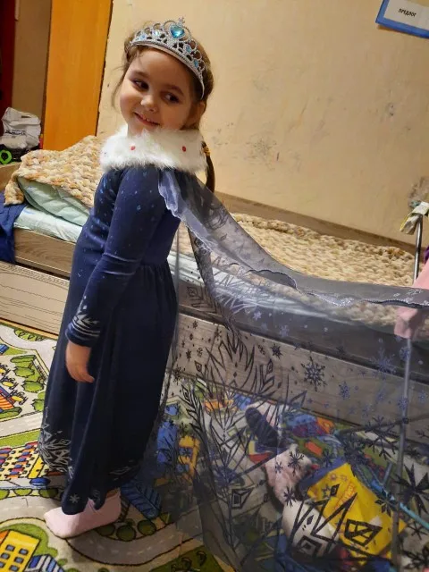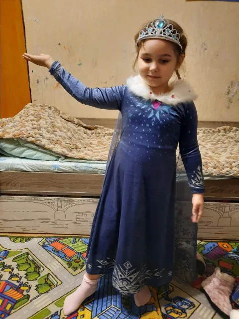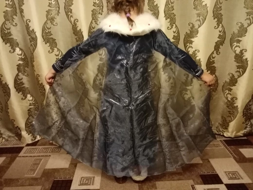 Платье очень понравилось!!! дочка снимать не хочет. Она очень худенькая и высокая -110 рост. На платье размер 120, получилось идеально)) не висит мешком, есть небольшой запас, но и так носить уже можно. Накидка чуть пол задевает. Единственное, что смущает - это то, что мех кожу немного щекочет, она чешет. об этом я не подумала, когда заказывала, конечно... ну и камень в виде сердца большой на короне отвалился сразу, как из пакета достали. придется клеить. Да и сама корона пришла в разобранном виде. нужно согнуть и зацепить на штырьки ободка. их только 2 по краям, поэтому, когда на голове носишь, она немного отходит от обода (на последнем фото видно). Пришло в срок, с продавцом не общалась.