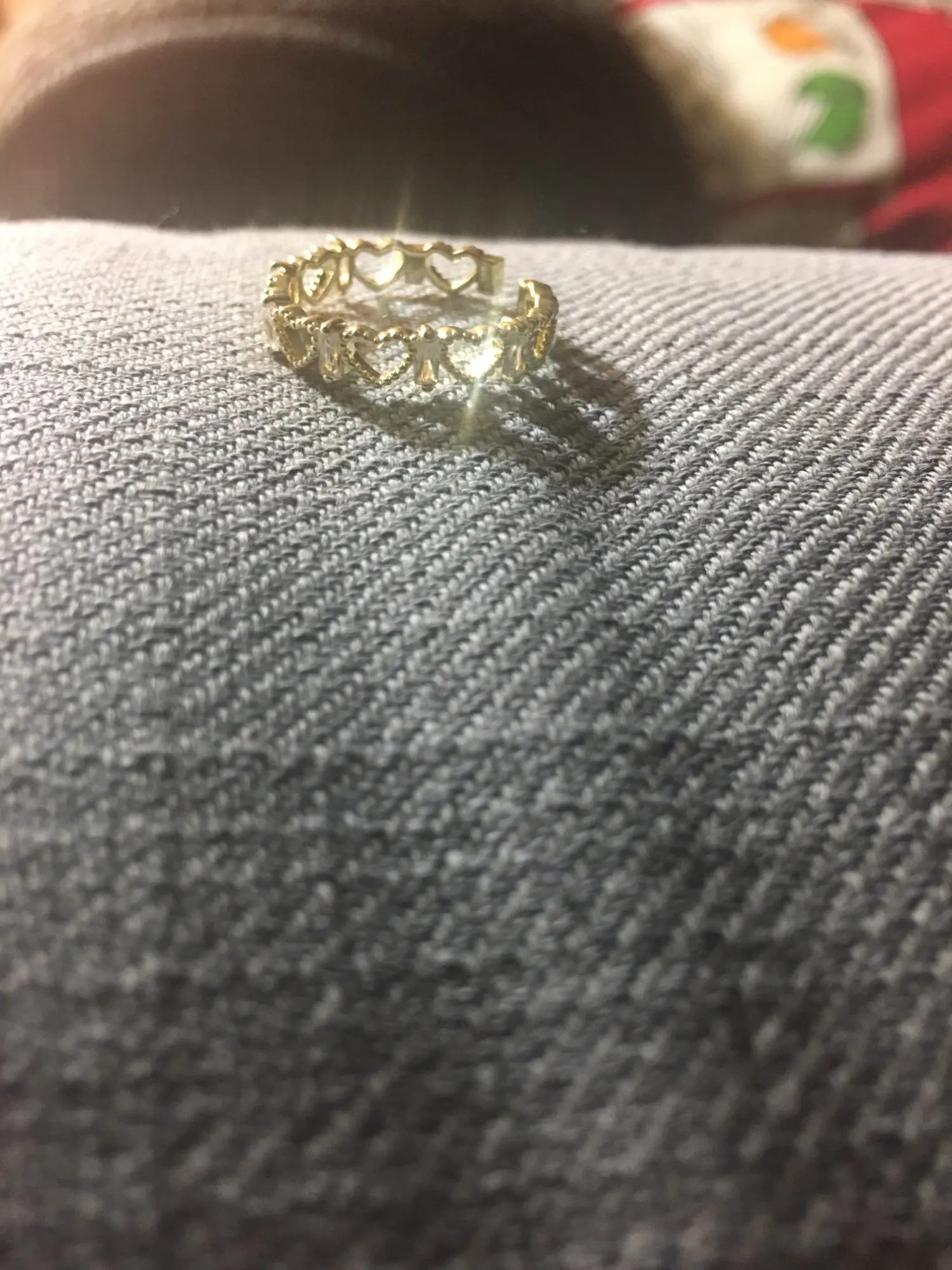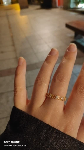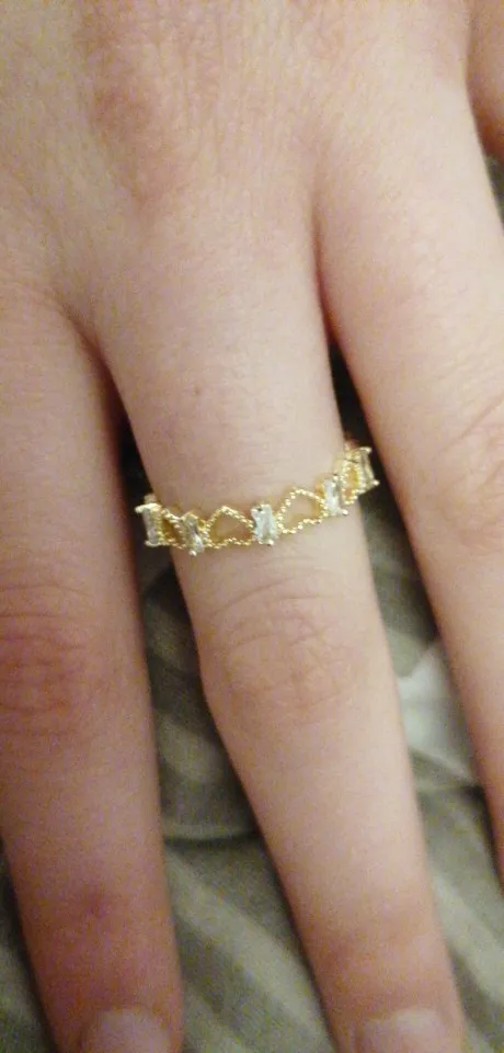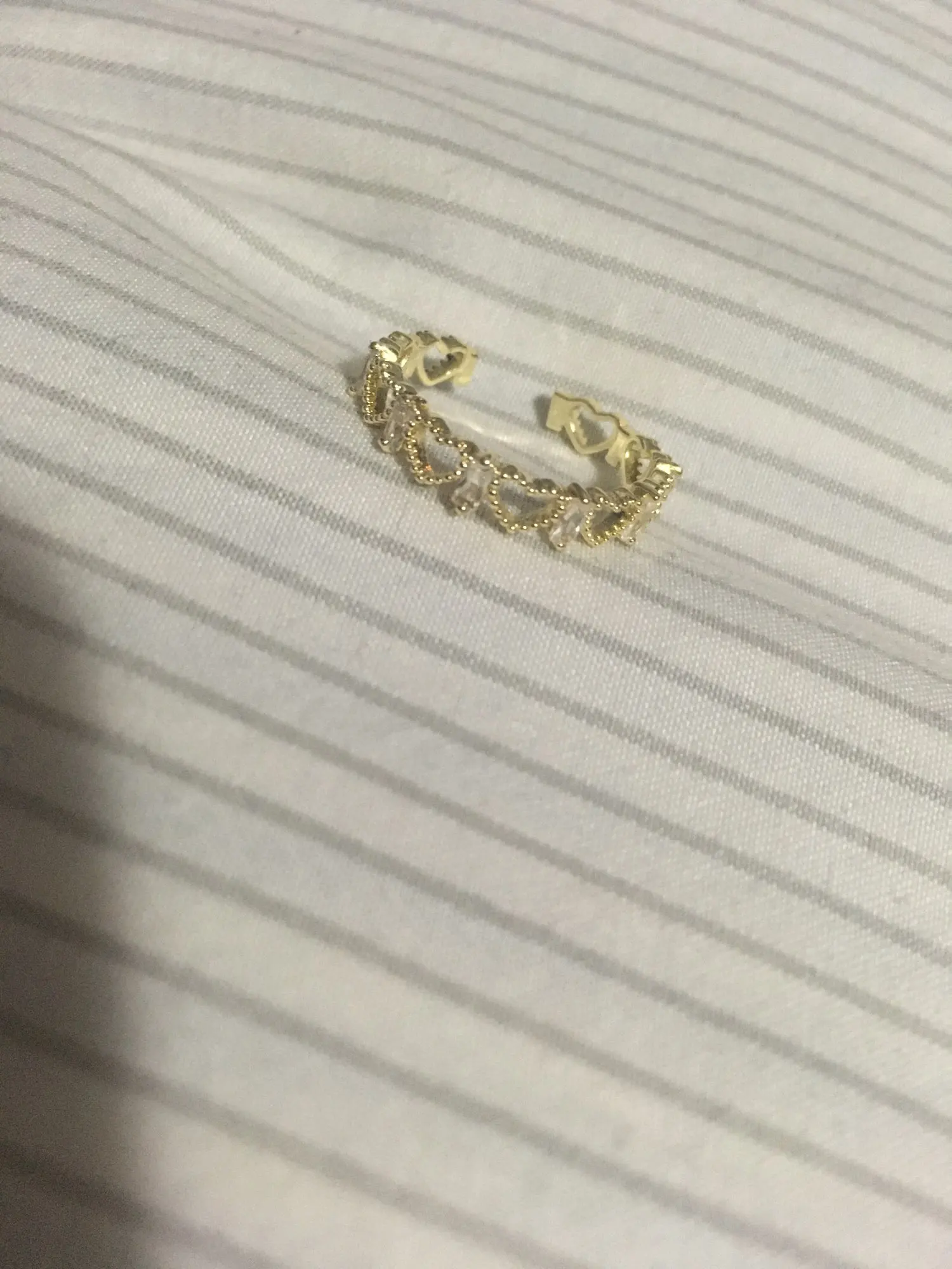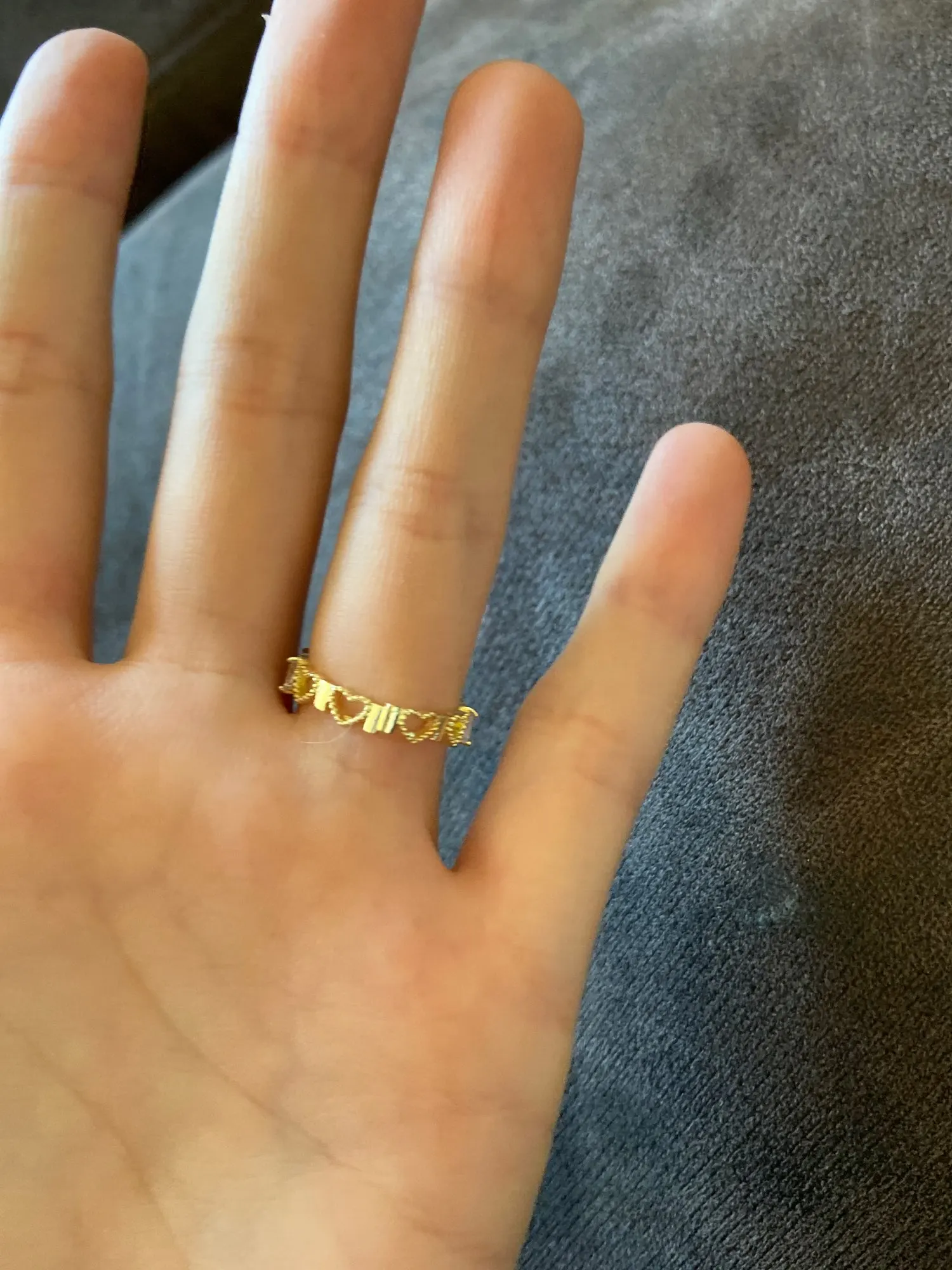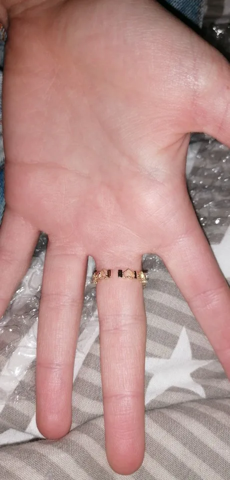 Он выглядит немного отличается от изображения, но все равно выглядит так мило. Цвет более желтый, чем золотистый idk. Просто он выглядит идеально на картинке. Подходит для каждого размера пальца, потому что он регулируется, который мне очень нравится. Милый