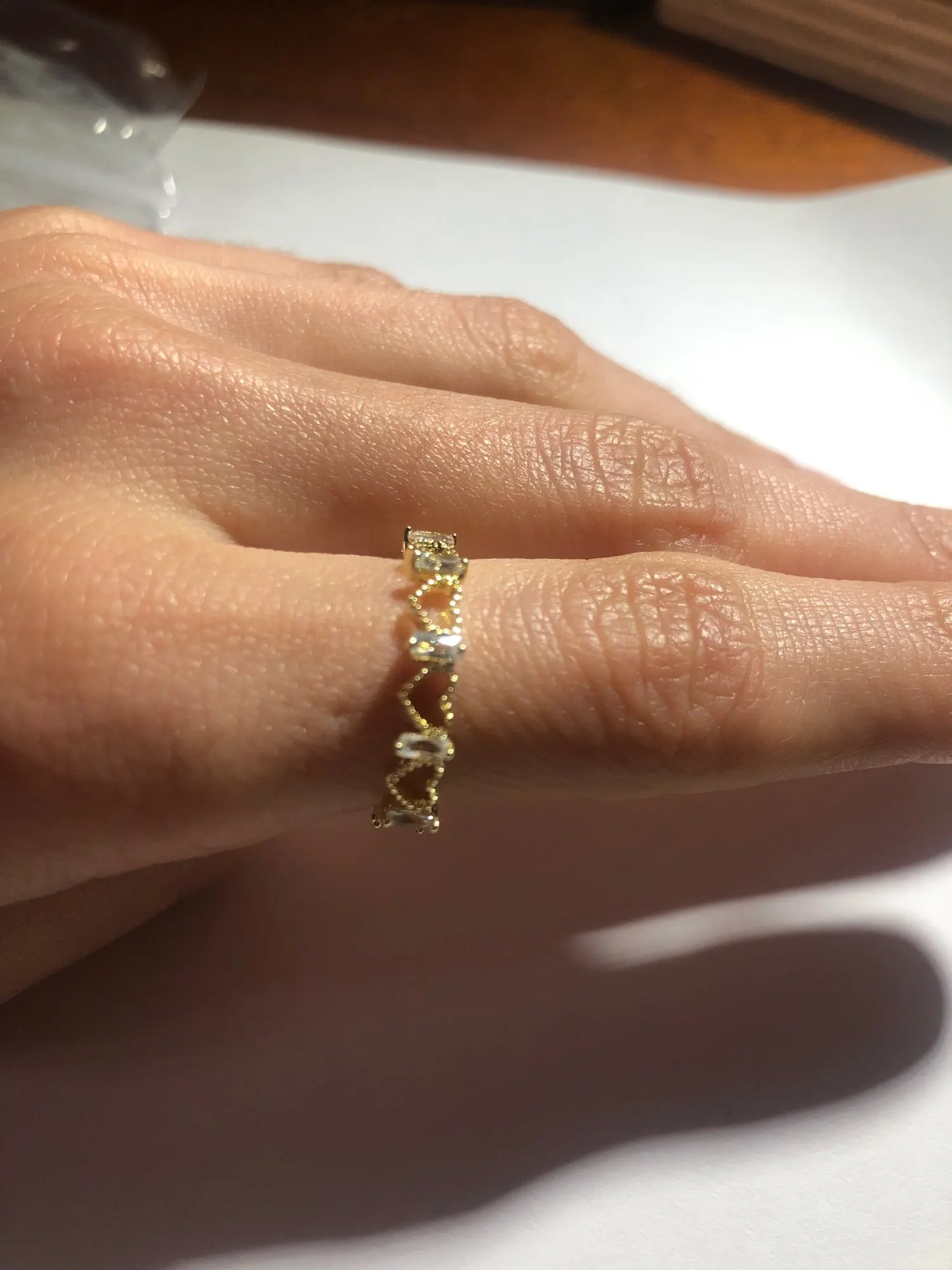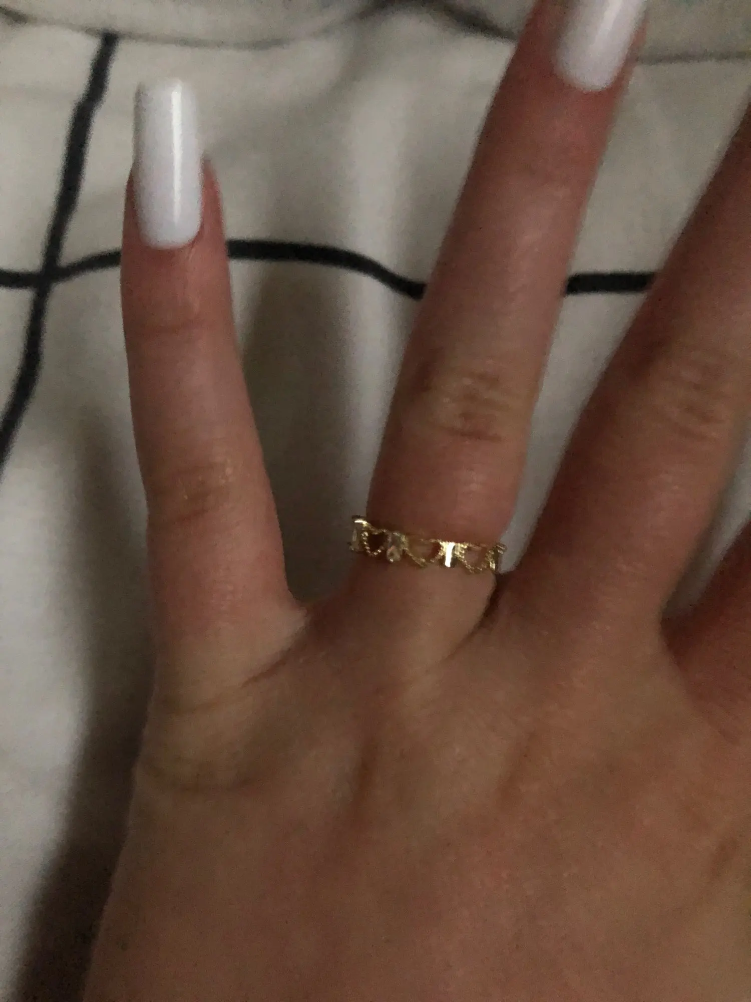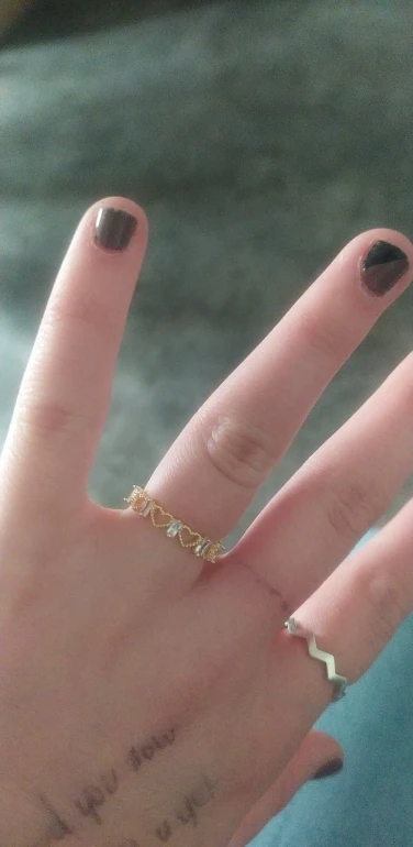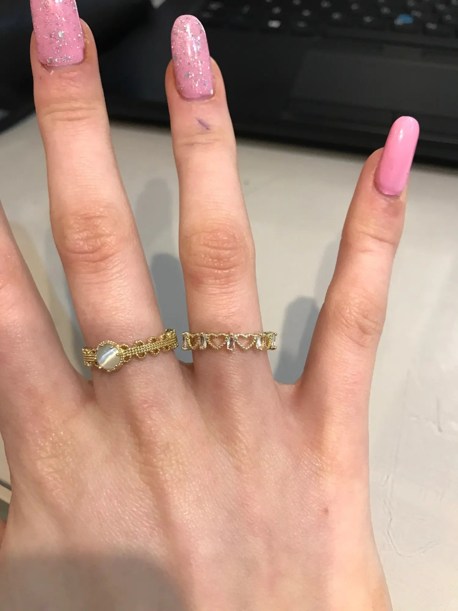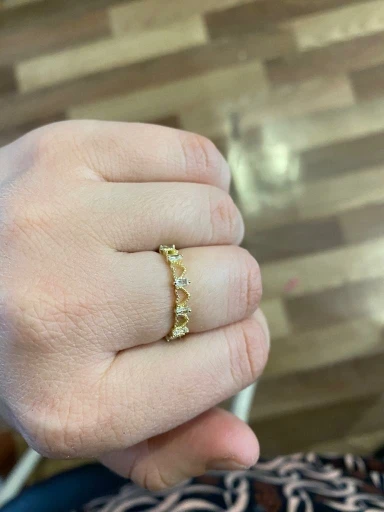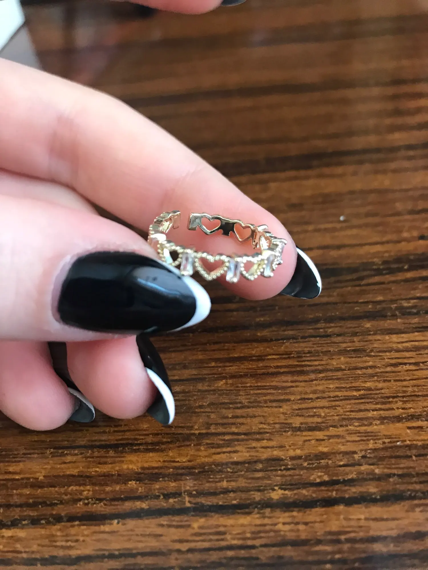 Он выглядит немного отличается от изображения, но все равно выглядит так мило. Цвет более желтый, чем золотистый idk. Просто он выглядит идеально на картинке. Подходит для каждого размера пальца, потому что он регулируется, который мне очень нравится. Милый