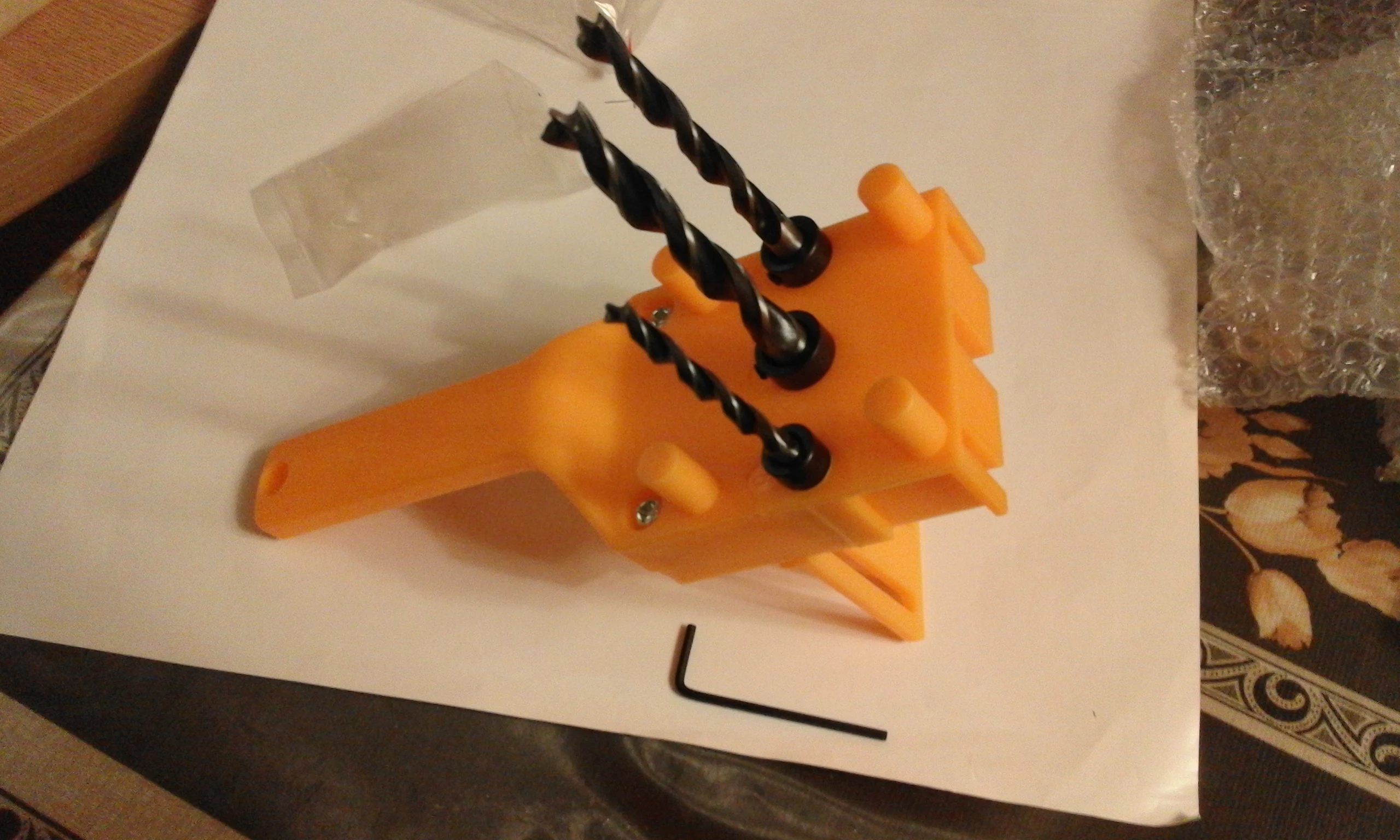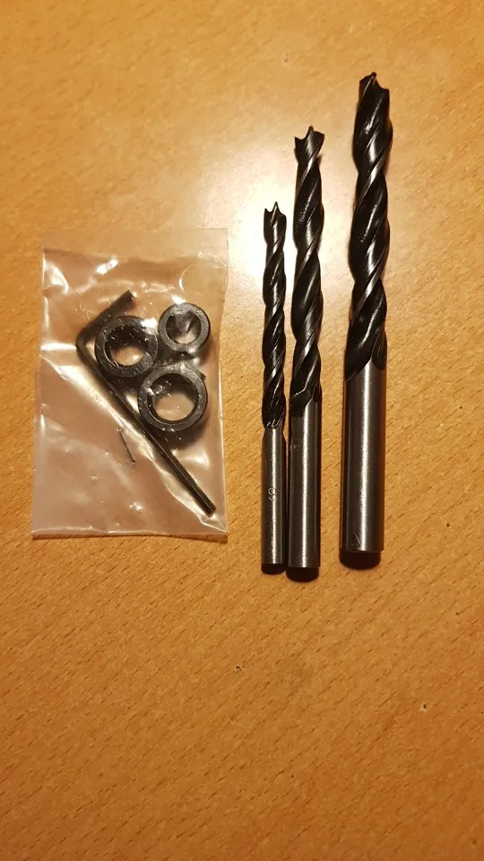 Очень удобно делать отверстие под шканты, рукой сложно просверлить вертикально. Свёрла пока не проверял, но по виду надолго их не хватит.