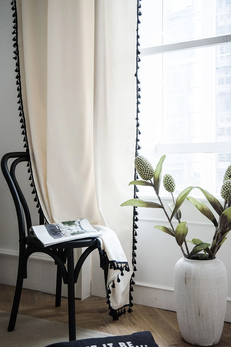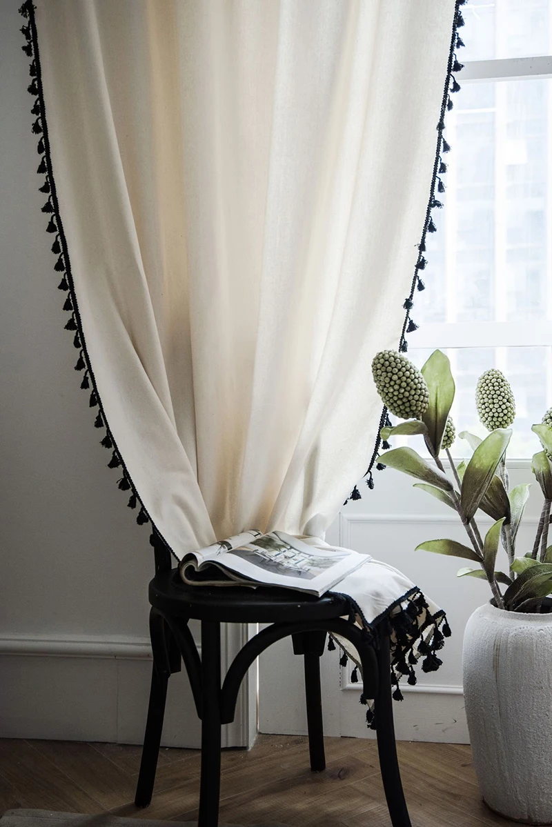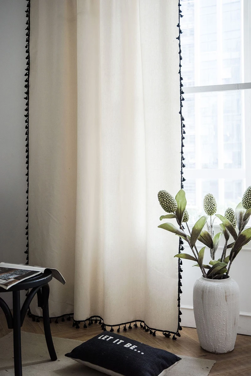 Хлопок, лен, занавеска для спальни, гостиной, бохо, американский стиль, сплошная занавеска s с черными кисточками, готовая оконная занавеска s