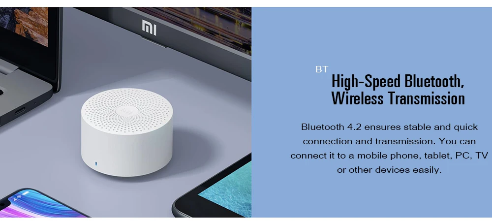 Основные характеристикиБрендXiaomiДизайнМини, портативный, стильныйСовместим сПланшетный ПК, ПК, мобильный телефон, компьютер, ноутбукПоддержкаBluetoothПодключениеБеспроводнойИнтерфейсМикро-usbИсточник аудиоУстройства с поддержкой BluetoothТехнические параметрыВерсия BluetoothBluetooth 4,2ПротоколA2DP,AVRCP,HFPРасстояние передачиW/O препятствия 10 мКоличество динамиков1.Звуковой каналДвухканальный (стерео)Выходная мощность3 ВтFreq60 Гц-20 кГцS/NНе менее 80 дБДругие параметрыЕмкость аккумулятора480 мАчВремя зарядки2hВремя работы4 - 5 чДлительное время20 днейИнформация о батарееТип батареиВстроенный литий-ионный аккумуляторРазмеры и весВес продукта0,0520 кгВес посылка0,1500 кгРазмер продукта (Д x Ш x В)6,00x6,00x7,00 см/2,36x2,36x2,76 дюйм (ов)Размер посылка (Д x Ш x В)10,00x10,00x9,00 см/3,94x3,94x3,54 дюймаСодержимое посылкаСодержимое посылкаДинамик-1 шт., ремешок-1 шт., руководство пользователя-1 шт.