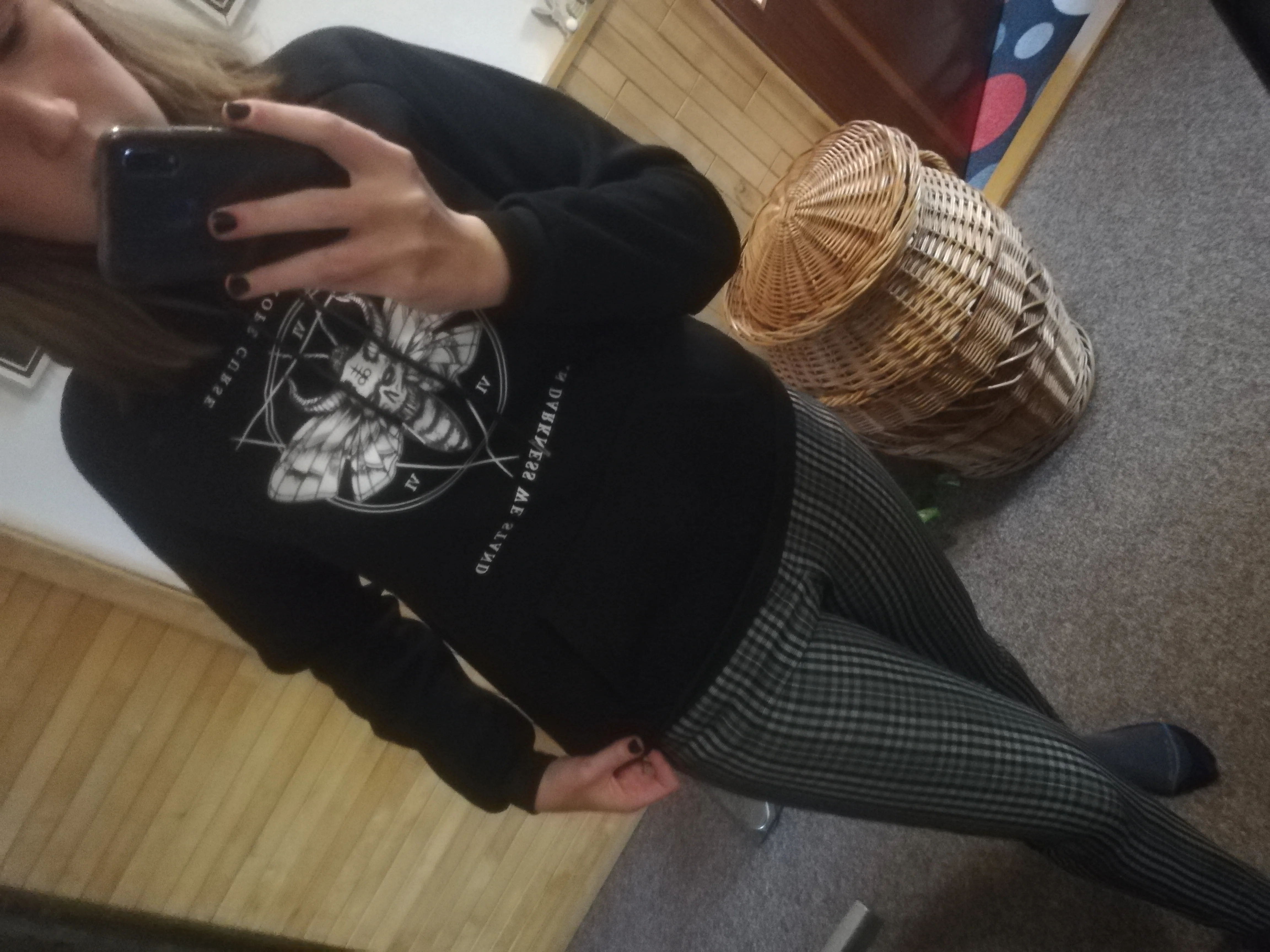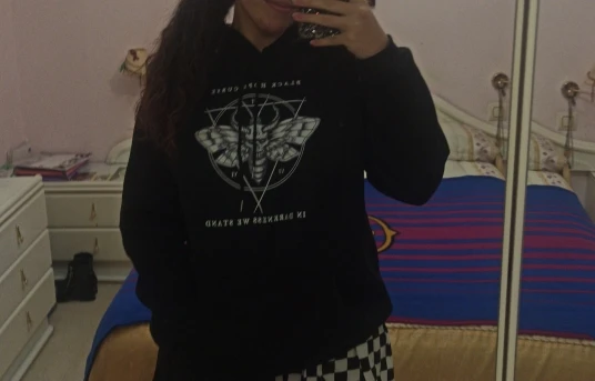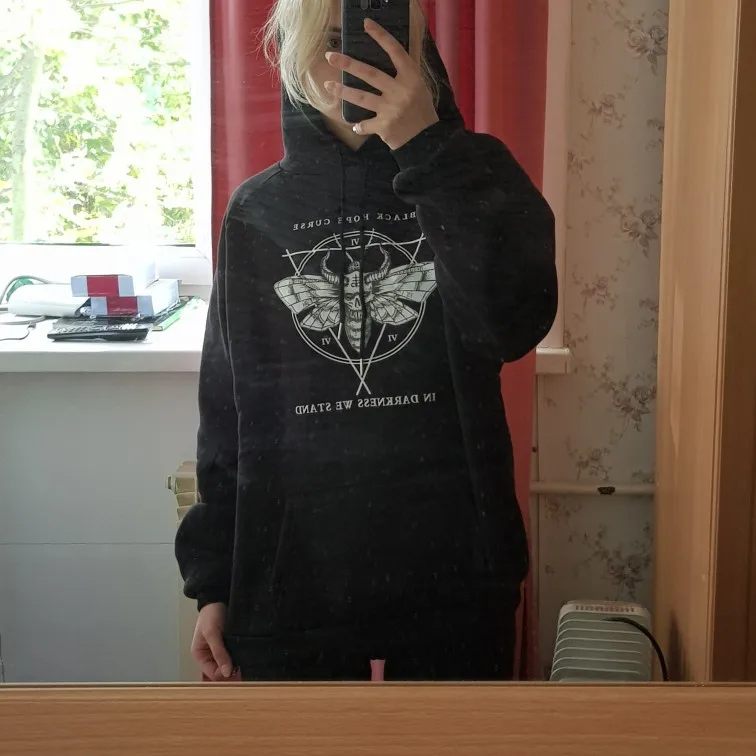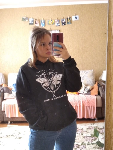 Кофта крутая! Хоть рисунок больше как наклейка, он очень чёткий и качественный. Ткань не такая толстая, как я думала, но вполне норм. Взяла размер М, хотя ношу XS и не пожалела! Как раз село, что надо)
