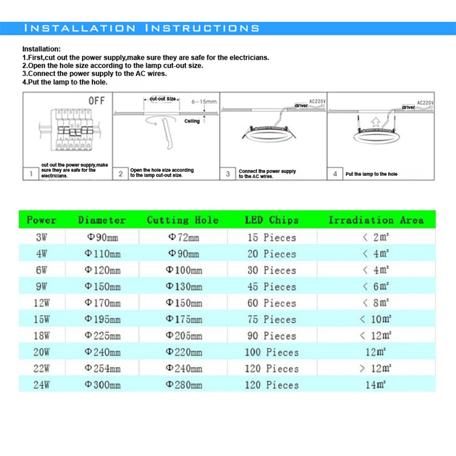 Мощность: 3 Вт, 4 Вт, 6 Вт, 9 Вт, 12 Вт, 15 Вт, 18 Вт, 20 Вт, 24 Вт.