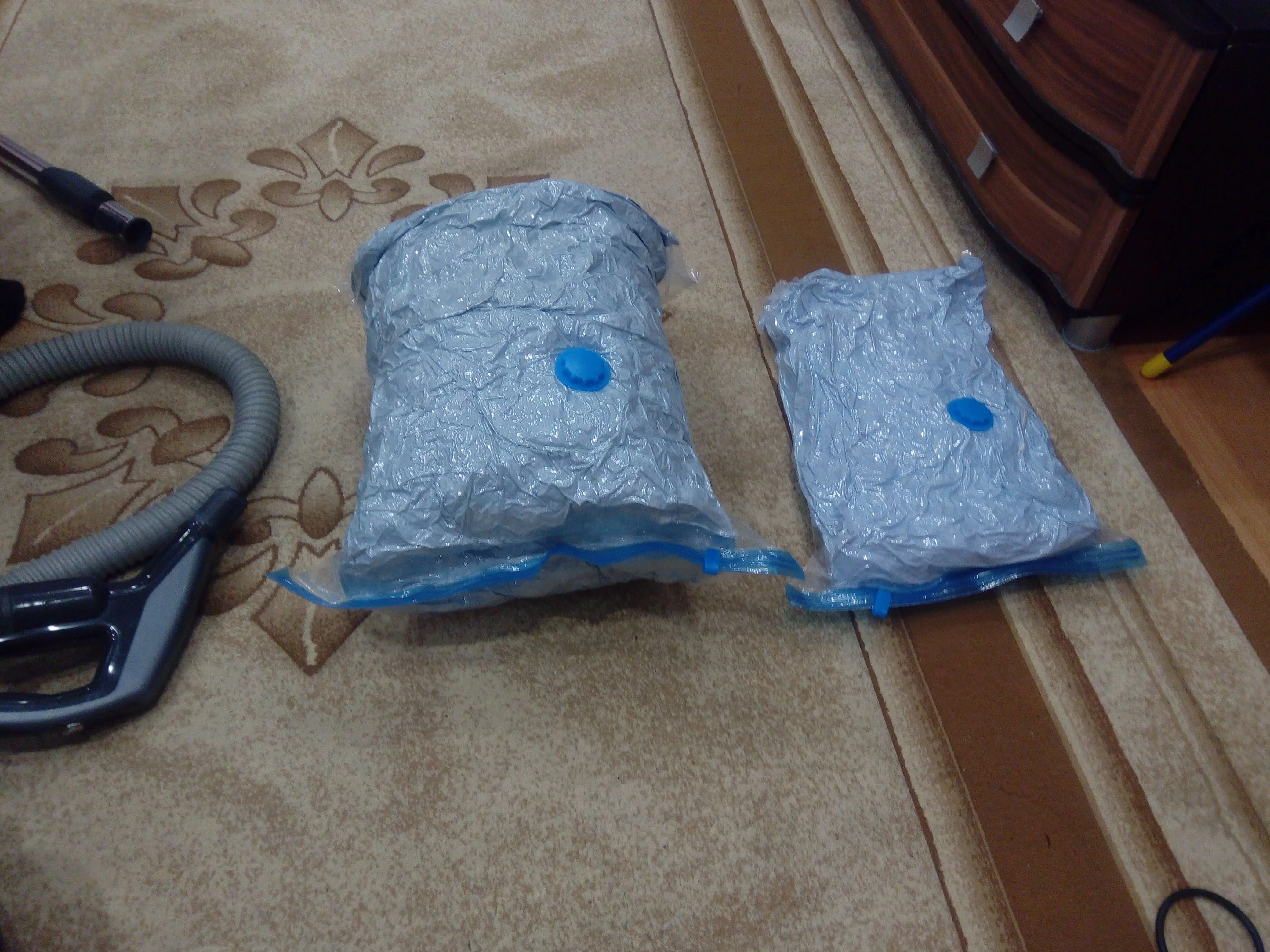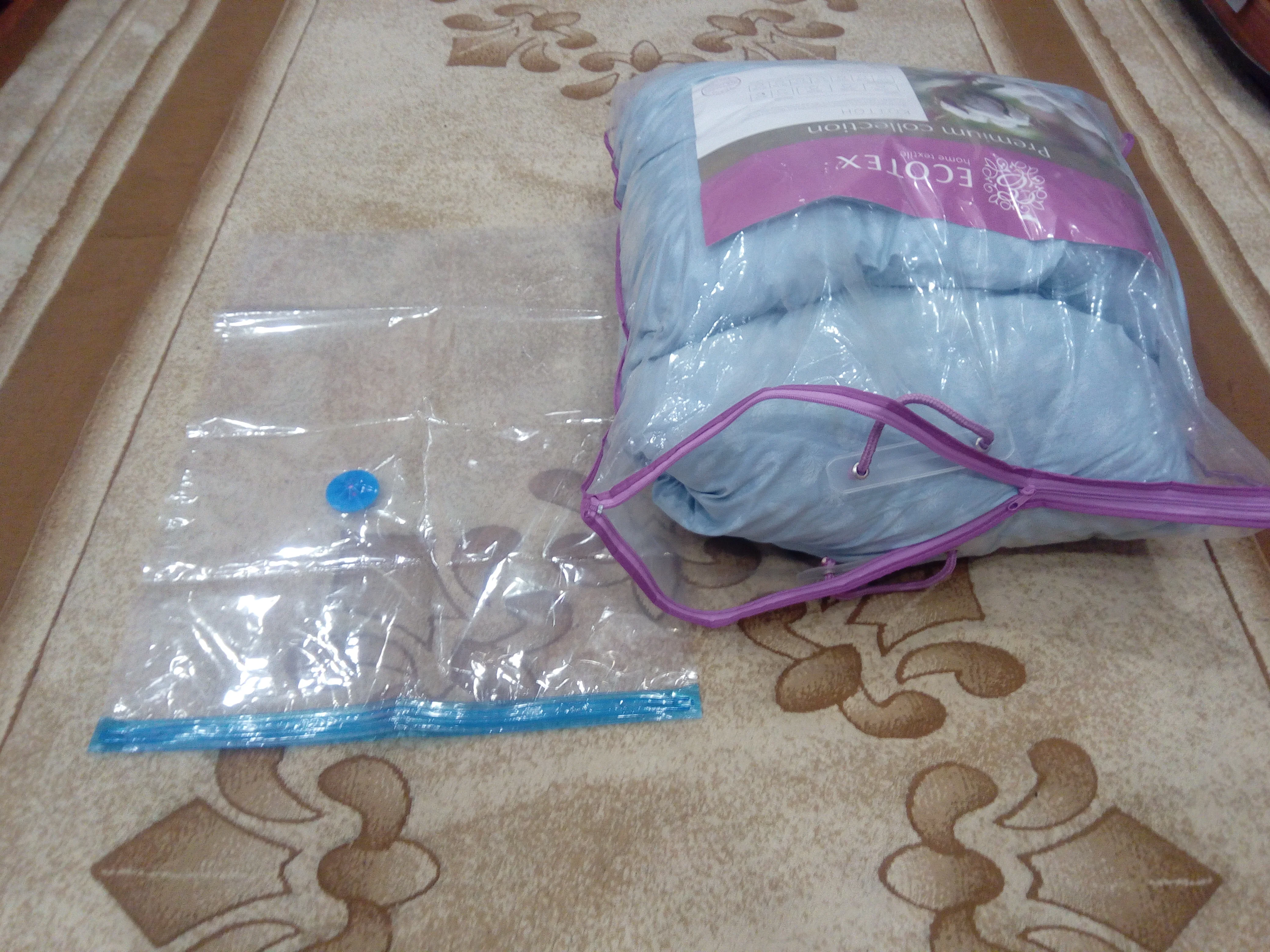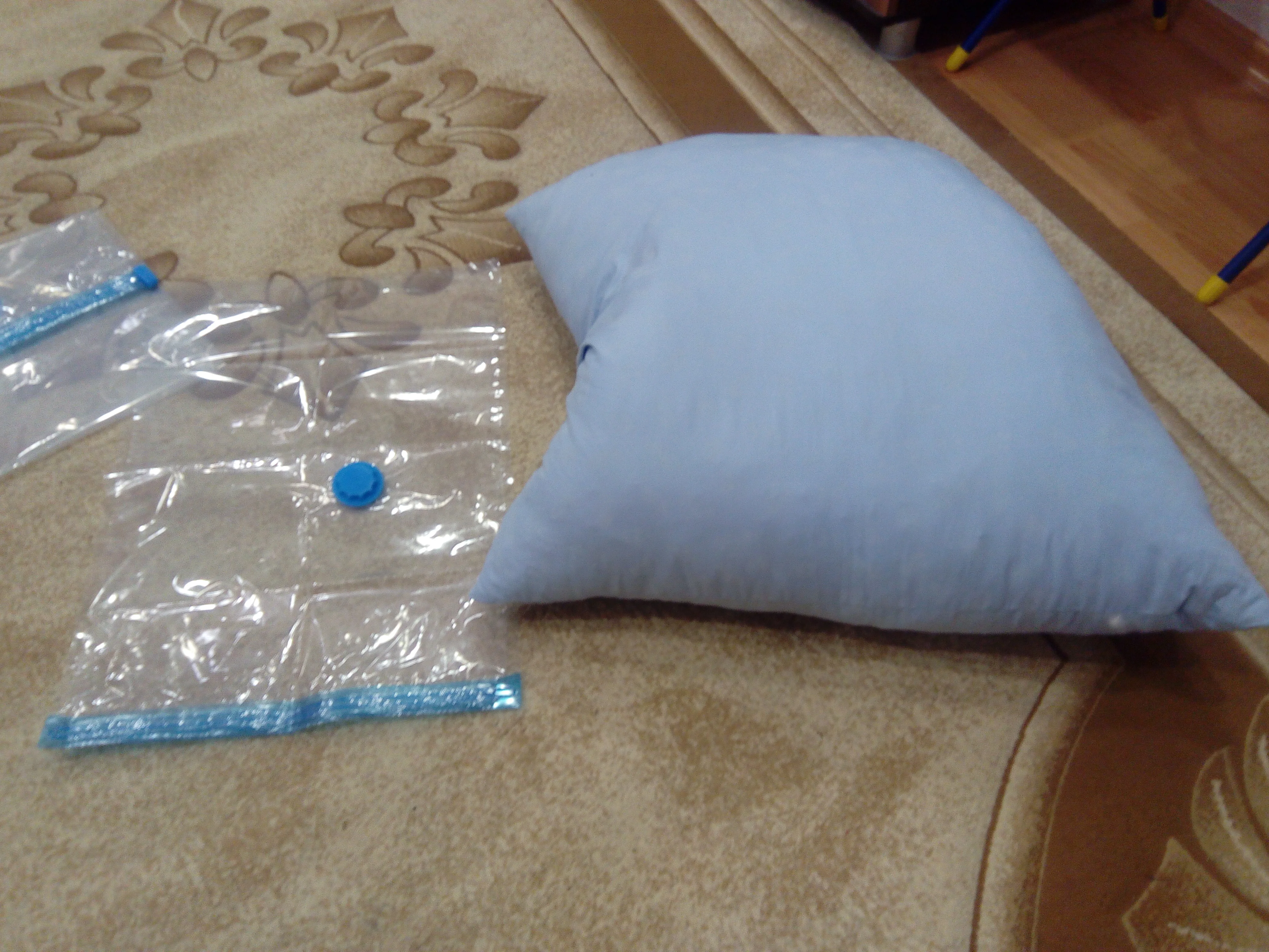 Заказал 2 мешка разных размеров. Доставка - вовремя. Каждый мешок на фото с той подушкой, которую в него упаковал. Последнее фото сделано через месяц после упаковки. Воздух не пропускает, всё хорошо. p.s. Для такого размера вещей, нужно брать мешок на размер больше. Зря сэкономил, Еле впихнул.
