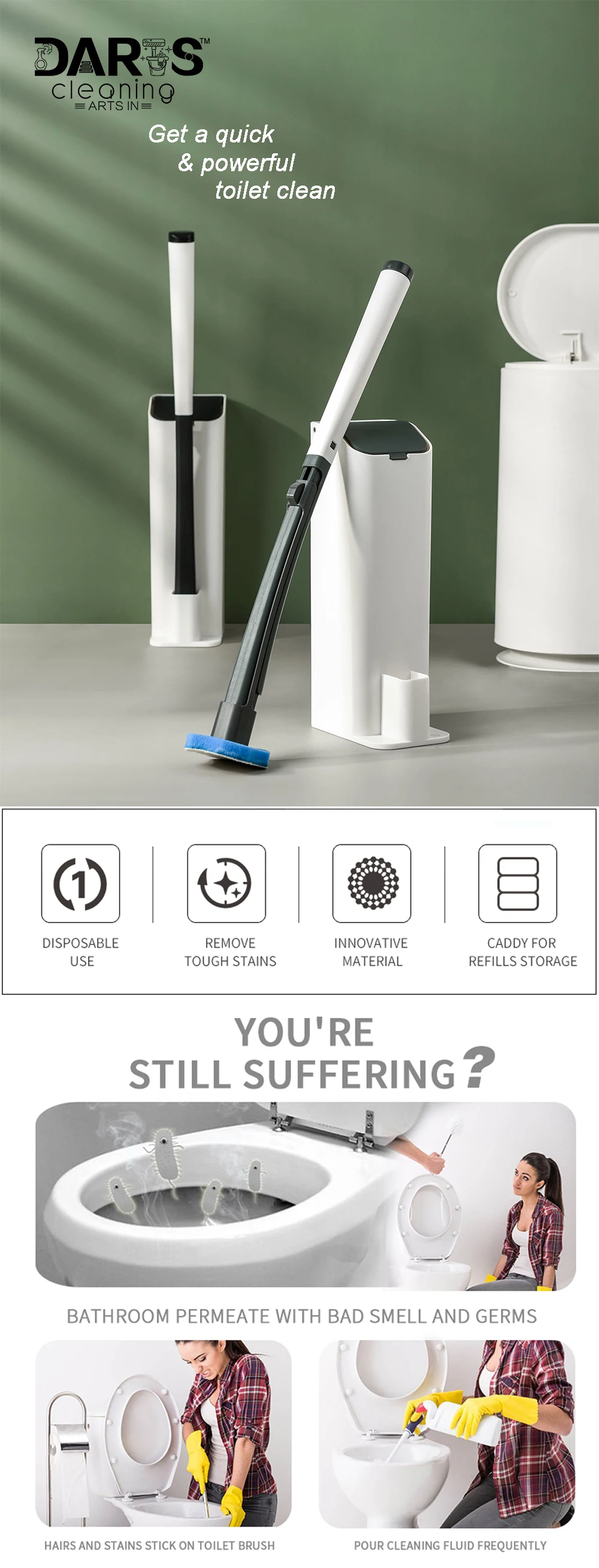 Система очистки туалета:Добавьте этот очиститель для унитаза в свои принадлежности для уборки, включая 1 туалетный столик, 1 контейнер для хранения и 6 одноразовых туалетных принадлежностей для заправки и 3 бонусных заправки, которые убивают 99.9% бактерий и вирусов; Упаковка может отличатьсяОдноразовые губки:Эти насадки для туалетного скраба нажимают на туалетный столик, чтобы скрутить, очистить и очистить унитаз и удобно выскочить, чтобы бросить в мусорное ведроДезинфицирующий очиститель:Предварительно загруженный сильным очистителем, эти одноразовые очистительные прокладки глубоко очищают и удаляют пятна, устраняя микробы, чтобы ваша Туалетная чаша почувствовала себя новойЧистящие средства для ванной:Избавьтесь от необходимости хранить грязную, прикованную к зародышам туалетную щетку с удобной caddy, которая хранит ваши туалетные принадлежности и наполняет головки для универсального уборщика ванной комнатыСкруббер для унитаза:Шестигранная губчатая головка очищается в труднодоступных местах под ободом чаши и сливается для более глубокой и быстрой очистки для удаления ржавчины, пятен кальция и извести