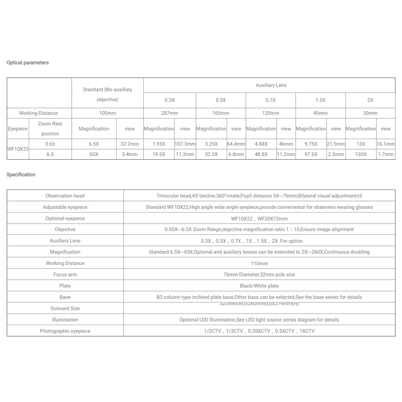 ФункцияОкуляр: WF10X22Положение зума: 0,65-6.5xУвеличение: 6,5x-65xВид: 32,2 мм-3,4 ммРабочее расстояние: 110 ммНаблюдательная головка: снижение на 45 °, Поворот на 360 °, Расстояние зрачка 54-76 мм; Двусторонняя визуальная Регулировка ± 5Регулируемый окуляр: Стандартный WF10X22, широкоугольный окуляр с высоким углом, обеспечивает удобство для наблюдателей в очкахЦель: 0.65X --- 6.5X диапазон зума, соотношение объективного увеличения 1:10, обеспечить выравнивание изображенияВспомогательный объектив: 0.5X,2XУвеличение: Стандартный 6.5X --- 65X, дополнительные и вспомогательные линзы могут быть расширены до 3.25X --- 130X, непрерывное двойное увеличение
