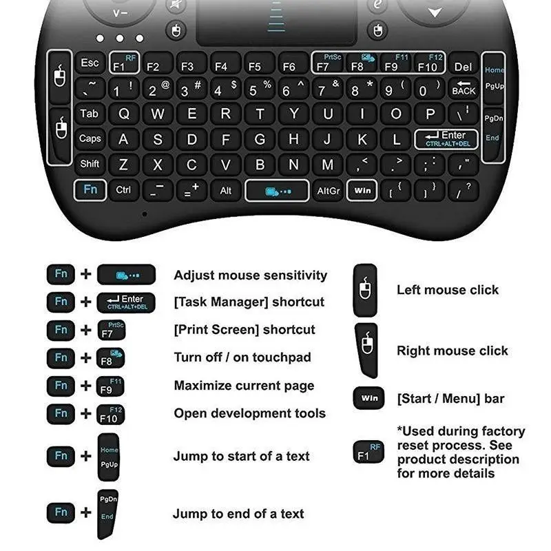 Системные требования: 1. Windows 2000 / Windows XP / Windows Vista, Windows CE, Windows 7 2.Linux (Debian-3.1, Redhat-9.0 Ubuntu-8.10 Fedora-7,0 Протестировано) 3.Android 1,92 клавиш (74 стандартных клавиши + 18 мультимедийных клавиш) 2. Встроенный беспроводной приемник 2,4G 3. DPI можно регулировать 4 страничные функциональные клавиши вверх и вниз 5 функциональных клавиш левой и правой мыши Характеристики Товара: 1. Размер: 146,8 × 97,5 × 19 мм 2. Рабочее расстояние: 15 м 3. Мощность передачи: + 5 дБ 4. Рабочее напряжение: 3,3 В 5. Рабочий ток: <50 мА 6. Зарядный ток: <ма 7. Ток сна: <1 мА Инструкции: 1. Один палец представляет собой левую кнопку мыши 2. Два Пальца скользят вверх и вниз, чтобы повернуть вверх и вниз 3. Три пальца одновременно щелкают правой кнопкой мыши * В левом верхнем углу можно настроить предыдущую и следующую музыку, паузу, отключение звука и уровень звука. В правом верхнем углу есть четыре клавиши направления и ключ подтверждения. * Конструкция с двойной левой и правой кнопками мыши, более удобная работа;