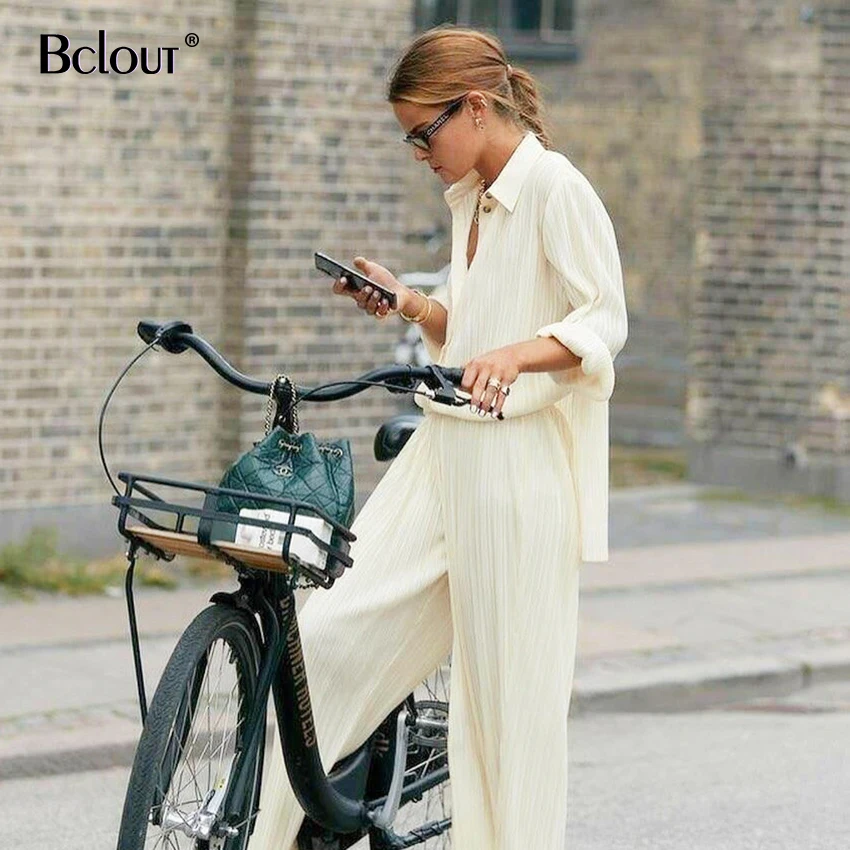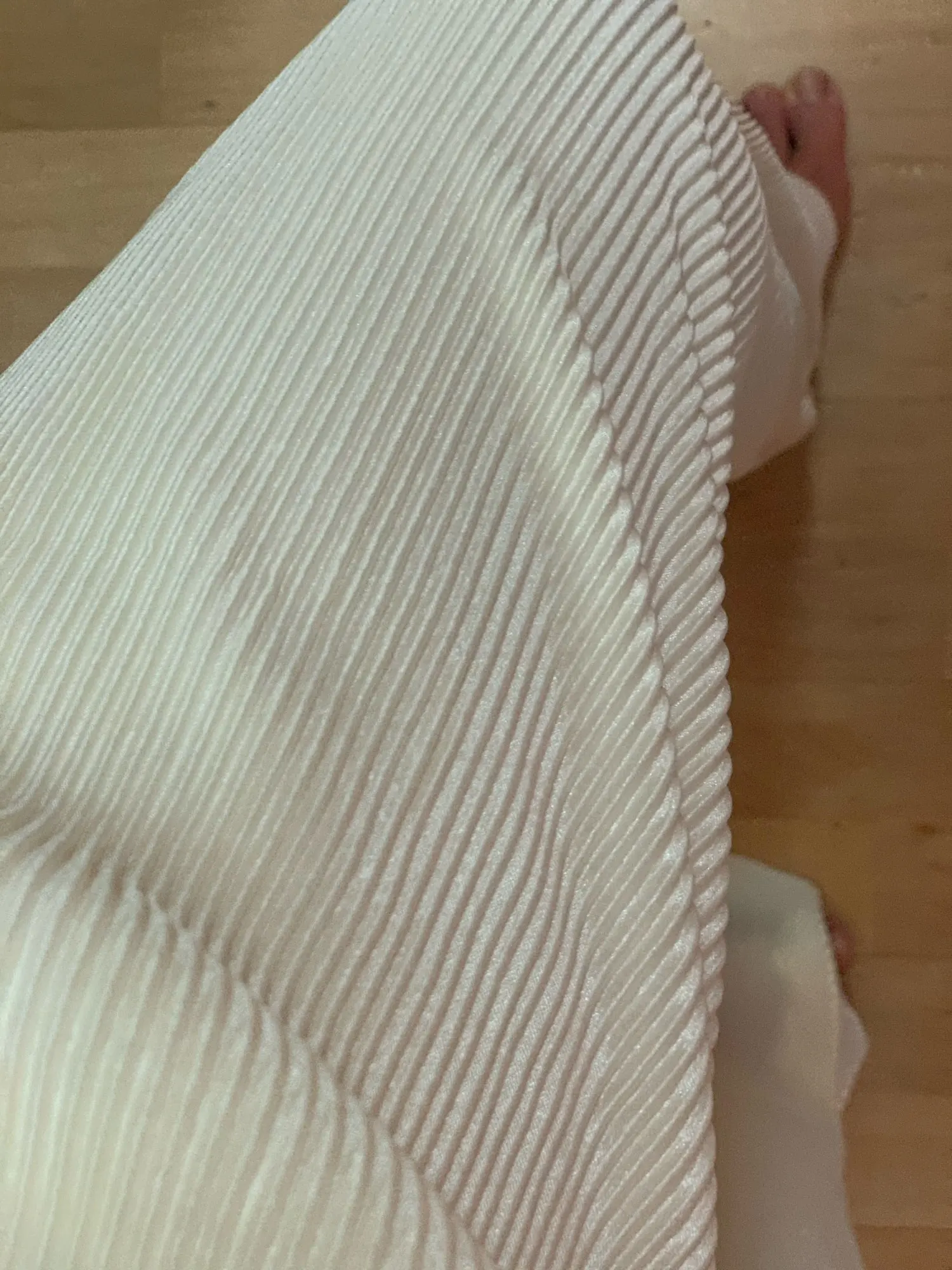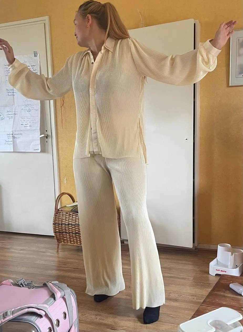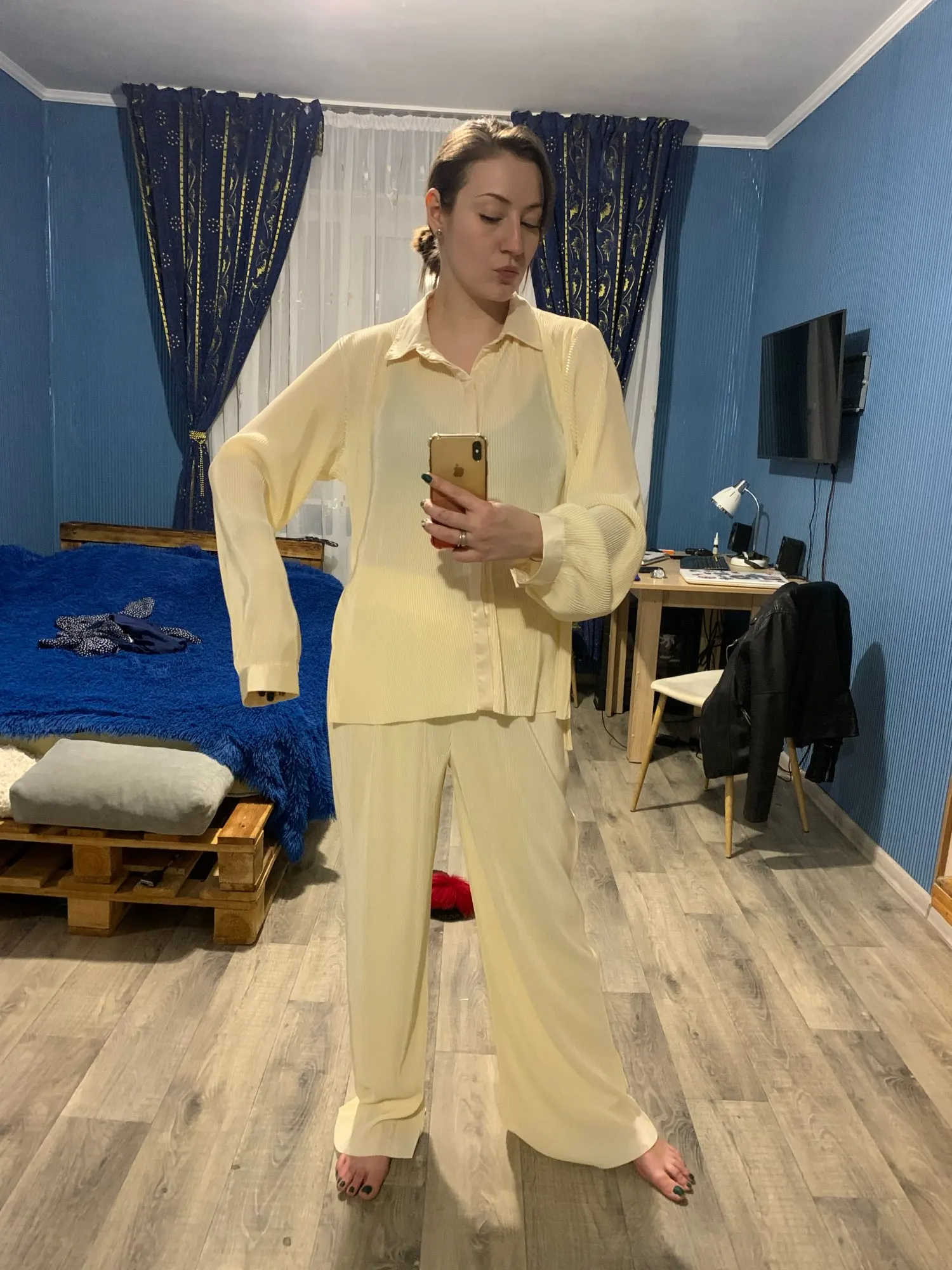 Я мечтала об этом костюме и не зря! Очень красивая ткань цвета шампанского, плотная, переливается, очаровательное ретро плиссе! Это больше на весну, не на жаркое лето. Мои параметры 175, грудь 98, талия 76, бёдра 98. Блуза огромная, рукава висят, ушью манжеты, но по плечам хорошо. Штаны если четко по талии, то будут короткие, не будет эффекта шлейфа, нужно спускать резинку под пупок. В восторге, чудесная вещь, берите не пожалеете, в Киев шло 20 дней