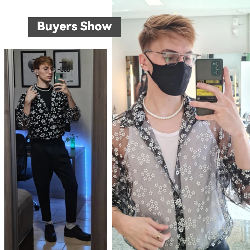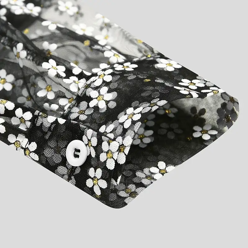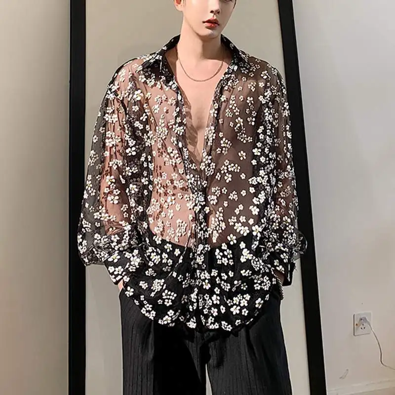 Рубашка сетчатая Мужская, прозрачная, с длинным рукавом, отложным воротником, с принтом, повседневная, S-5XL