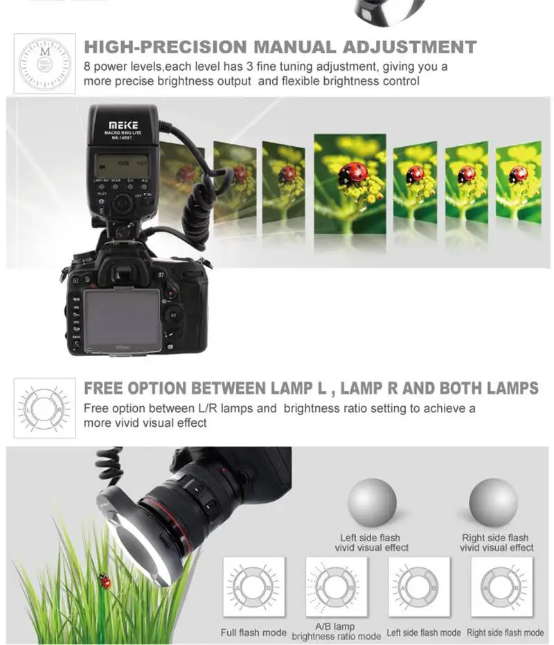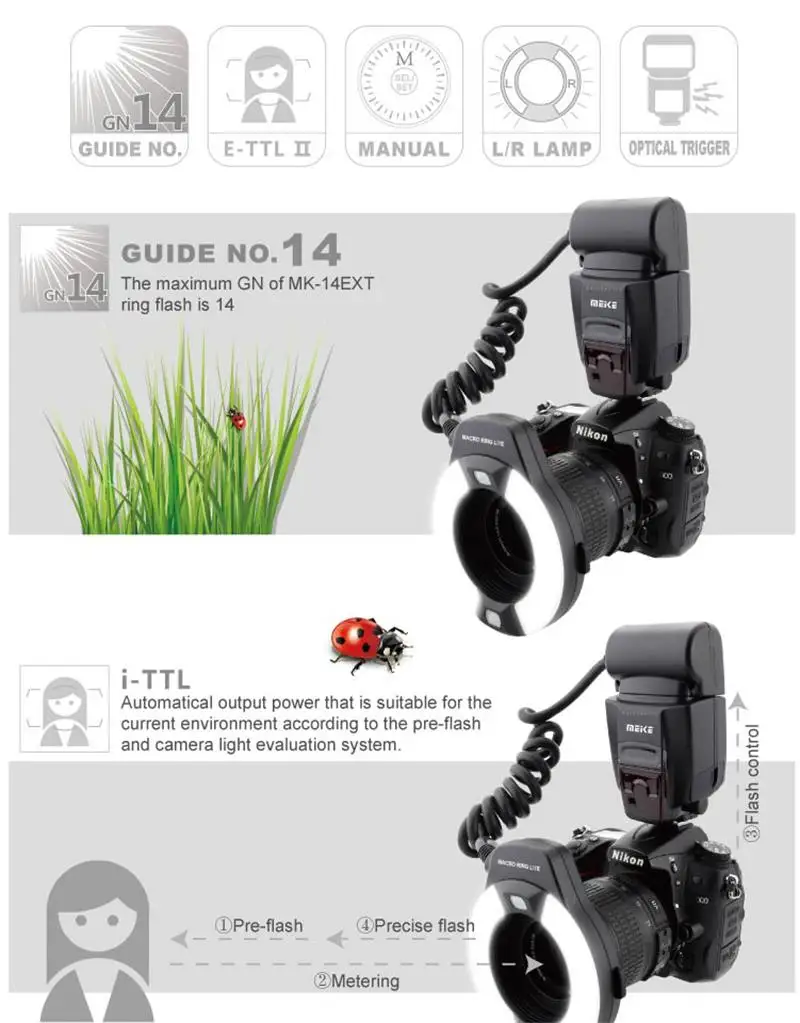 Основные функции:◆ MK-14EXT является циркулярной вспышкой, в основном используется для заполнения макросъемки. Может также использоваться для обычных портретов, когда заполняет светильник, до 5 м как хорошее расстояние.Поддержка:◆ TTL◆ Ручной режим◆ Несколько режимов◆ Синхронизация задней занавески◆ Лампа A/B