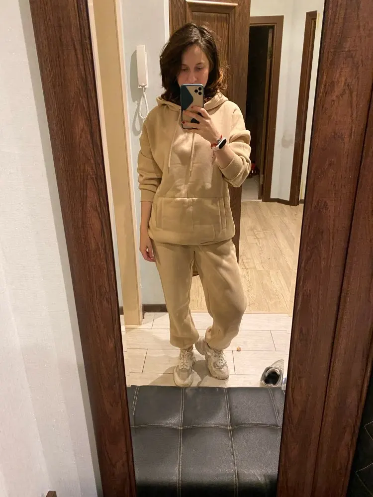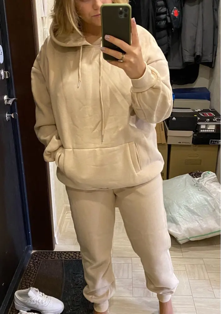 Отличный тёплый костюм, качественно сшит, приятный бежевый цвет, для прогулкой в холодное время самое то, особенно после тренировки :) доставили очень быстро. Но продавец не отвечает на сообщения, попросила поменять размер, но пришёл костюм размера, который изначально заказала. Очень жаль. Худи размера М на рост 159 оооооочень огромное, хотя штаны М на бёдра 95 см сели идеально!