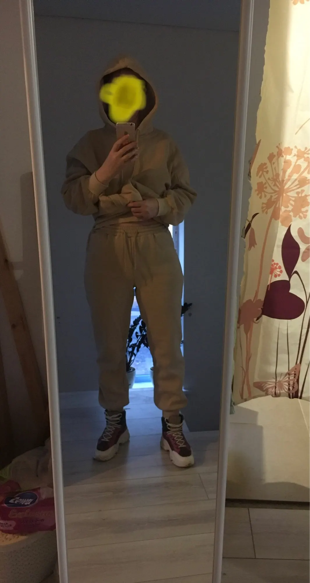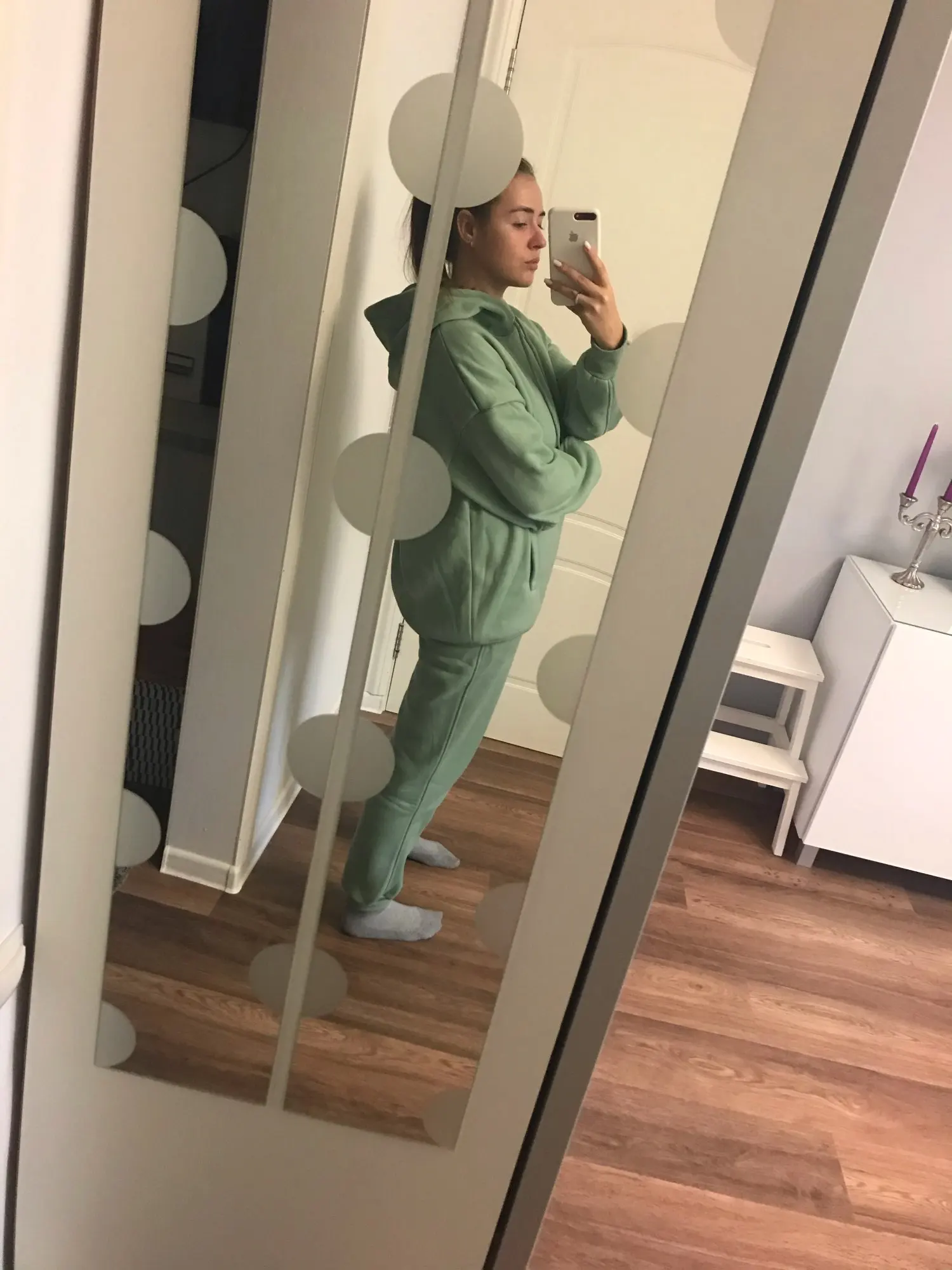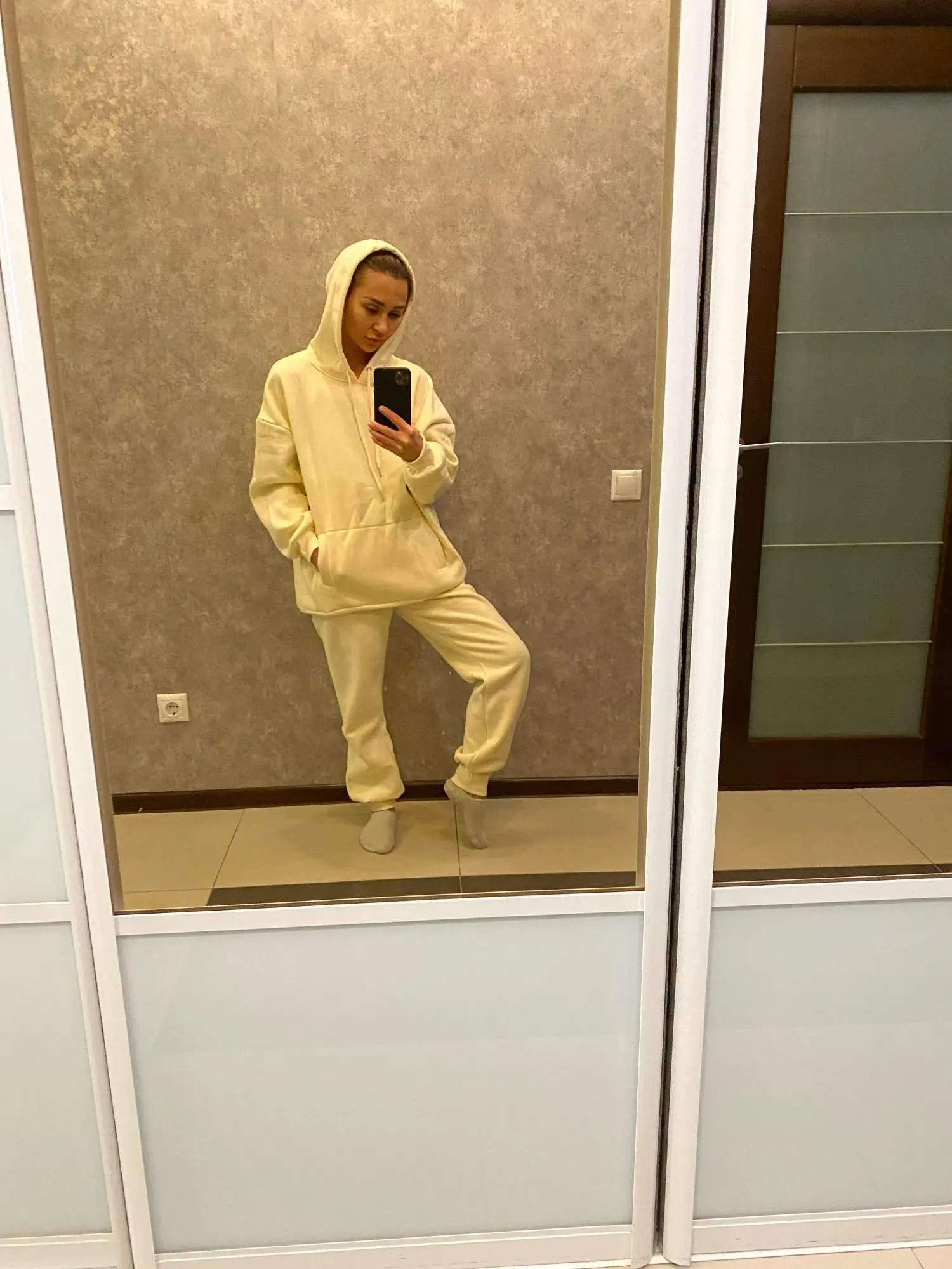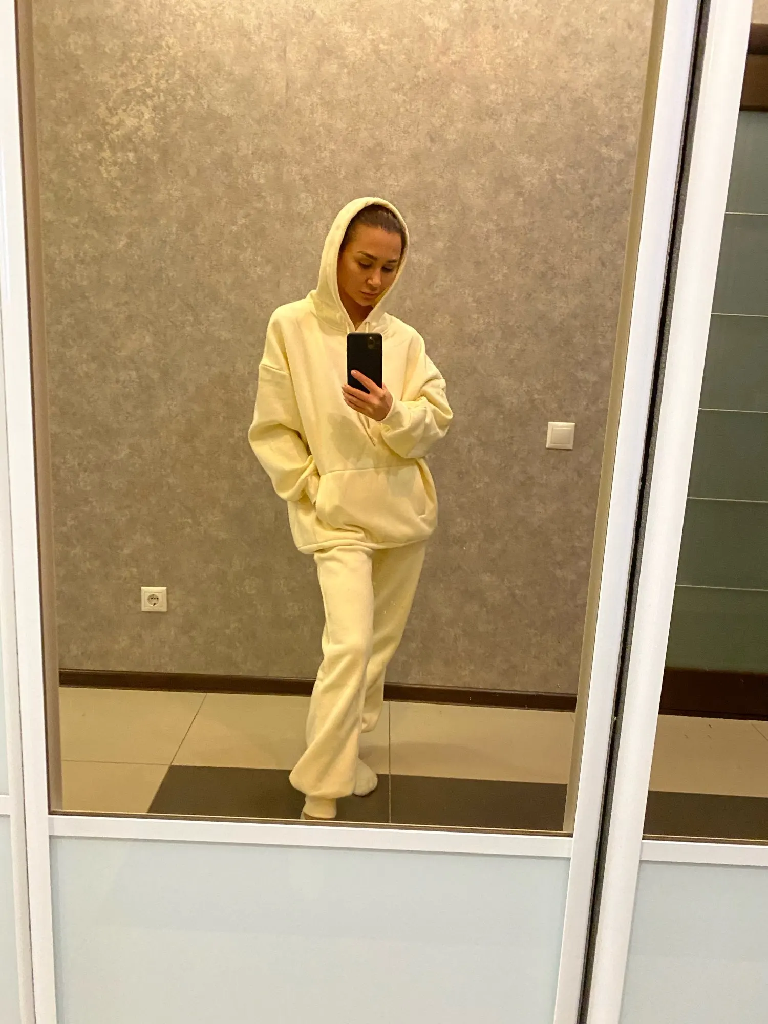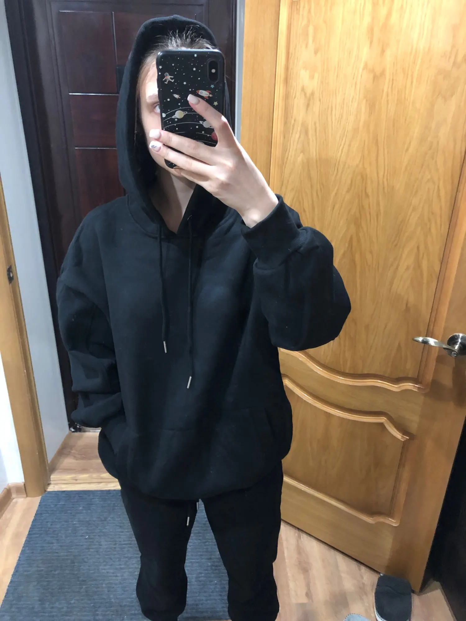 Отличный костюм, у меня уже есть два аналогичных худи - они идеальны. Дошёл до Москвы за неделю. Размер S сел оверсайз на 86-70-96, так и хотела. Продавец положил подарок.