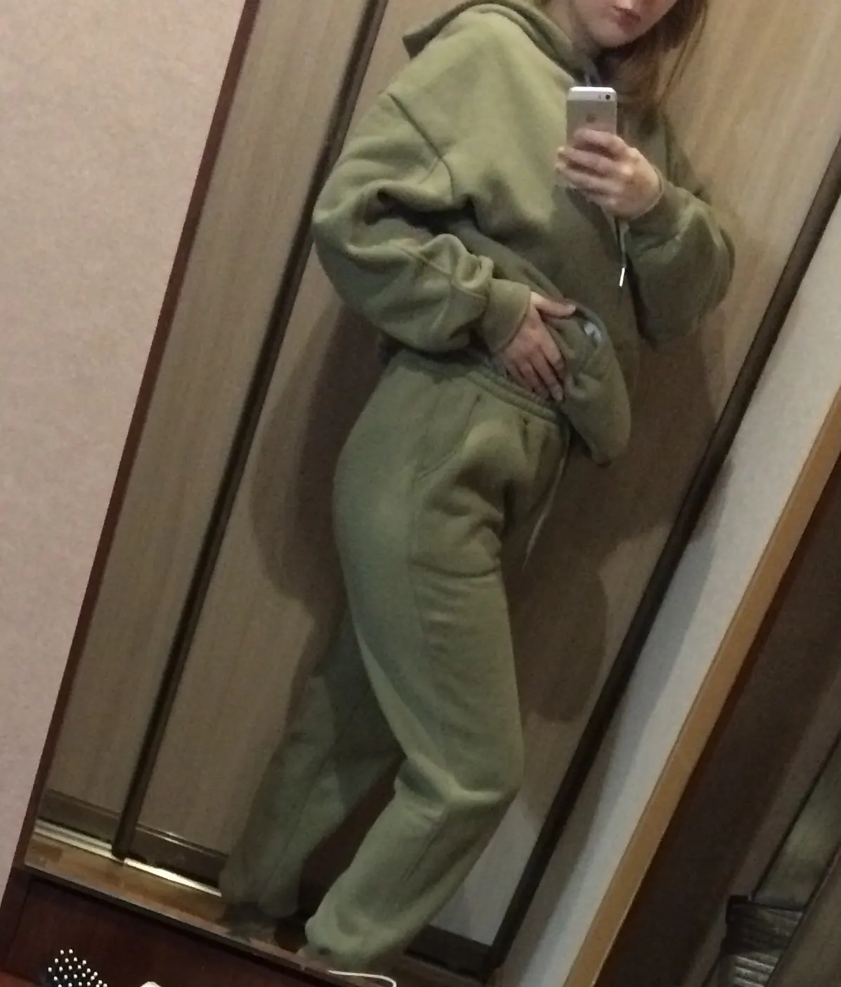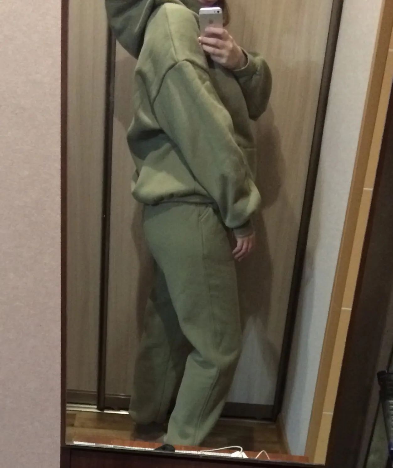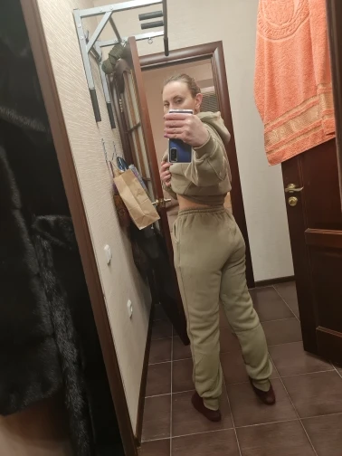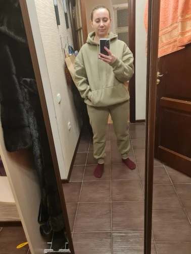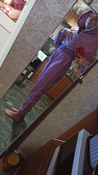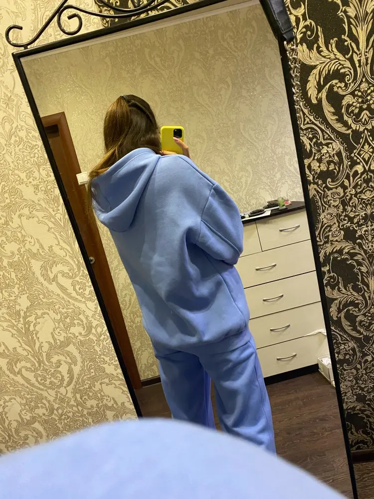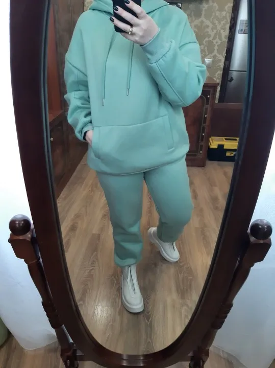 Быстрая доставка. Красивый цвет. На параметры 83 *67 *91 рост 167 вес 51 заказала размер с. Брюки сели хорошо, но достаточно тугая резинка. Толстовка оверсайз. Длинная. Костюм тёплый. Плюш немного лезет.