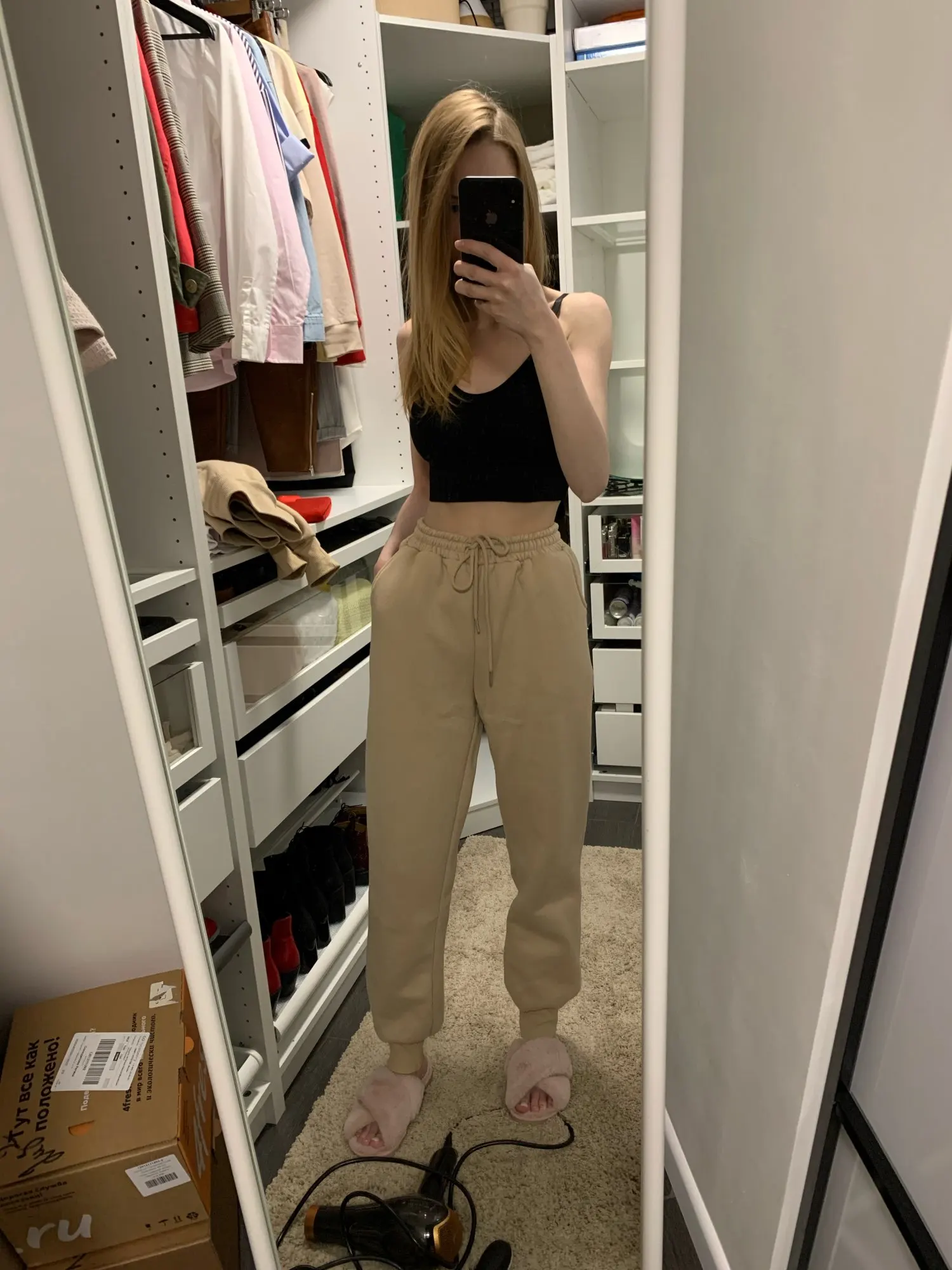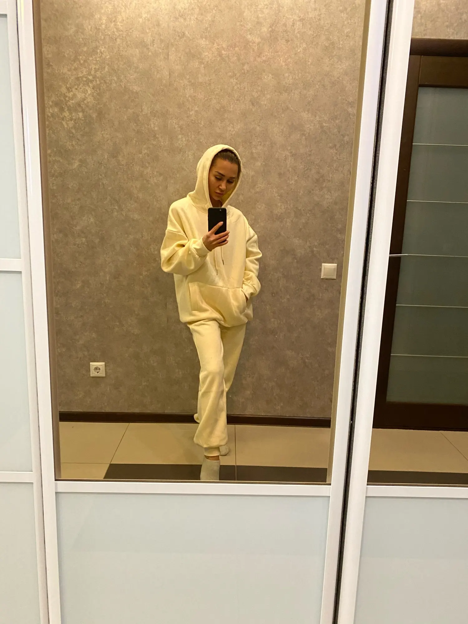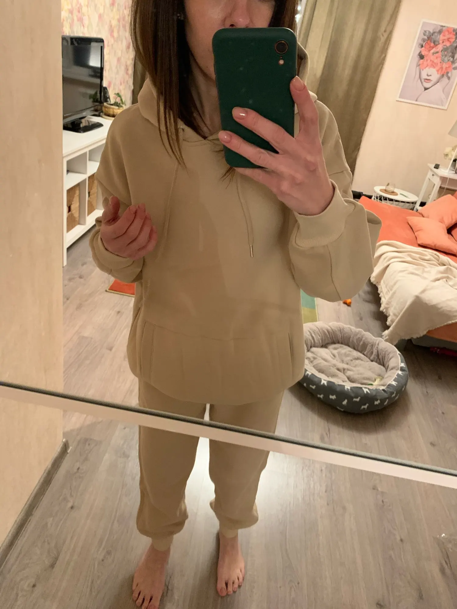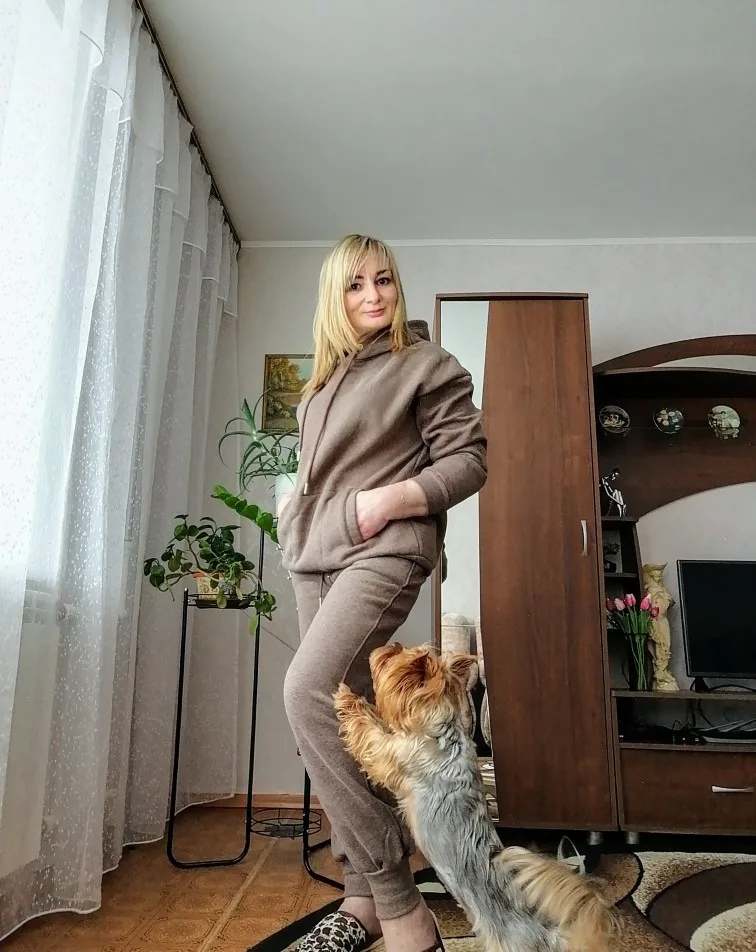 Быстрая доставка. Красивый цвет. На параметры 83 *67 *91 рост 167 вес 51 заказала размер с. Брюки сели хорошо, но достаточно тугая резинка. Толстовка оверсайз. Длинная. Костюм тёплый. Плюш немного лезет.
